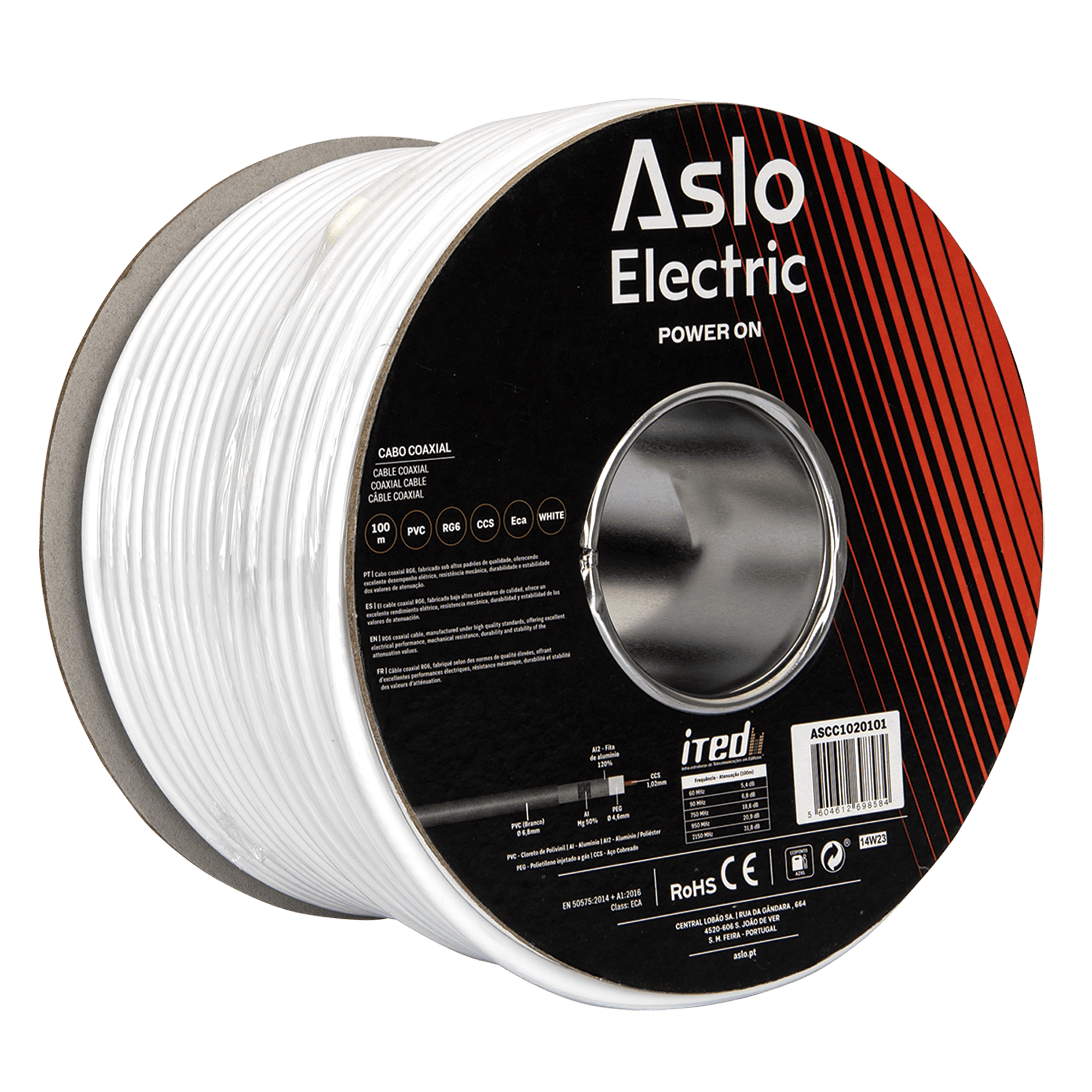 Cabo Coaxial RG6 CCS ASLO (ASCC1020101) fabricado sob altos padrões de qualidade, com um condutor central de aço com 1.02 mm, possui dupla blindagem (folha + malha em alumínio). Este Cabo Coaxial, oferece excelente desempenho elétrico, resistência mecânica, durabilidade e estabilidade dos valores de atenuação. Apropriado para distribuição de sinal de TV, podendo ser aplicado em sistemas de transmissão terrestre e satélite.