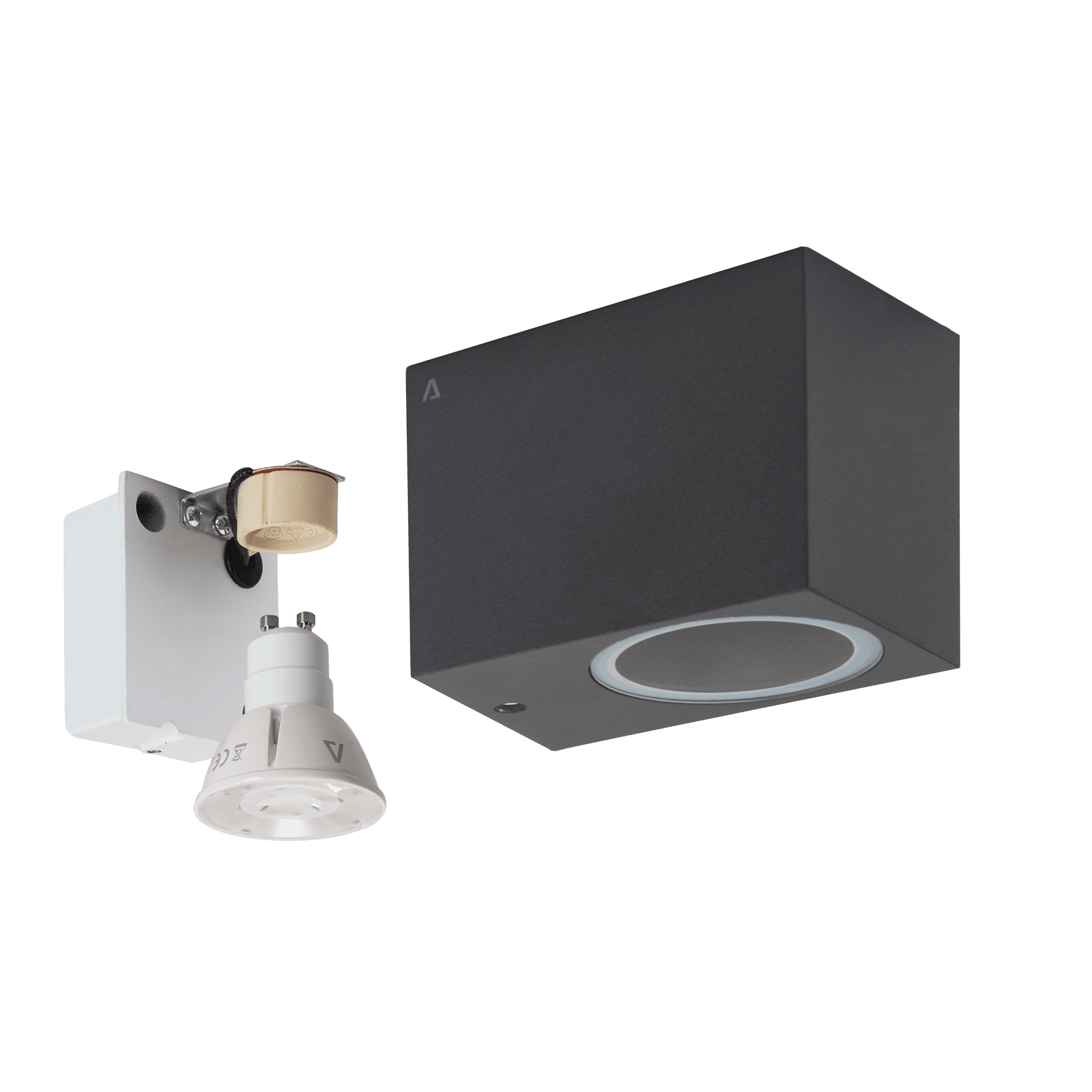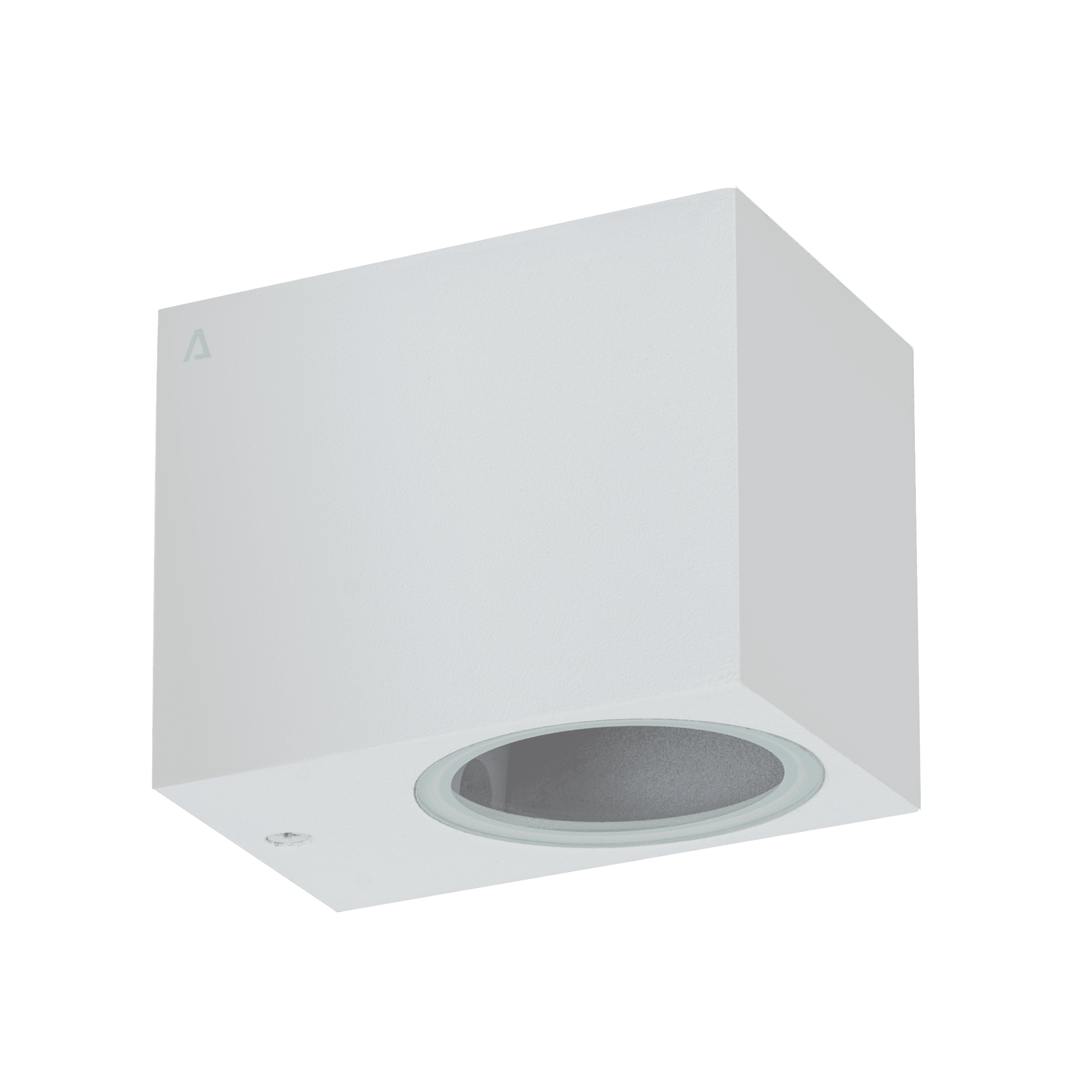 Aplique de parede da série DETAIL-Q, com estrutura em alumínio e difusor em vidro fosco. Concebido para lâmpadas GU10, oferece proteção IP54 e resistência mecânica IK08 (corpo) e IK06 (vidro). Mede 100x78x68 mm e é adequado para instalação em exteriores cobertos. Classe de isolamento I. Lâmpada não incluída.