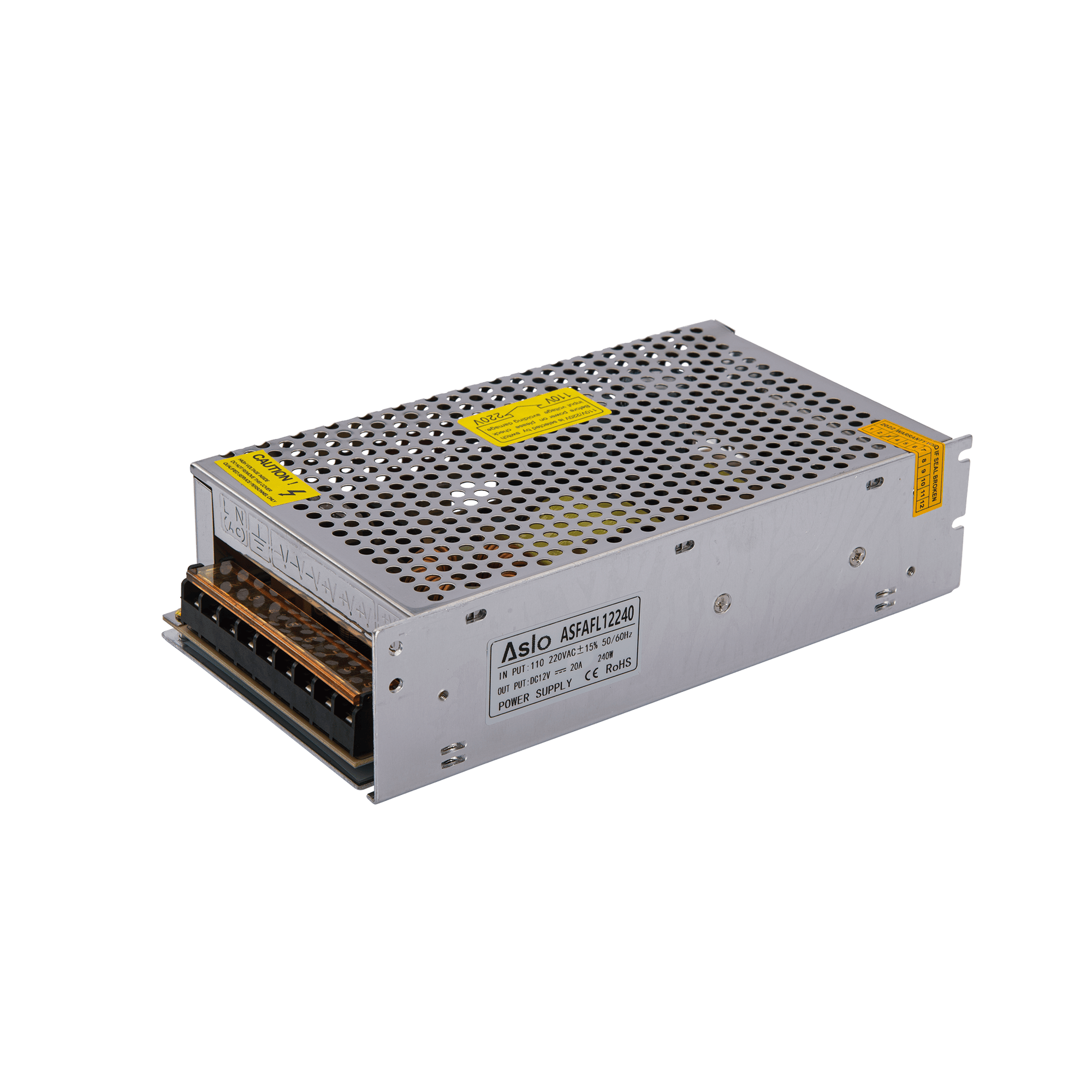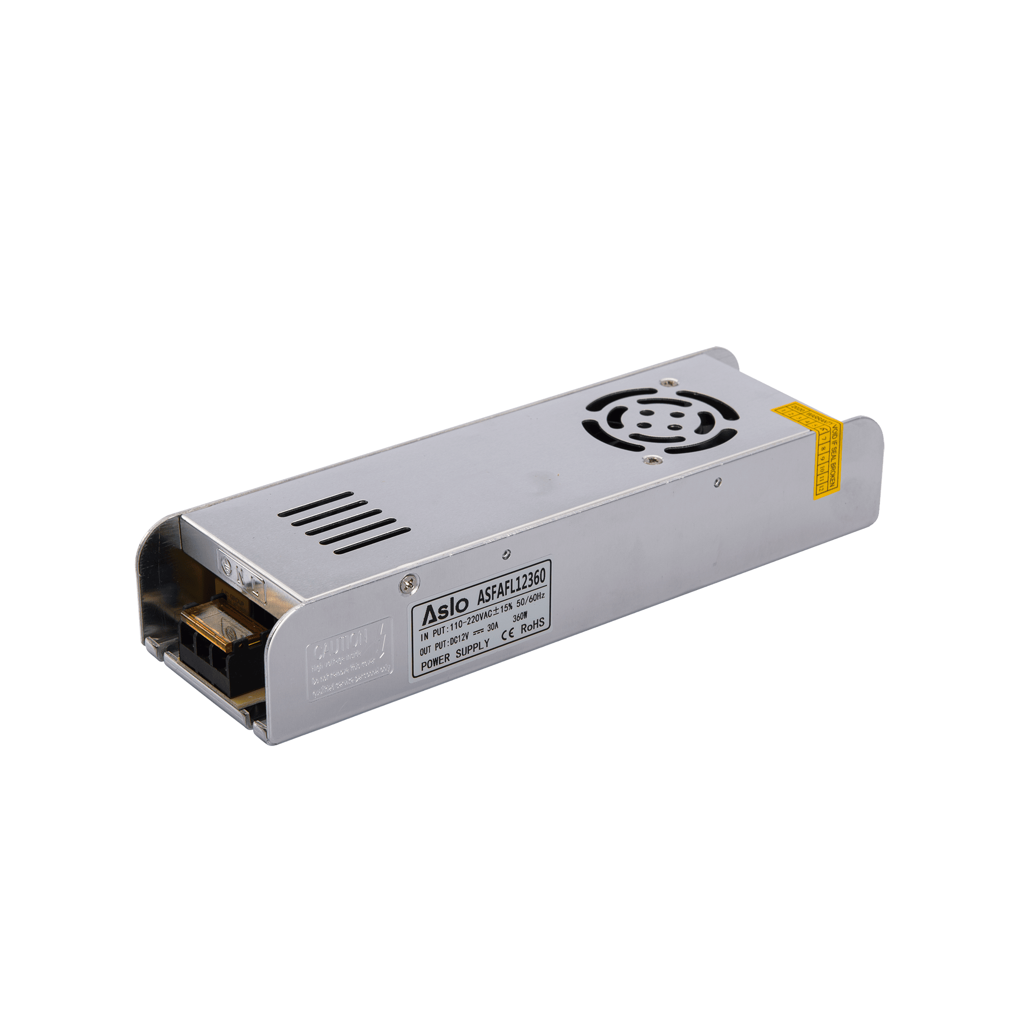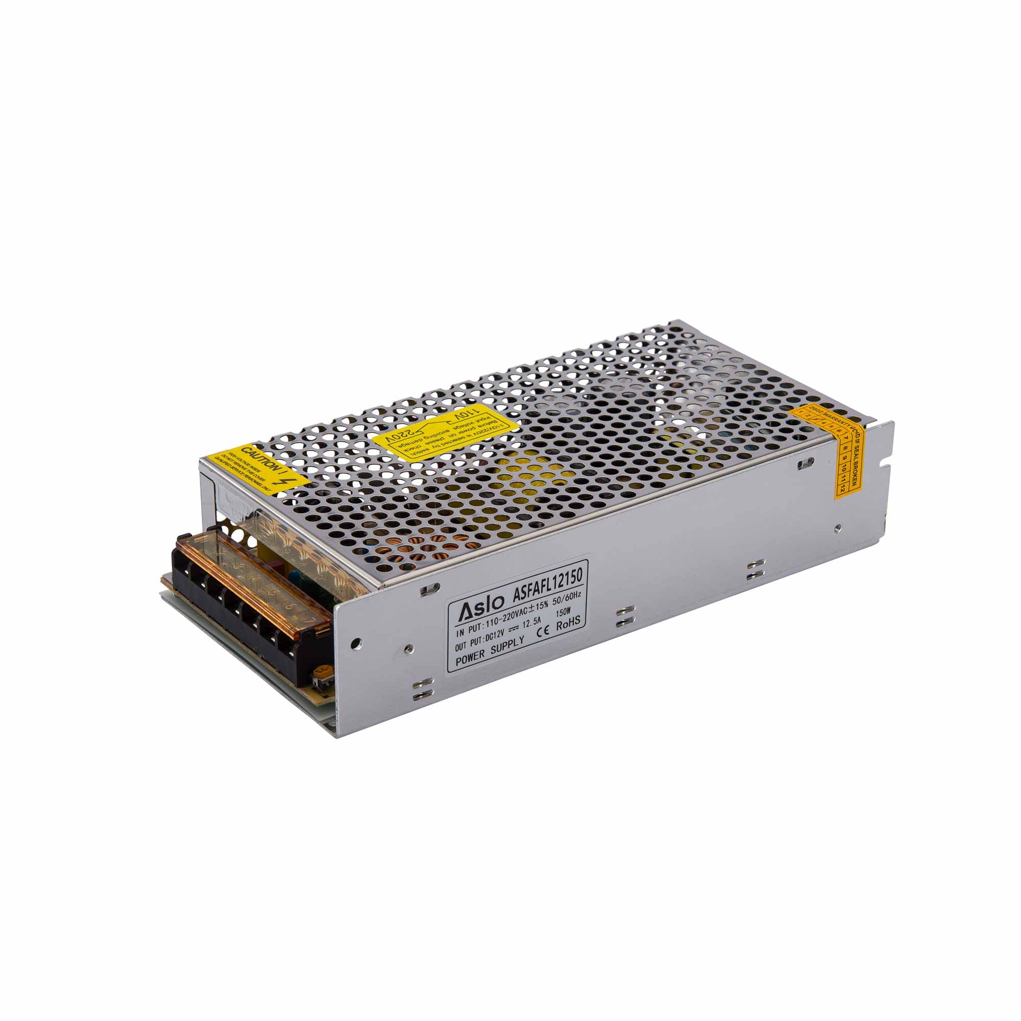 Fonte de alimentação compatível com fitas LED de 12V. Funciona com entrada de 110 a 220V AC e fornece corrente contínua a 12V. Estrutura metálica perfurada para melhor ventilação. Pode ser usada em aplicações interiores simples.