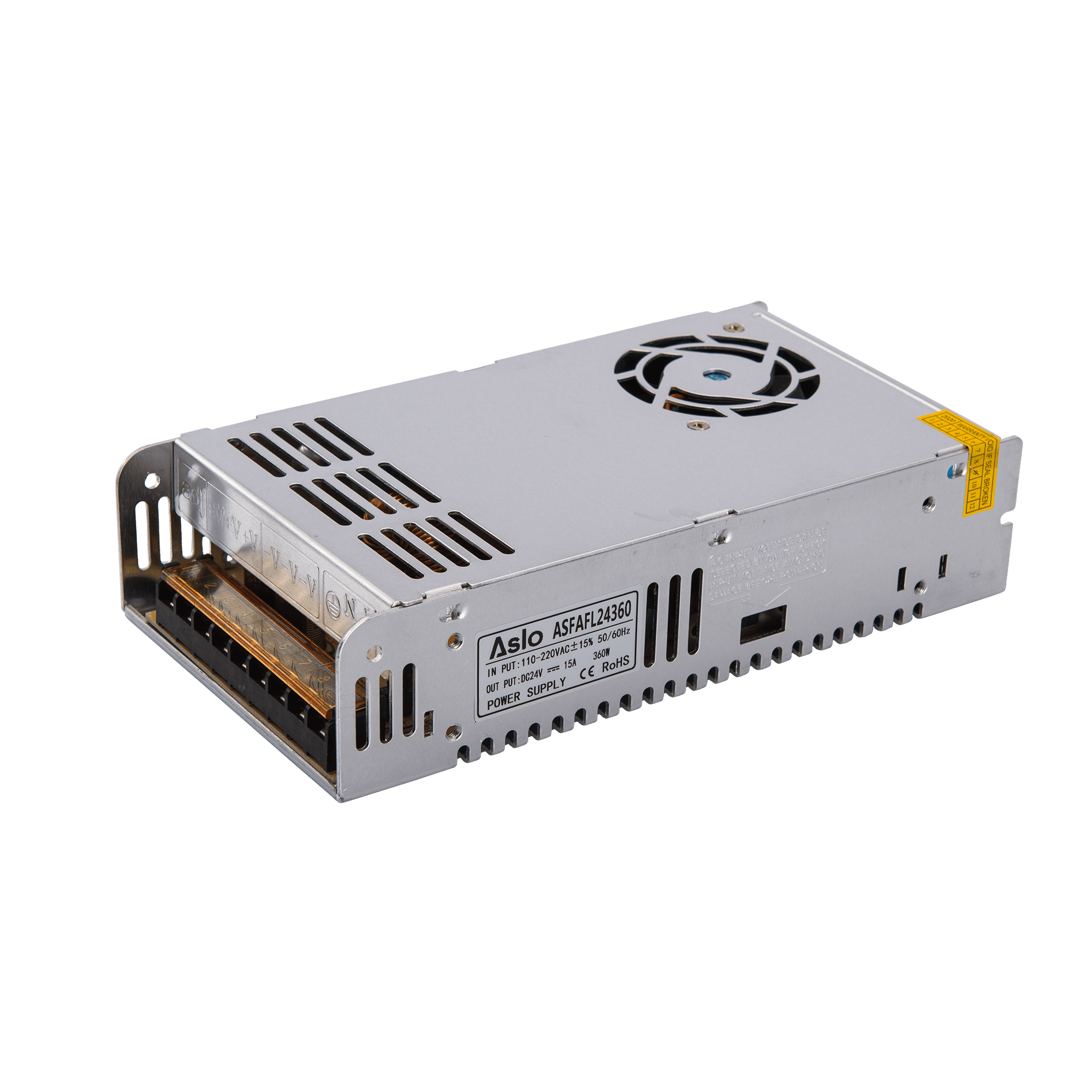 A fonte de alimentação metálica de 360W para fitas LED de 24V garante um fornecimento estável de energia com corrente de saída de 15A. Com estrutura robusta em alumínio e grelha de ventilação, é adequada para aplicações de iluminação exigentes, como instalações comerciais ou decorativas. Compacta e eficiente, mede 215x114x50mm, suportando entrada de 110-220V AC.