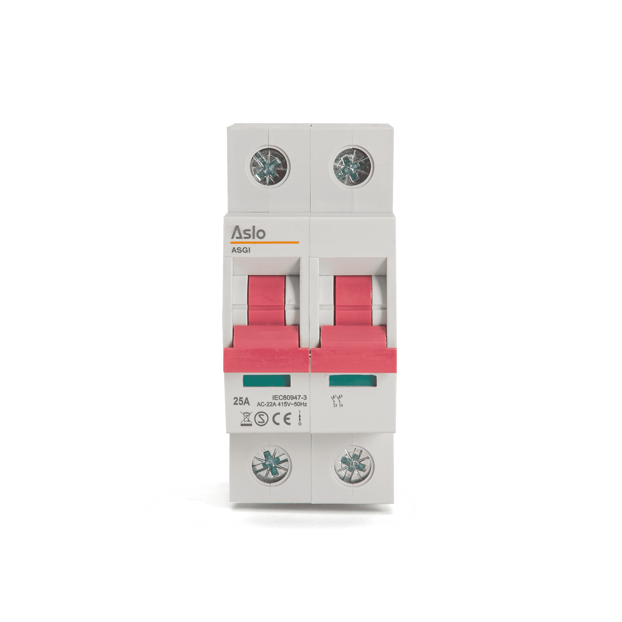 O interruptor de corte bipolar da ASLO é concebido para sistemas até 415 V AC e corrente nominal até 125 A. Utilizado como interruptor principal em equipamentos elétricos, também é adequado para controlo de pequenos circuitos de carga. Garante máxima segurança graças à tensão de isolamento de 690 V, resistência a impulsos transitórios até 6 kV e elevada durabilidade mecânica e elétrica.