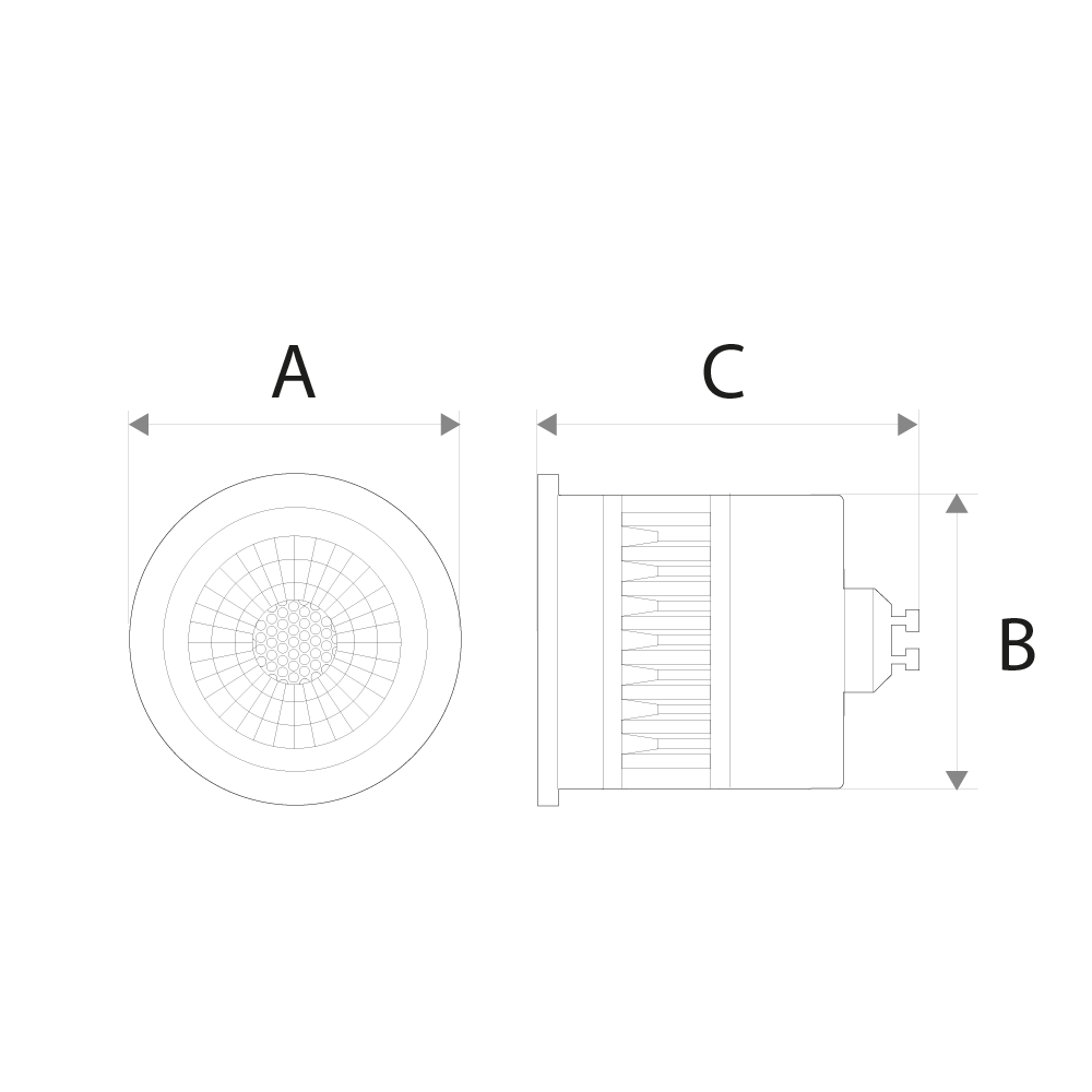 | Dimensões | 50mm (A) x 44mm (B) x 56mm (C) |