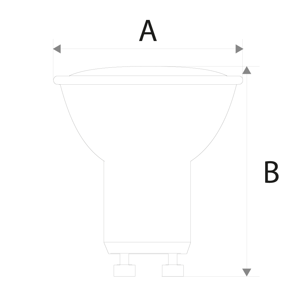 Lâmpada LED não dimável com casquilho GU10, adequada para ambientes interiores secos. Equipada com LED SMD 2835 e ângulo de abertura de 38°, construída com corpo em PVC e casquilho em alumínio. Funciona com tensão de 90–265V e frequência de 50–60Hz. Dimensões: 50mm (diâmetro) x 55mm (altura).