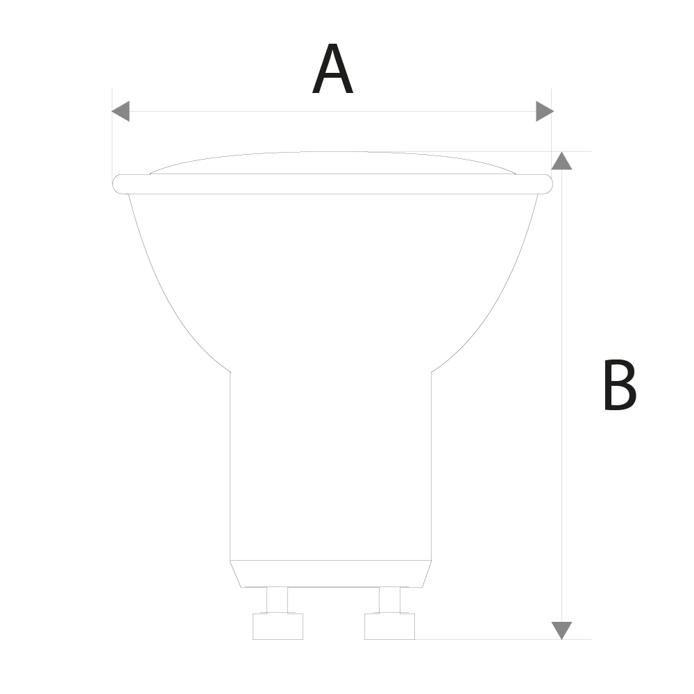 Lâmpada LED não dimável com casquilho GU10, ideal para aplicações interiores secas. Com ângulo de abertura amplo de 103°, tecnologia LED SMD 2835 e estrutura leve em PVC com base em alumínio. Funciona com tensão entre 220–240V e frequência de 50–60Hz. Dimensões: 50mm de diâmetro x 55mm de altura.