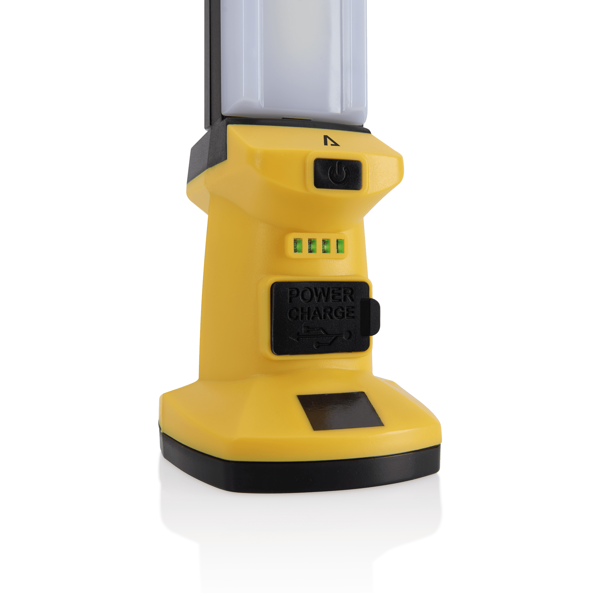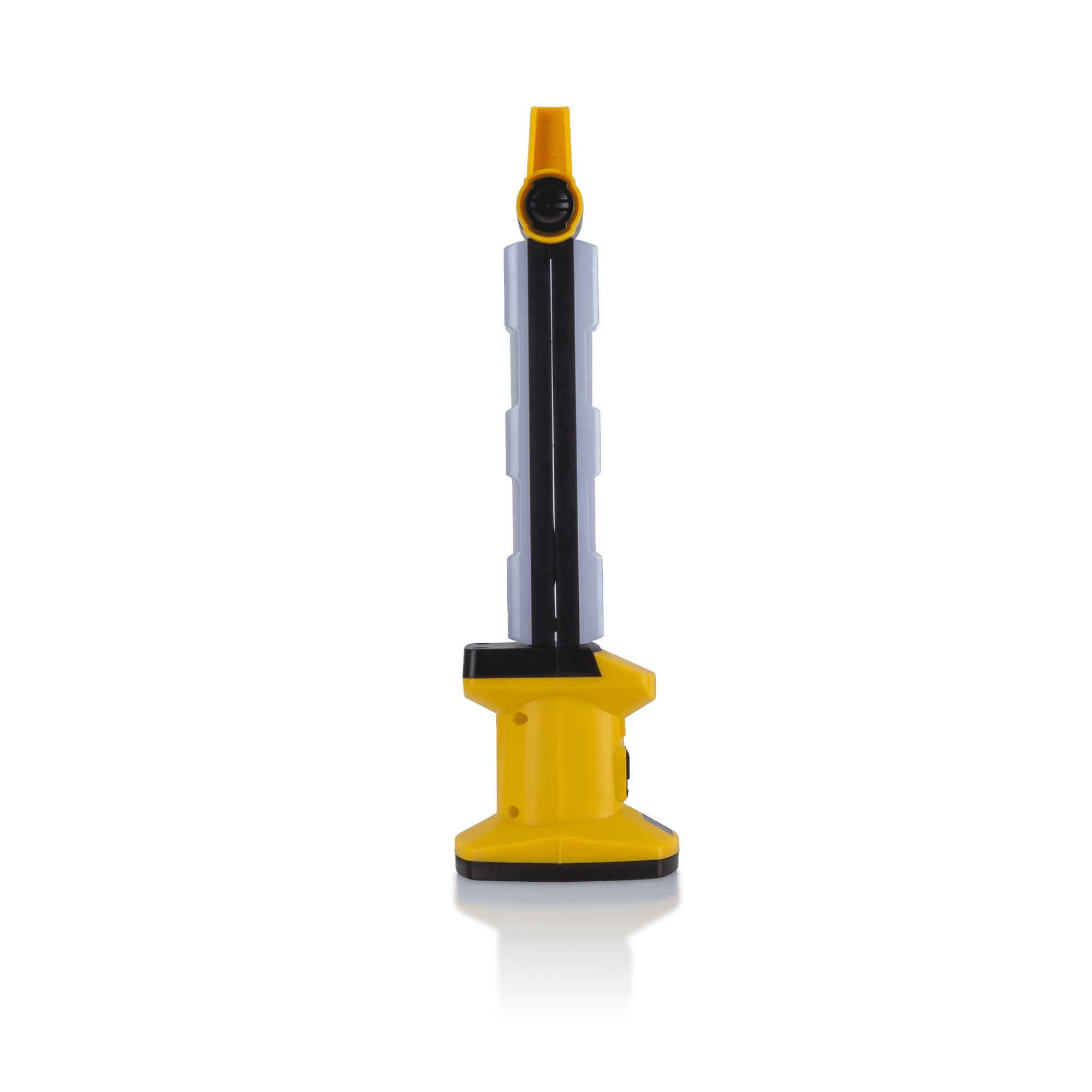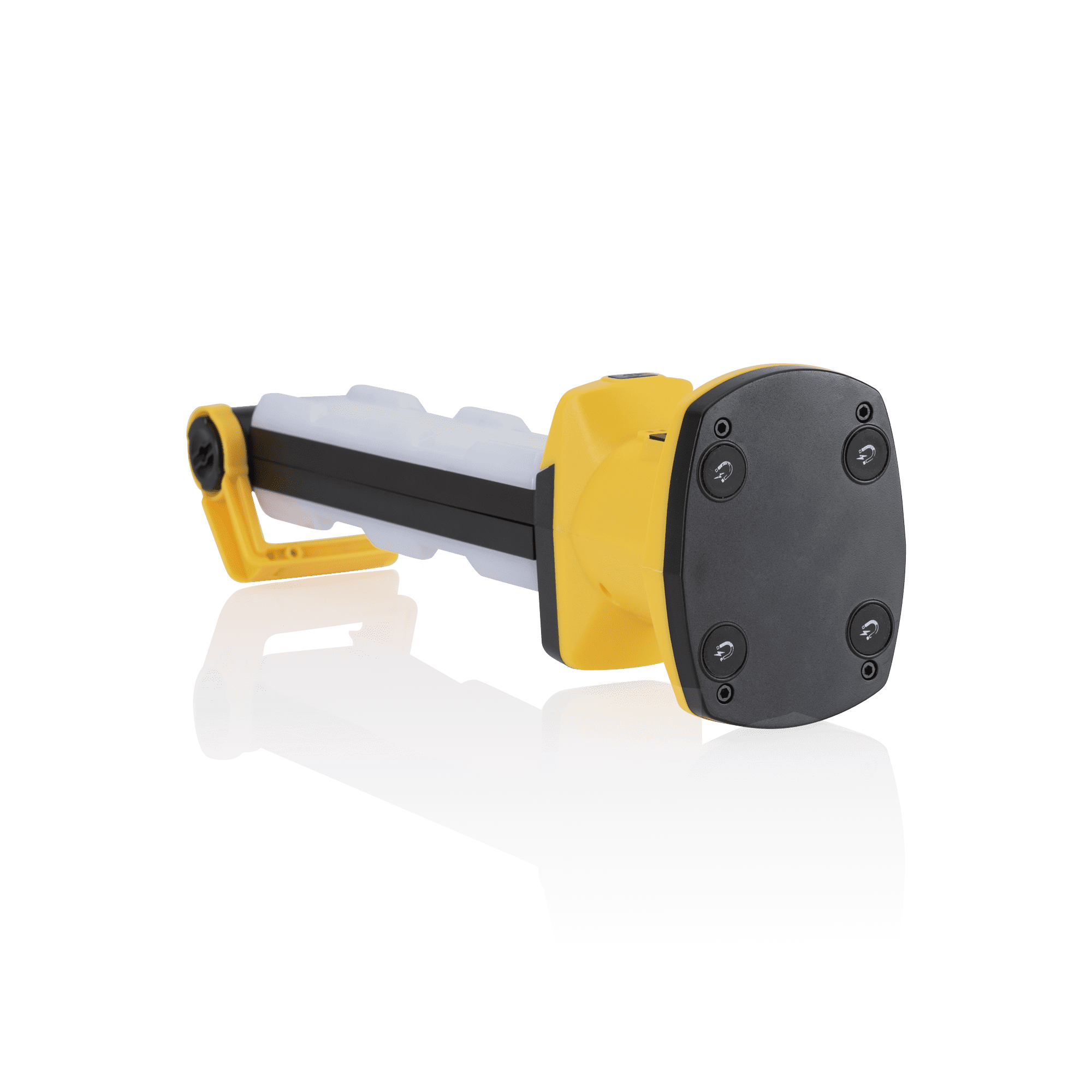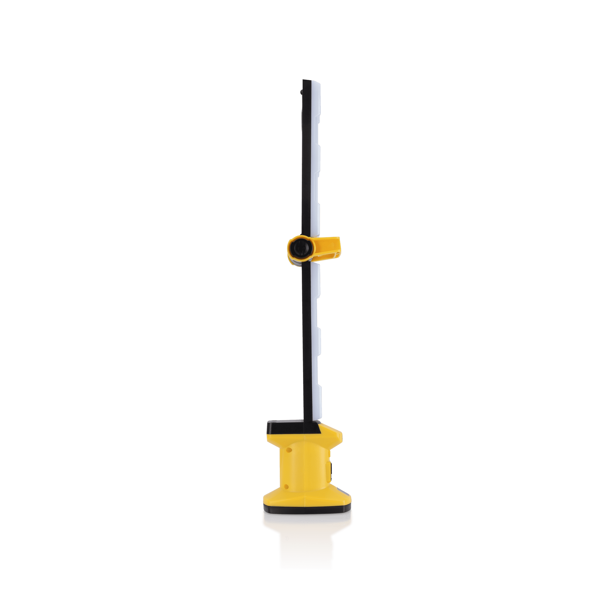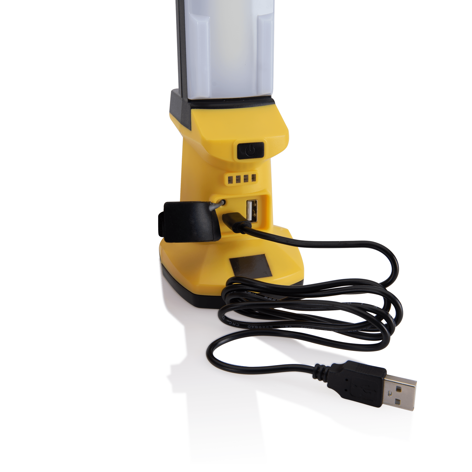 Lanterna vertical com corpo em ABS e base magnética para fixação segura. Oferece iluminação potente e versátil, com ângulo de reflexão ajustável a 180° e autonomia até 17h. Inclui indicador de carga e entrada USB para recarregamento e carregamento de dispositivos. Grau de proteção IP22 (protegida contra gotas e objetos de até 12,5 mm). Para utilização em espaços interiores ou cobertos.
