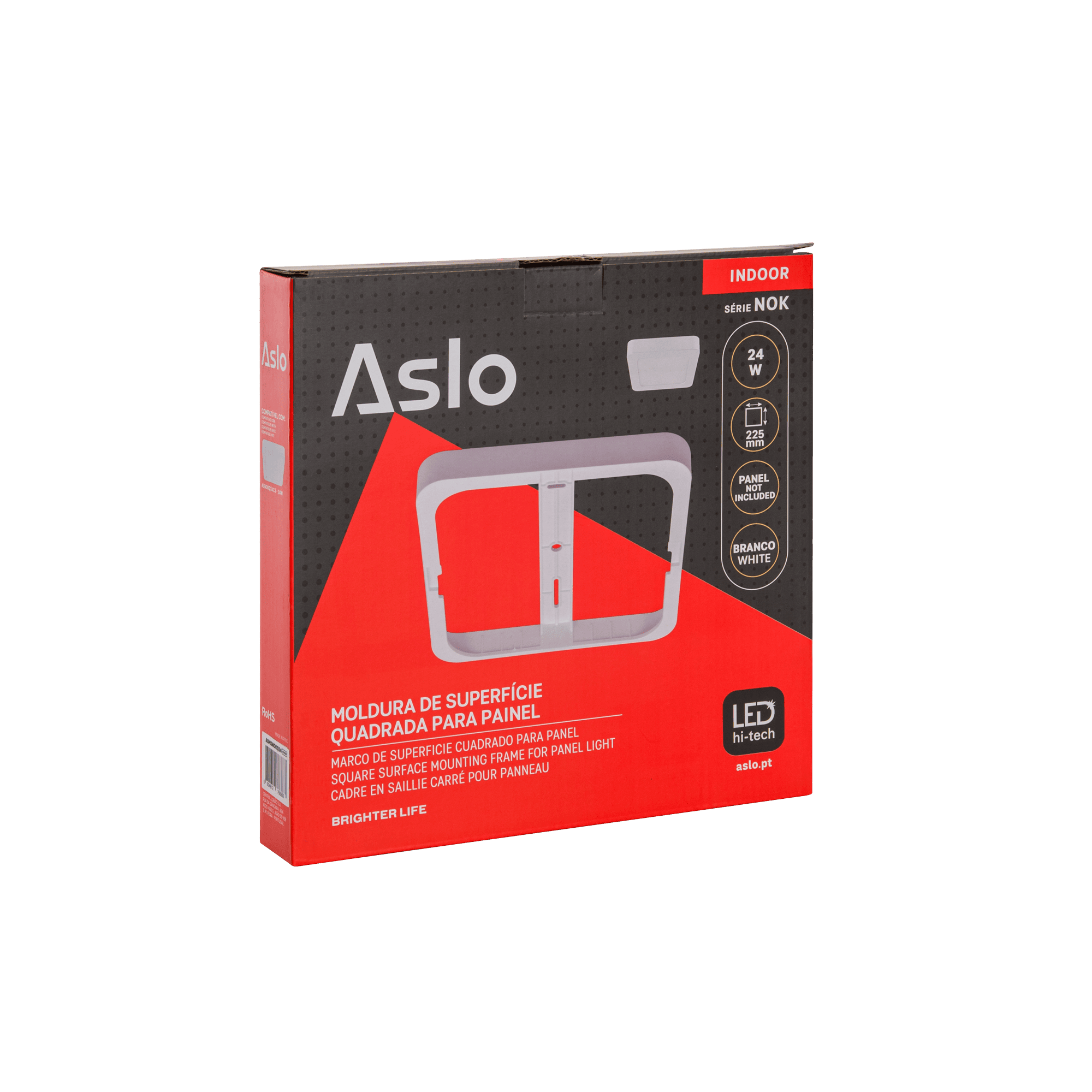 Concebida para permitir a instalação saliente de painéis LED, oferece uma solução simples e funcional que garante um acabamento limpo e organizado. Desta forma, é ideal para espaços interiores, nomeadamente contextos profissionais. Compatível com os painéis LED Quadrados da série NOK da ASLO, esta moldura facilita a adaptação do sistema de iluminação a tetos ou paredes, assegurando uma integração segura e estável. A instalação em superfície permite ainda ter uma maior flexibilidade em projetos de iluminação técnica, reabilitações ou espaços com limitações estruturais. Fabricada em ABS, apresenta uma construção leve e discreta, adequada para ambientes como escritórios, áreas comerciais, zonas técnicas ou residenciais. A possibilidade de montagem em parede ou teto reforça a versatilidade desta solução, tornando-a prática para diferentes aplicações interiores.