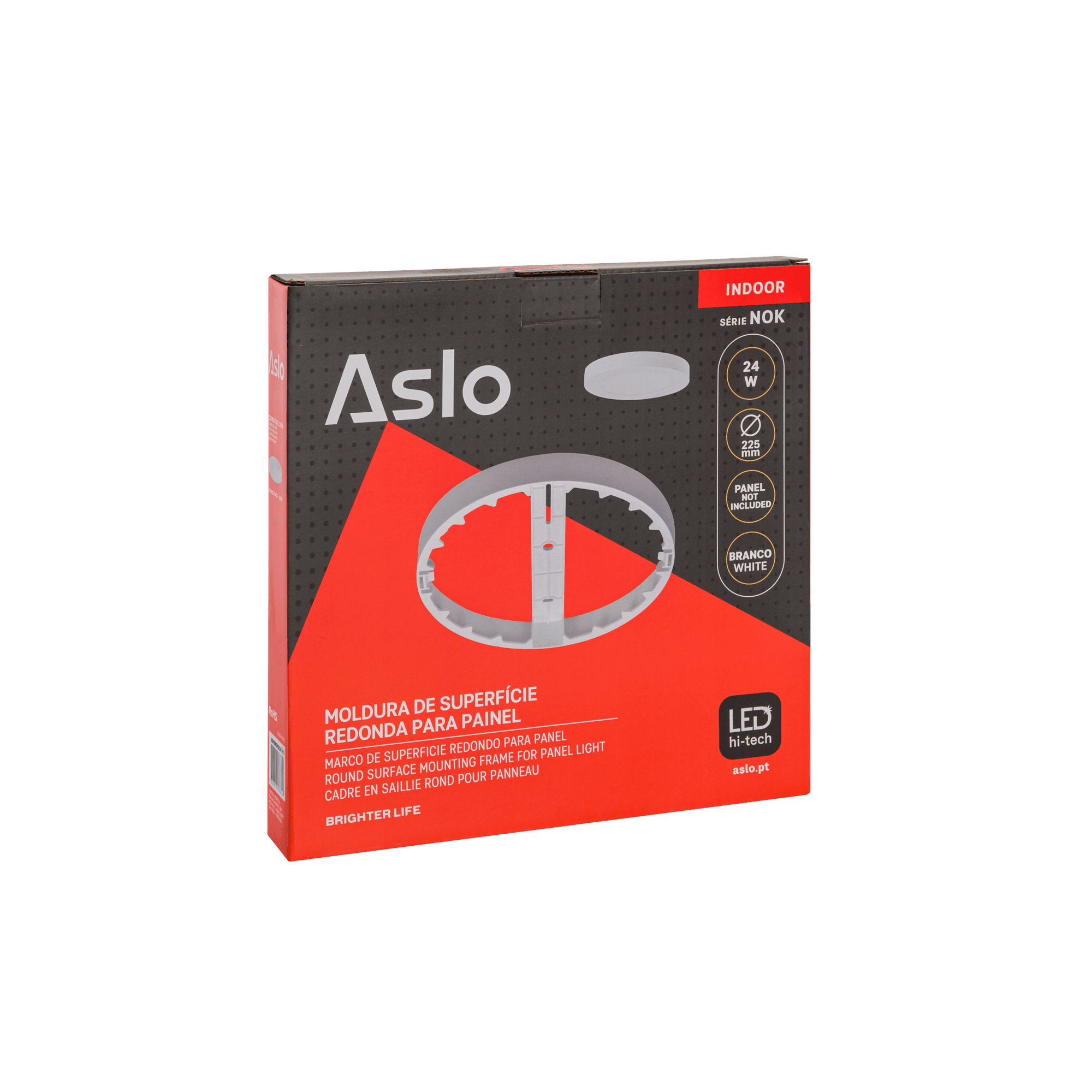 Concebida para permitir a instalação saliente de painéis LED, oferece uma solução simples e funcional que garante um acabamento limpo e organizado. Desta forma, é ideal para espaços interiores, nomeadamente contextos profissionais. Compatível com os painéis LED Redondos da série NOK da ASLO, esta moldura facilita a adaptação do sistema de iluminação a tetos ou paredes, assegurando uma integração segura e estável. A instalação em superfície permite ainda ter uma maior flexibilidade em projetos de iluminação técnica, reabilitações ou espaços com limitações estruturais. Fabricada em ABS, apresenta uma construção leve e discreta, adequada para ambientes como escritórios, áreas comerciais, zonas técnicas ou residenciais. A possibilidade de montagem em parede ou teto reforça a versatilidade desta solução, tornando-a prática para diferentes aplicações interiores.
