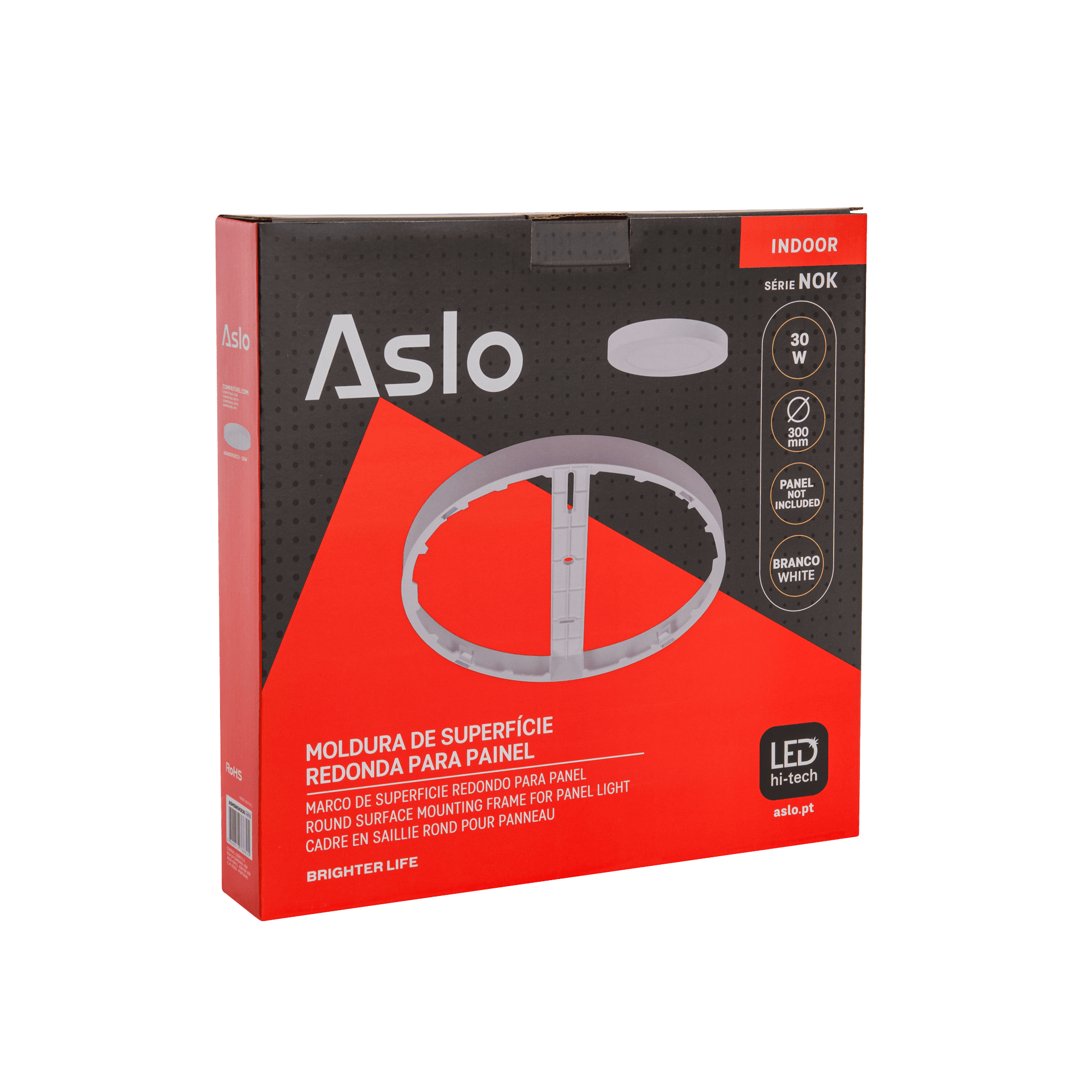 Concebida para permitir a instalação saliente de painéis LED, oferece uma solução simples e funcional que garante um acabamento limpo e organizado. Desta forma, é ideal para espaços interiores, nomeadamente contextos profissionais. Compatível com os painéis LED Redondos da série NOK da ASLO, esta moldura facilita a adaptação do sistema de iluminação a tetos ou paredes, assegurando uma integração segura e estável. A instalação em superfície permite ainda ter uma maior flexibilidade em projetos de iluminação técnica, reabilitações ou espaços com limitações estruturais. Fabricada em ABS, apresenta uma construção leve e discreta, adequada para ambientes como escritórios, áreas comerciais, zonas técnicas ou residenciais. A possibilidade de montagem em parede ou teto reforça a versatilidade desta solução, tornando-a prática para diferentes aplicações interiores.