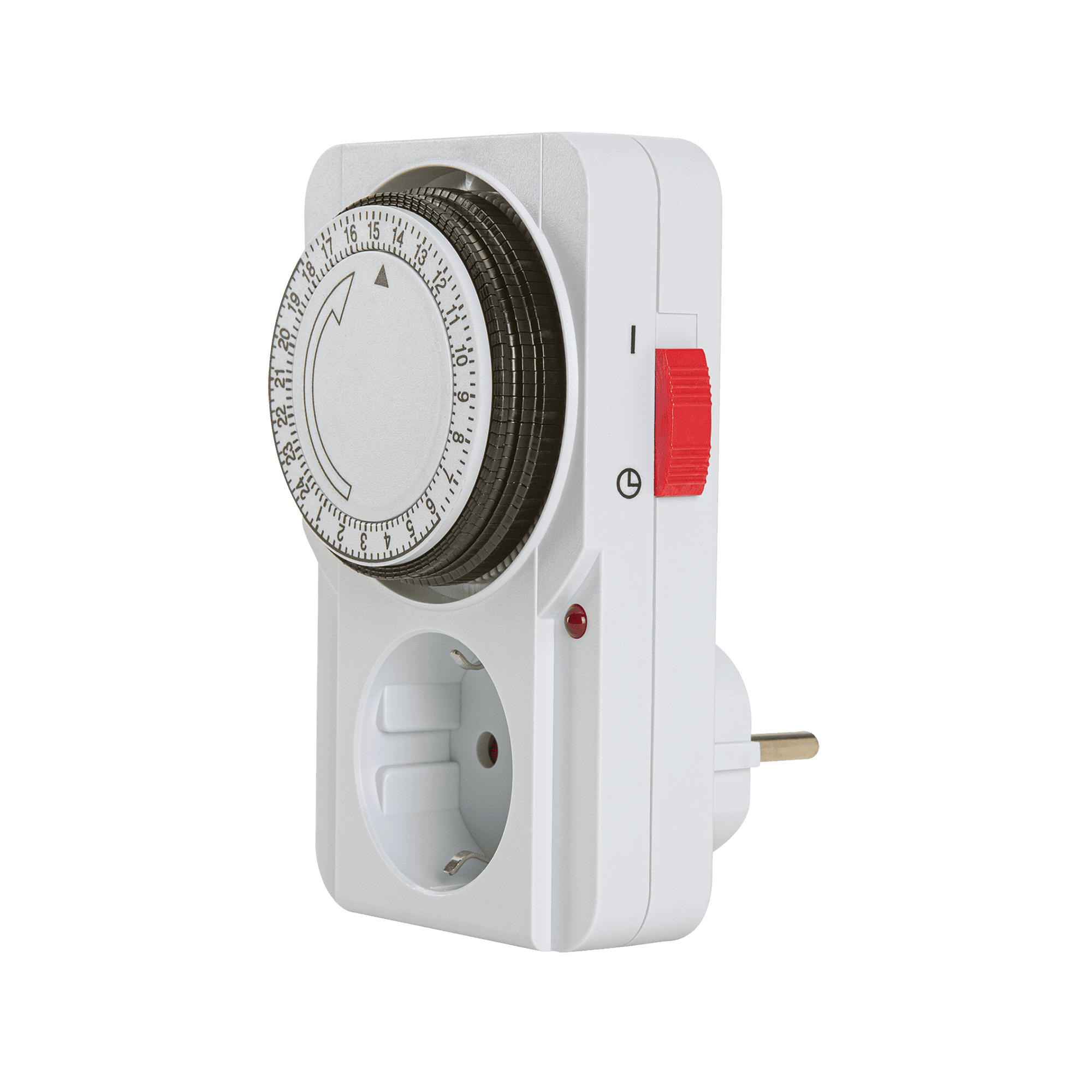 O temporizador horário analógico diário 2P + T é um dispositivo versátil e eficiente, ideal para controlar o funcionamento de aparelhos elétricos em ambientes domésticos e profissionais. Com uma tensão nominal de 230V AC e capacidade para suportar uma corrente de até 16A, este temporizador permite programar ciclos de funcionamento com um período mínimo de 15 minutos e máximo de 24 horas, suportando uma potência máxima de 3680W. Operando numa faixa de temperatura de -10ºC a 55ºC, é adequado para diversas condições ambientais. O dispositivo possui um LED indicador de estado e um interruptor que permite alternar entre modos manual, automático e ligado, oferecendo flexibilidade de uso. Com um índice de proteção IP20, é indicado para uso interno, garantindo segurança com alvéolos protegidos. As suas dimensões compactas de 71 x 120 x 81mm facilitam a instalação em espaços reduzidos. A resistência de isolamento superior a 100 m e a perda inerente inferior a 1W asseguram eficiência energética e durabilidade.