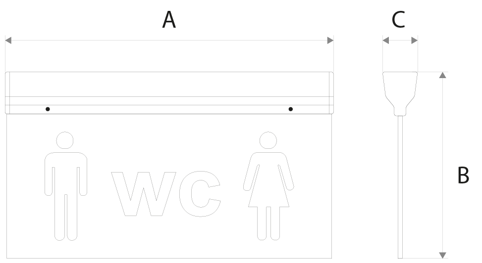 O Painel de sinalização WC 3,5W é uma solução eficiente para identificar instalações sanitárias em espaços públicos ou privados. Fabricado em alumínio e acrílico, opera a 230V AC e oferece autonomia de 3h com iluminação de 19lm. Classe de isolamento I e proteção IP20 para uso em interiores.