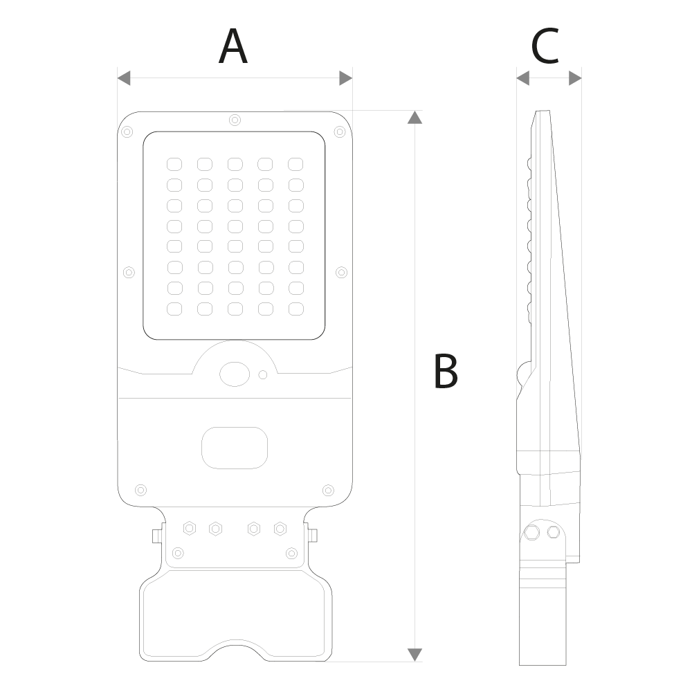 Esta luminária solar foi concebida para espaços exteriores, proporcionando uma iluminação intensa e eficiente com sensor de movimento. Fabricada em ABS com lente em policarbonato e suporte em alumínio, possui índice de proteção IP65, resistente a poeiras e projeções de água. Medindo 232x413x58 mm, é ideal para instalação a 3–5 m de altura e cobre até 105 m². Inclui abraçadeira para fixação em tubo.