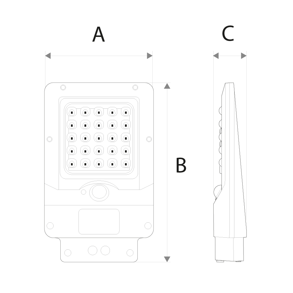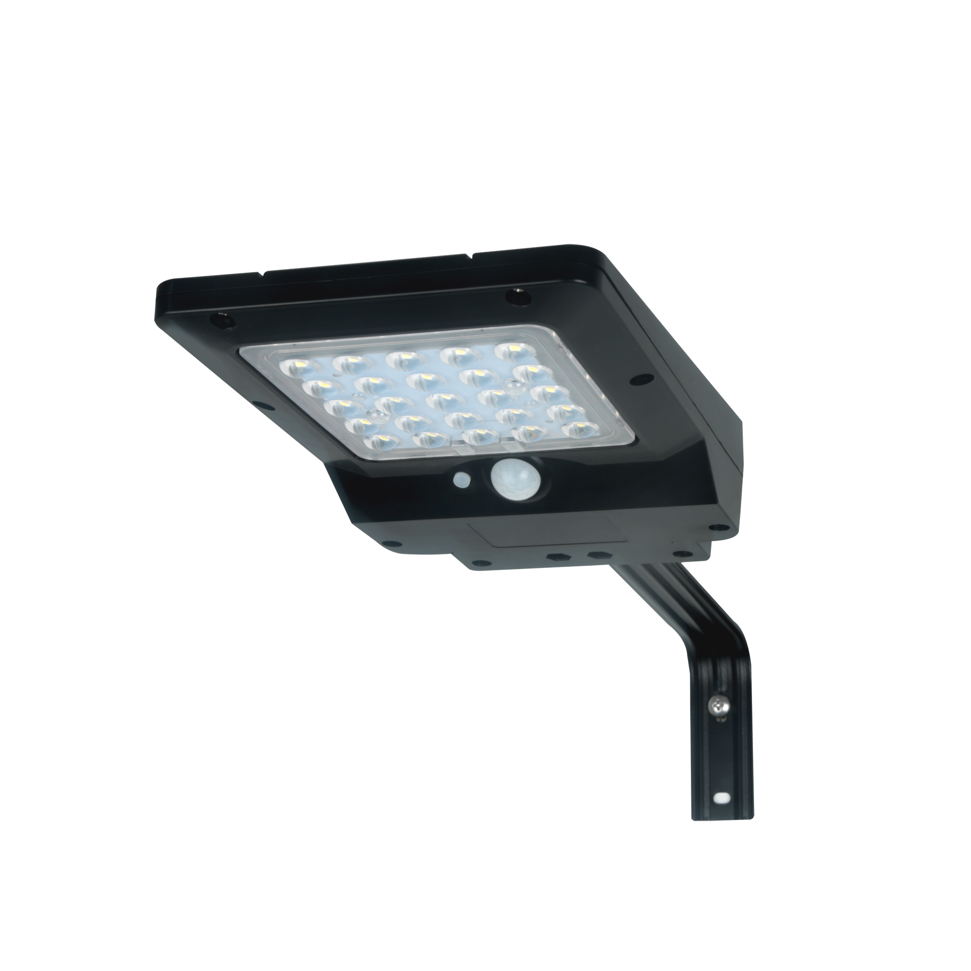 Luminária de rua solar desenvolvida para iluminação exterior eficiente e automática. Com corpo em ABS e lente em policarbonato (PC), apresenta ângulo de abertura de 140×70º e sensor com deteção de até 6m. O painel solar monofacial carrega uma bateria substituível de 2400mAh, garantindo autonomia até 60h. Índice de proteção IP65, que assegura resistência à poeira e jatos de água. Para montagem em parede exterior.