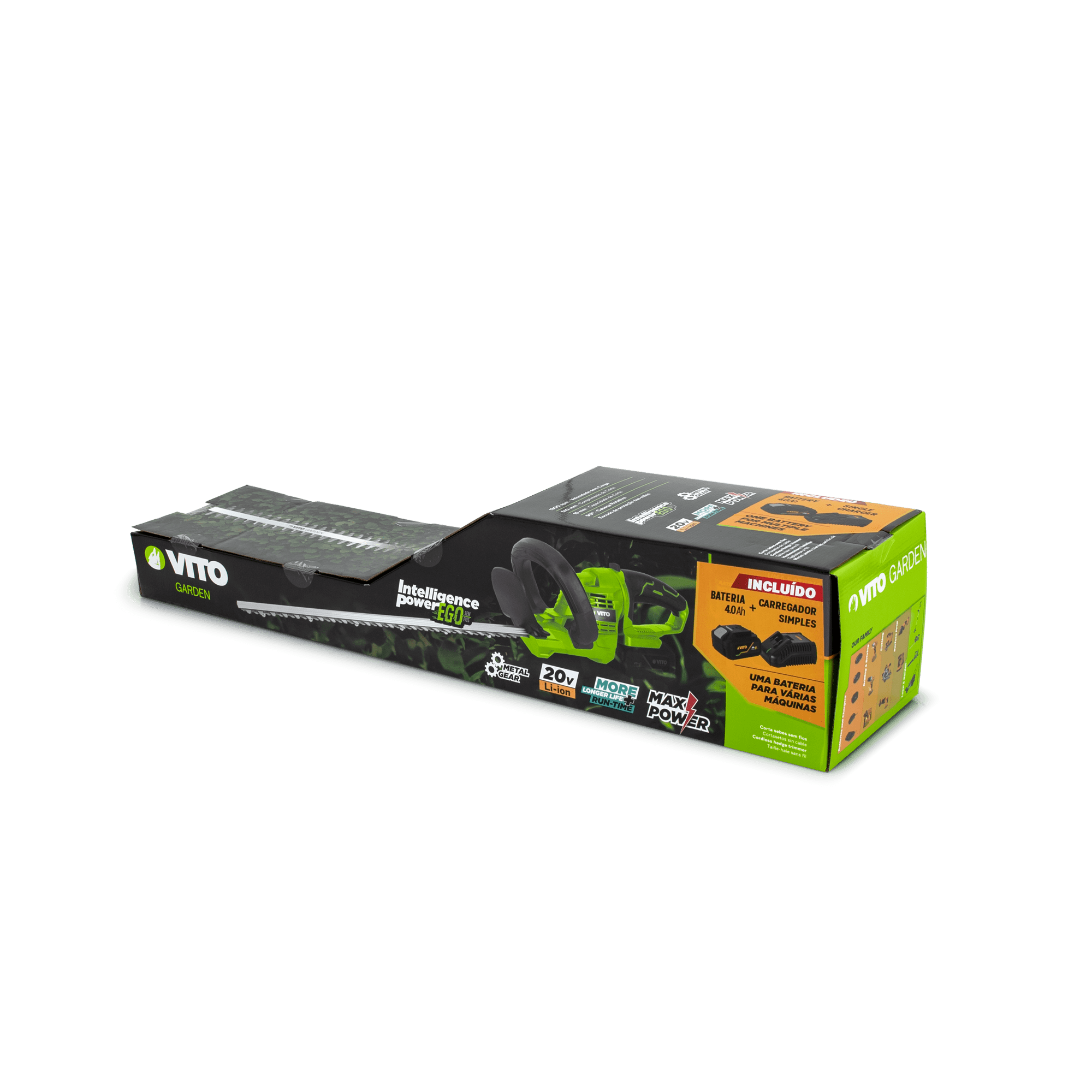 É complementado por uma bateria 20V EGO de 4Ah que garante autonomia prolongada, mesmo em tarefas mais exigentes. O carregador rápido 20V permite carregar as baterias com eficiência.
