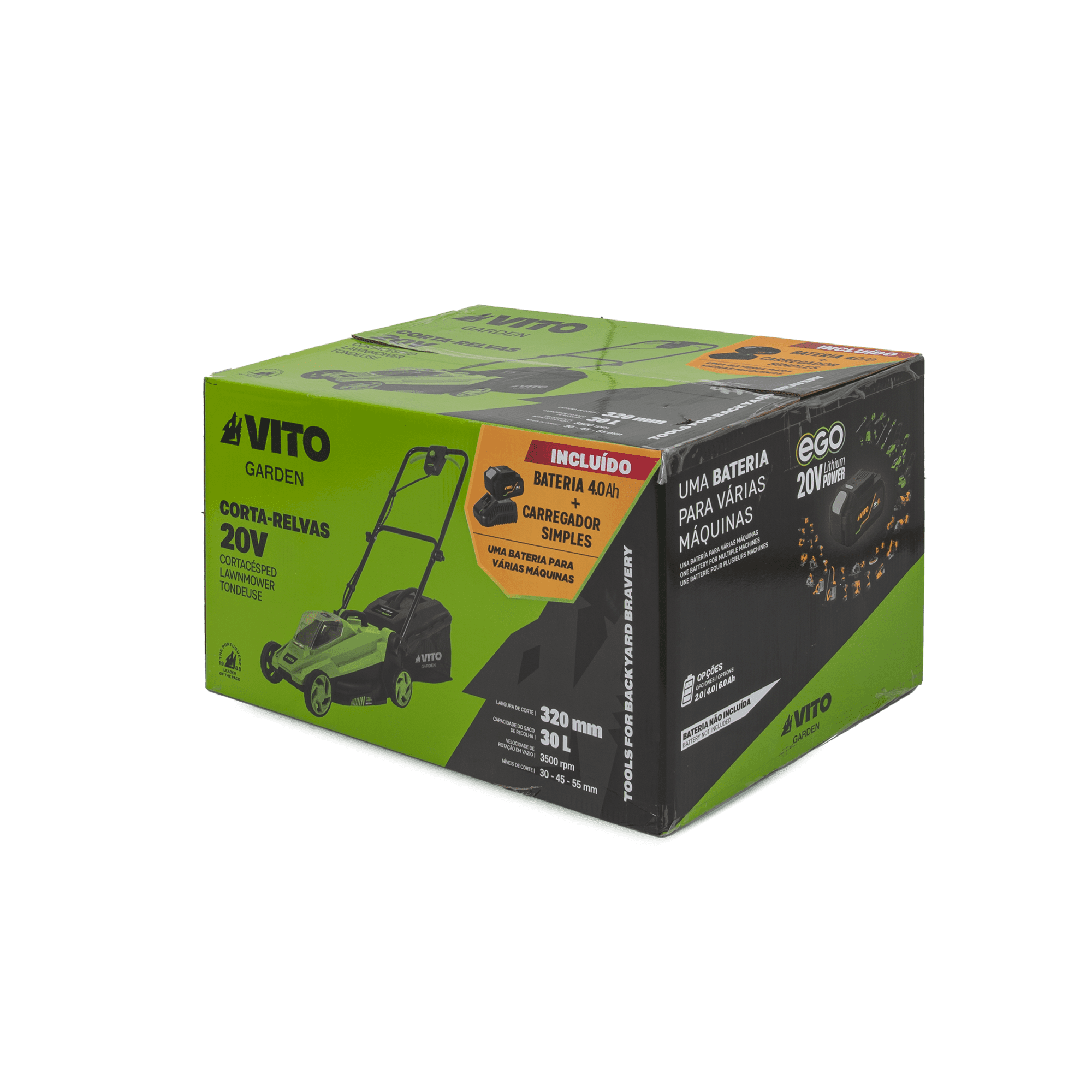 É complementado por uma bateria 20V EGO de 4Ah que garante autonomia prolongada, mesmo em tarefas mais exigentes. O carregador rápido 20V permite carregar as baterias com eficiência.