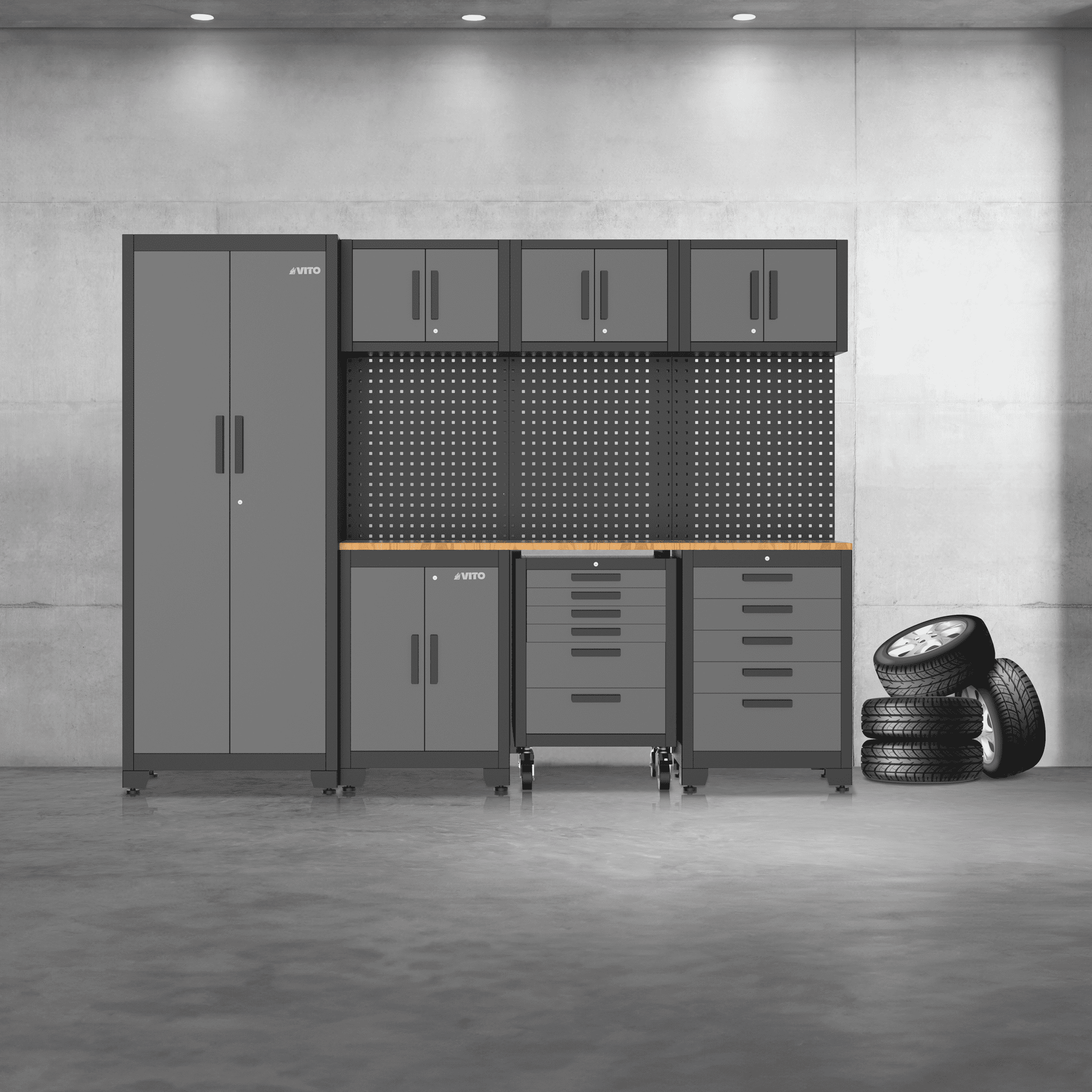 Para uma organização eficiente, pode combinar os módulos COMBO da VITO, otimizando e personalizando a sua garagem conforme as suas necessidades, desde armários de canto a complementos com bancadas de trabalho e espaços de arrumação. Com acabamento lacado, os armários VITO são altamente resistentes a arranhões e manchas, garantindo durabilidade superior. A estrutura soldada proporciona robustez, enquanto as prateleiras ajustáveis em intervalos de 1" permitem personalizar o espaço de armazenamento conforme as suas necessidades. Totalmente trancáveis, estes armários oferecem a segurança ideal para todas as suas ferramentas e objetos. Equipados com fechos magnéticos nas portas e pés ajustáveis, mantêm-se nivelados e estáveis mesmo em pisos irregulares. As ranhuras traseiras facilitam a fixação à parede, prevenindo desníveis e aumentando a segurança. O tampo de madeira de 1" é perfeito para trabalhos manuais, oferecendo uma superfície sólida e resistente para os seus projetos. Esta linha de armários COMBO permite que organize e transforme a sua garagem com estilo e eficiência, sendo a escolha certa para quem procura otimizar o espaço com qualidade e funcionalidade.