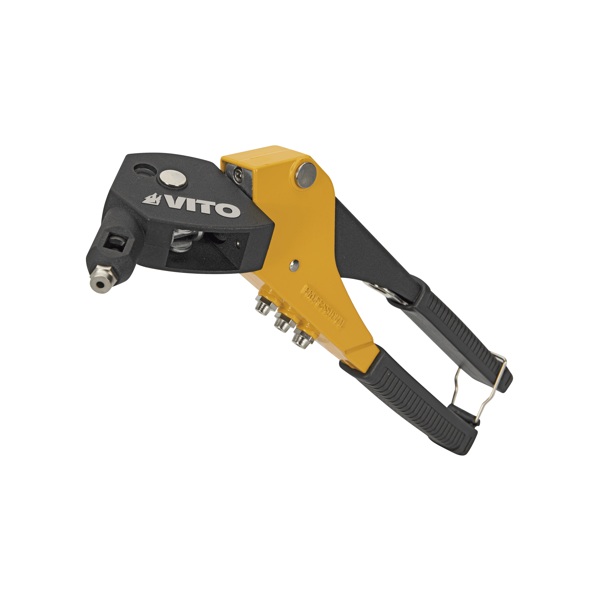 Alicate de Rebitar Cabeça Rotativa com cabeça rotativa 360º, tem uma qualidade profissional, corpo em alumínio lacado, punhos revestidos em borracha, inclui ainda 4 boquilhas: 2.4, 3.2, 4.0, 4.8 mm.