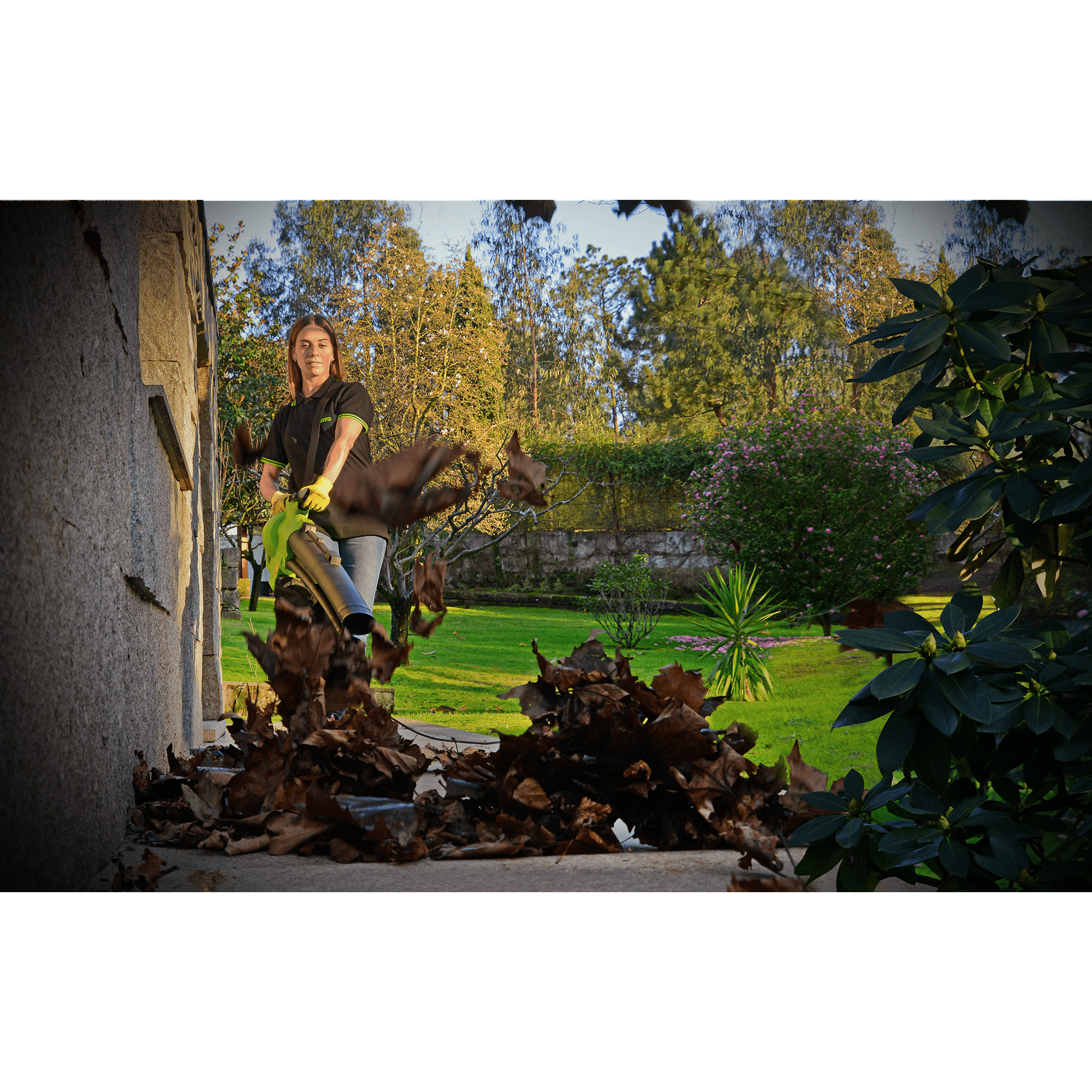 Inclui um saco com uma capacidade de 35L e uma roda frontal que proporciona estabilidade e mobilidade, tornando este equipamento mais fácil de manusear mesmo nos terrenos irregulares.