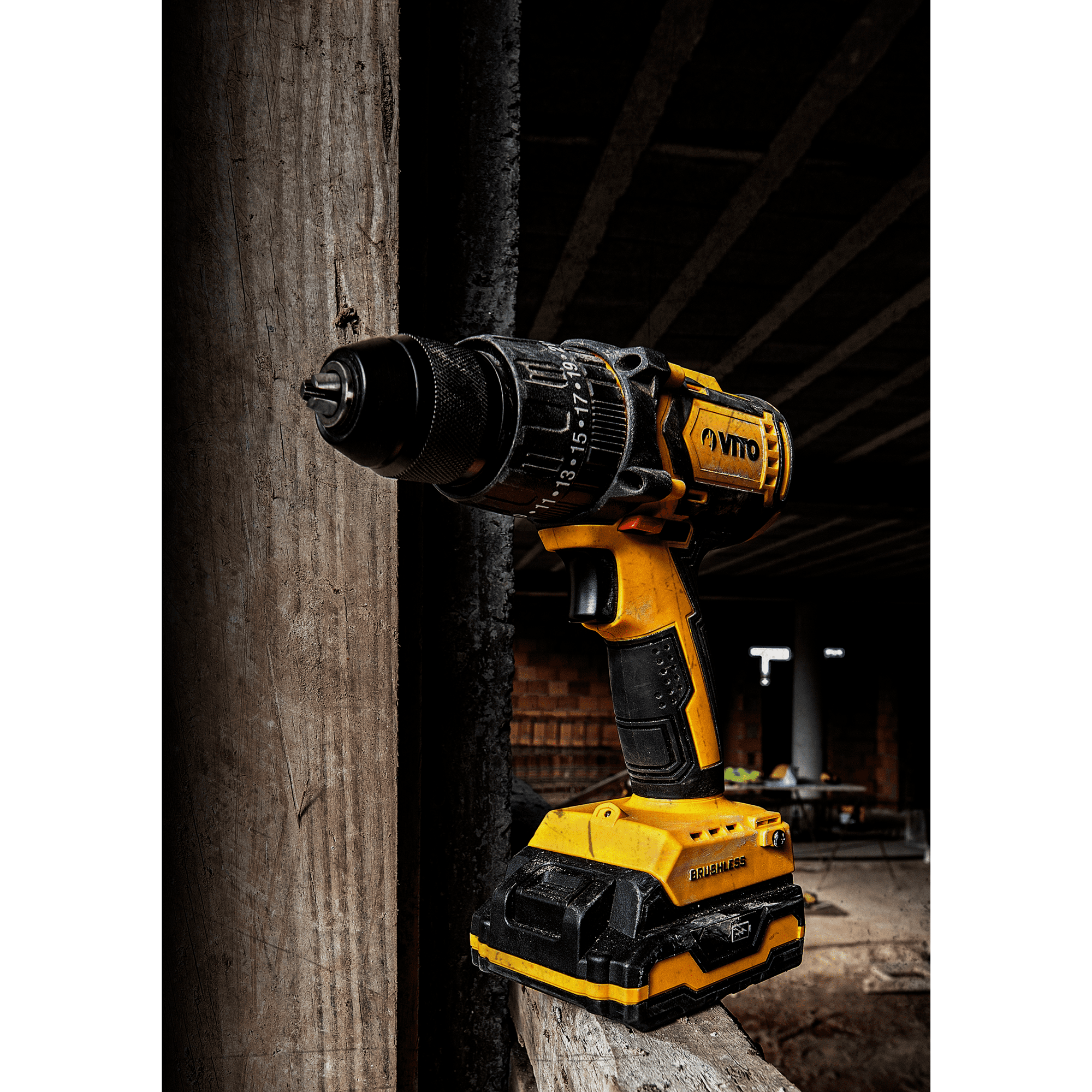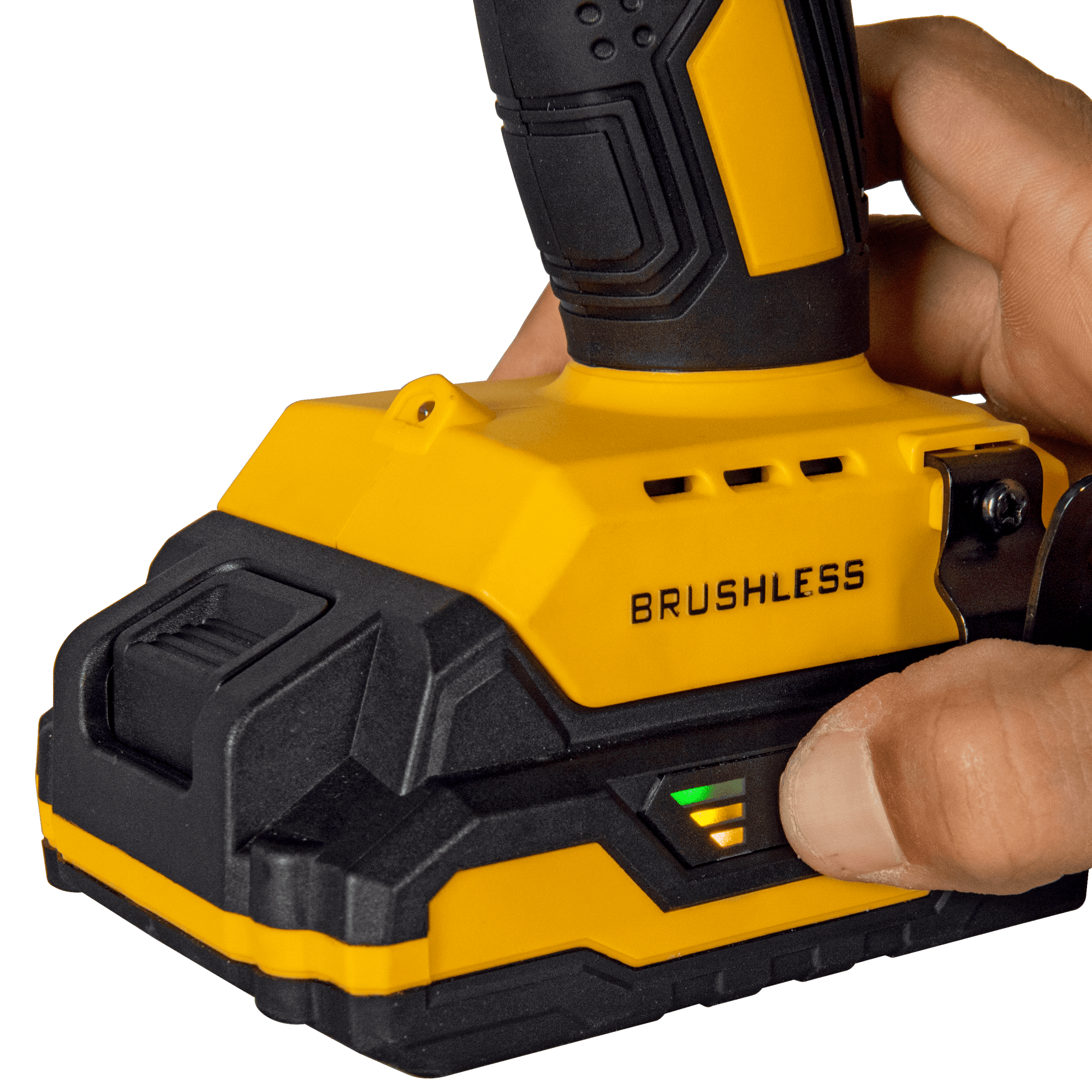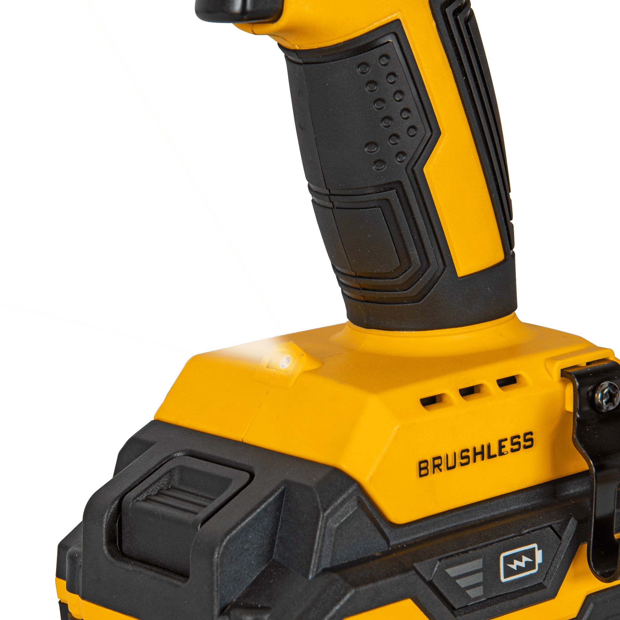 Berbequim sem Fios Brushless com uma tensão nominal de 20V, tem um tempo de carga da bateria de 1h, conta com 2 velocidades, tem uma capacidade da bateria de 2Ah, possui velocidades de rotação em vazio de 0-550 e 0-2000rpm, tem ainda frequências de impacto de 0-9000 e 0-30000bpm, possui um binário máximo de 46Nm, tem uma capacidade da bucha de aperto rápido de 13mm, com uma perfuração em betão de 10mm, aço 13mm e madeira 30mm, contem ainda um nivel de potência sonora de 89,9dB.