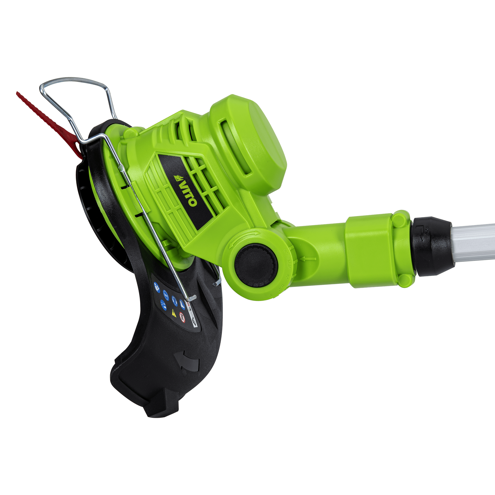 O comprimento ajustável entre 1,12 m e 1,42 m adapta-se à altura do utilizador, enquanto a cabeça rotativa até 90º facilita cortes em ângulo e zonas de difícil acesso. Compatível com a bateria comum 20V da VITO, permite integração com outras ferramentas da mesma gama.