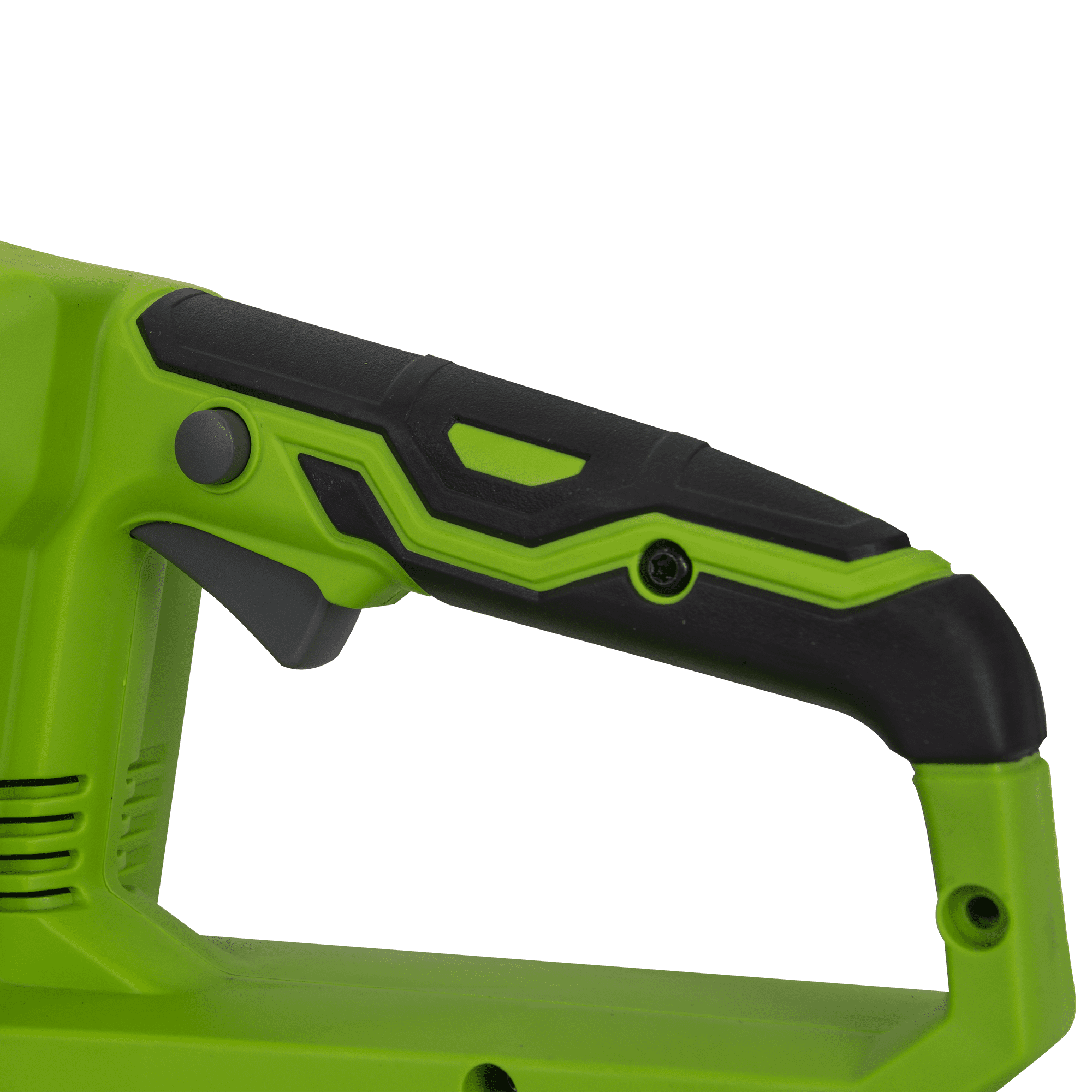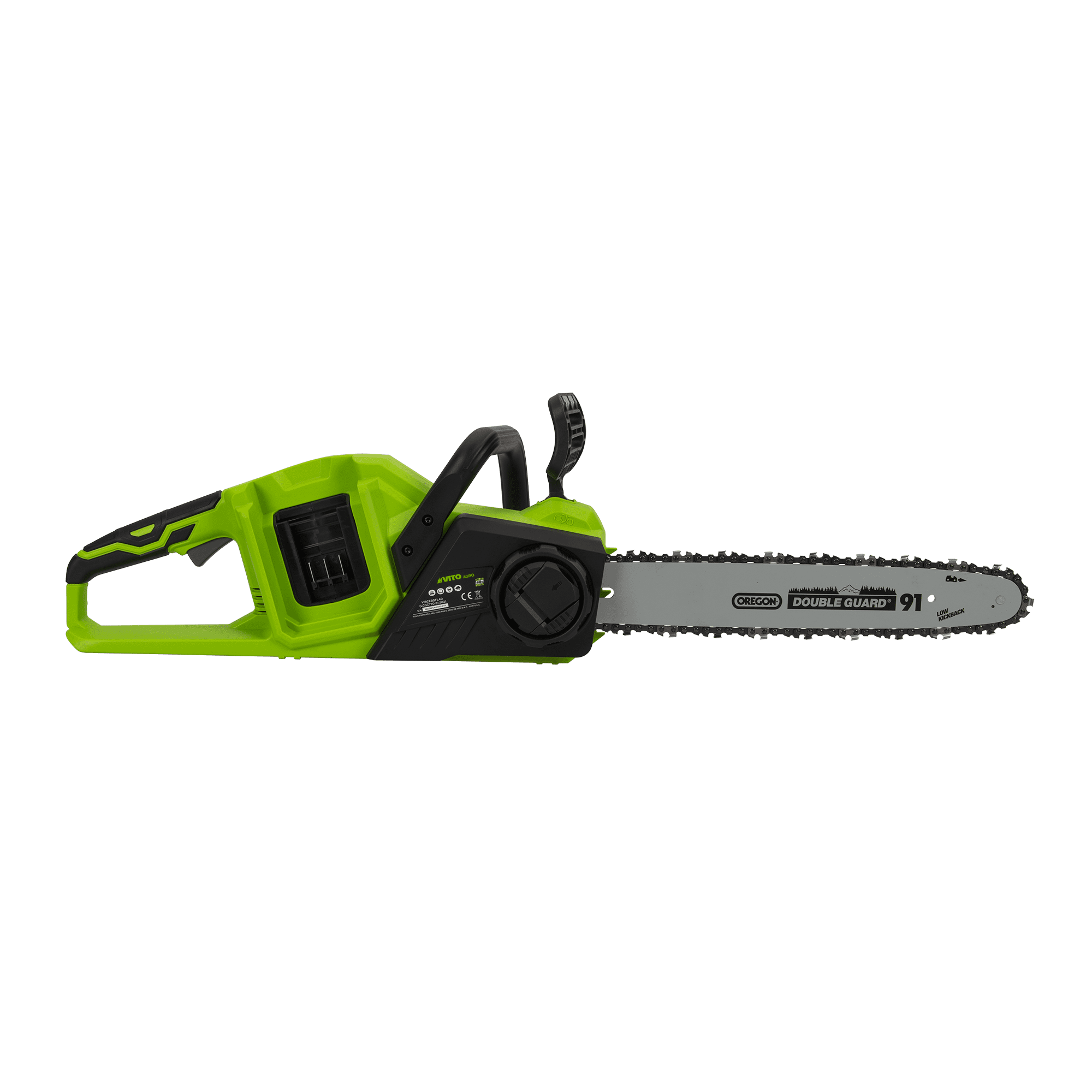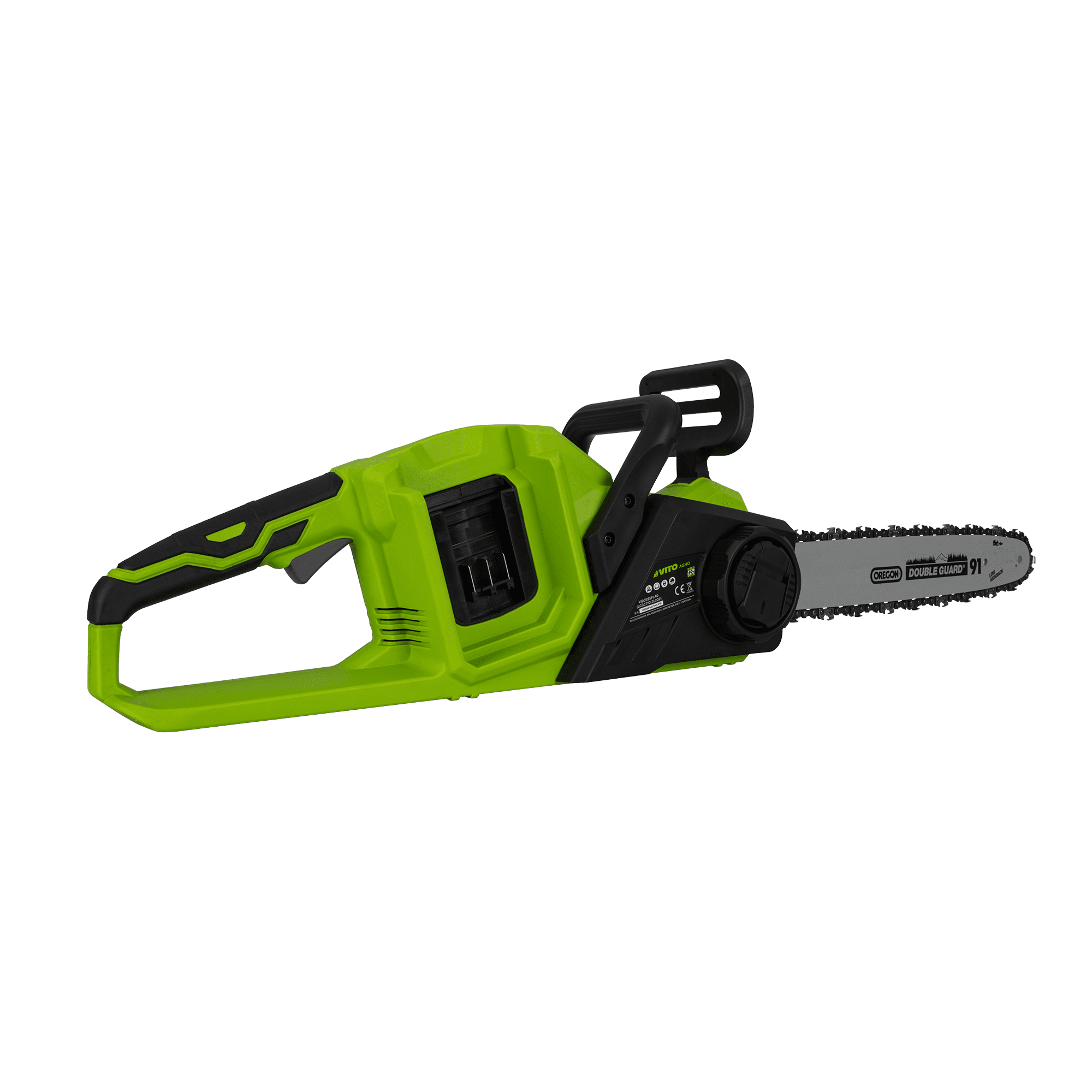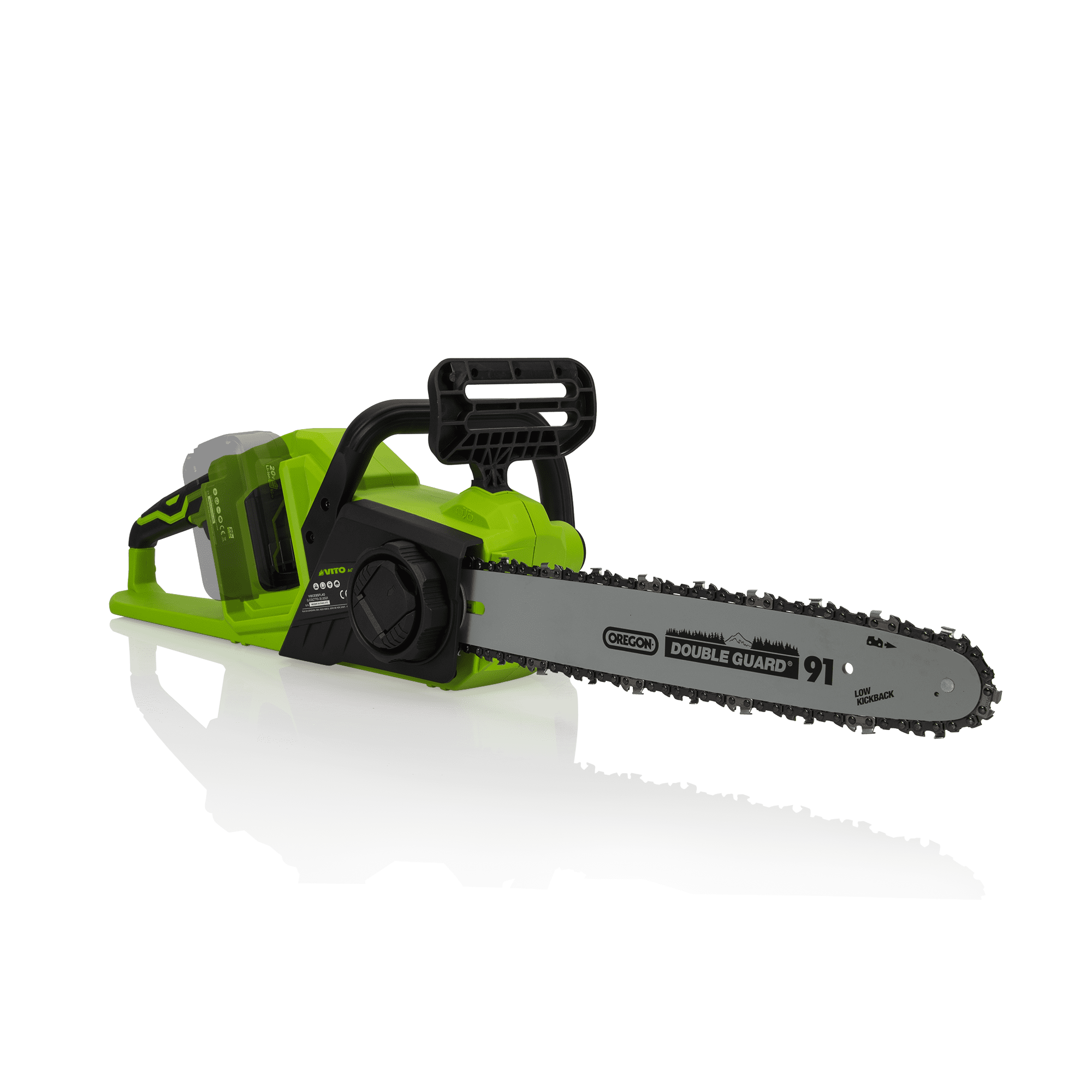 A funcionar com duas baterias de 20V (tensão nominal 40V DC), esta eletrosserra sem fios oferece liberdade total de movimentos. A velocidade da corrente até 19 m/s, o travão eletrónico, o botão de segurança e o sistema de aperto fácil da lâmina tornam esta máquina adequada tanto para utilizadores profissionais como para trabalhos de manutenção doméstica.