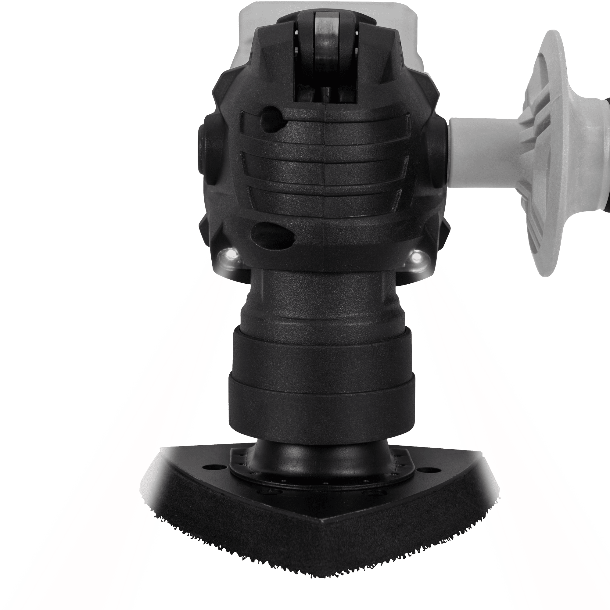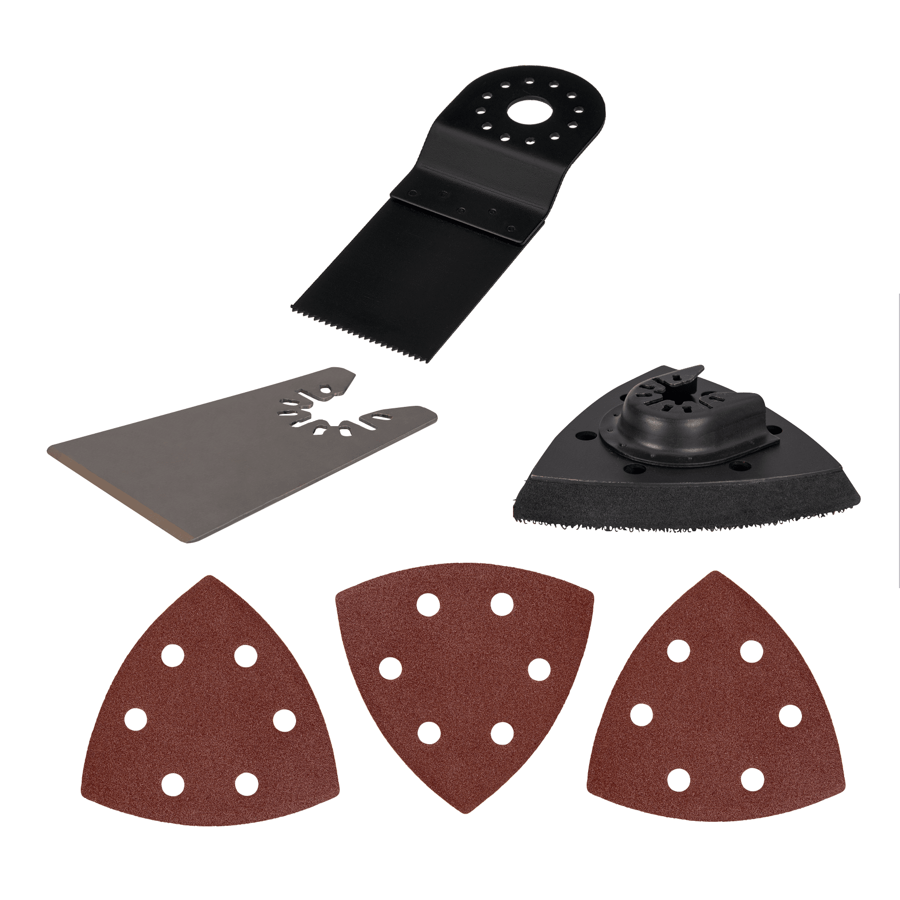 O sistema de substituição rápida de acessórios facilita a troca entre lâmina de corte, espátula metálica, base triangular e lixas, aumentando a produtividade. A fixação das lixas por velcro permite mudanças rápidas e seguras.