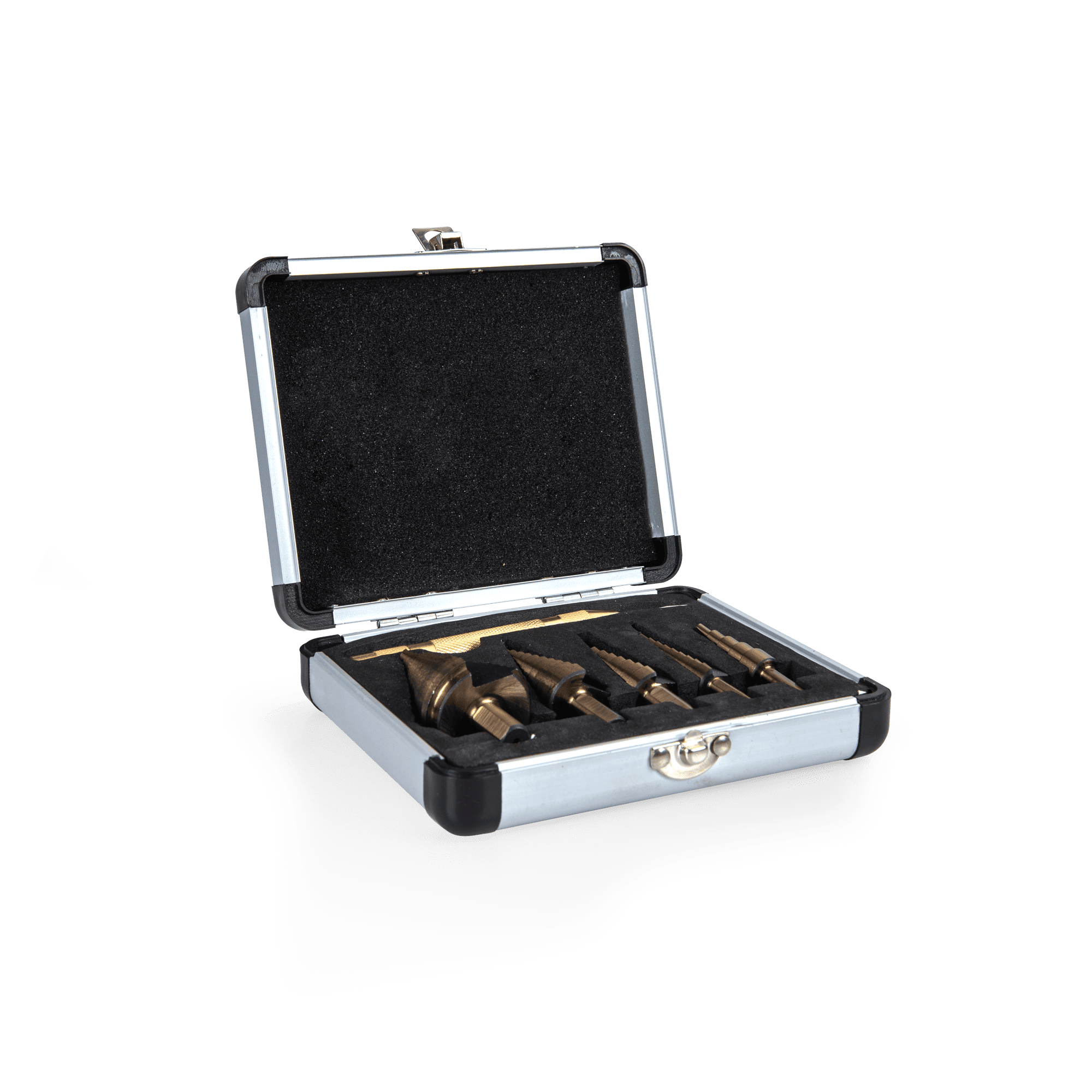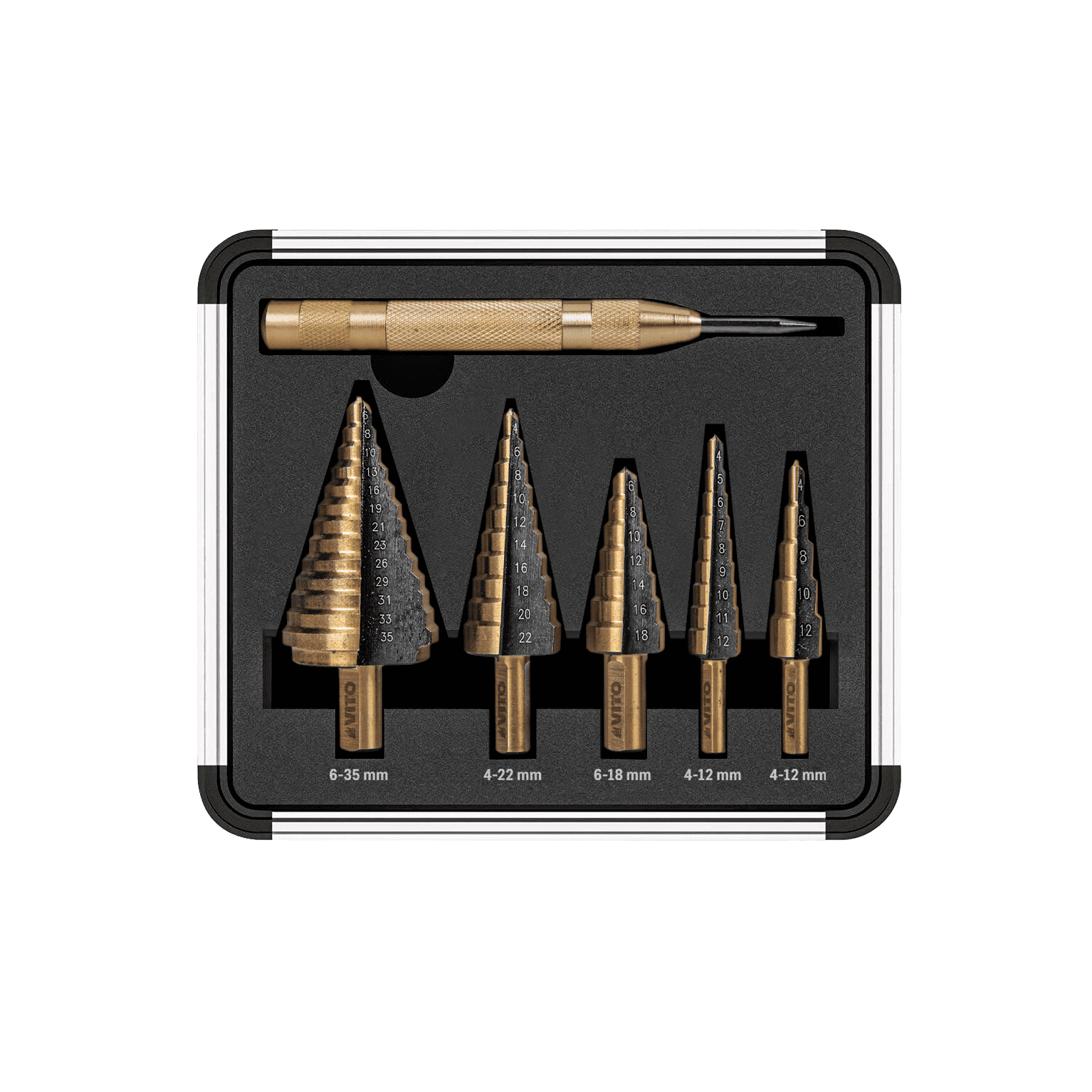 Este Conjunto de Brocas Escalonadas VITO (VIBEHSS5) inclui uma caixa de transporte com 5 brocas de ponta afiada com diâmetros desde: 6-35mm, 4-22mm, 6-18mm e 4-12mm (2x). Contém ainda um ponteiro, permitindo estabelecer o sítio exato da perfuração obtendo um maior controlo e precisão.