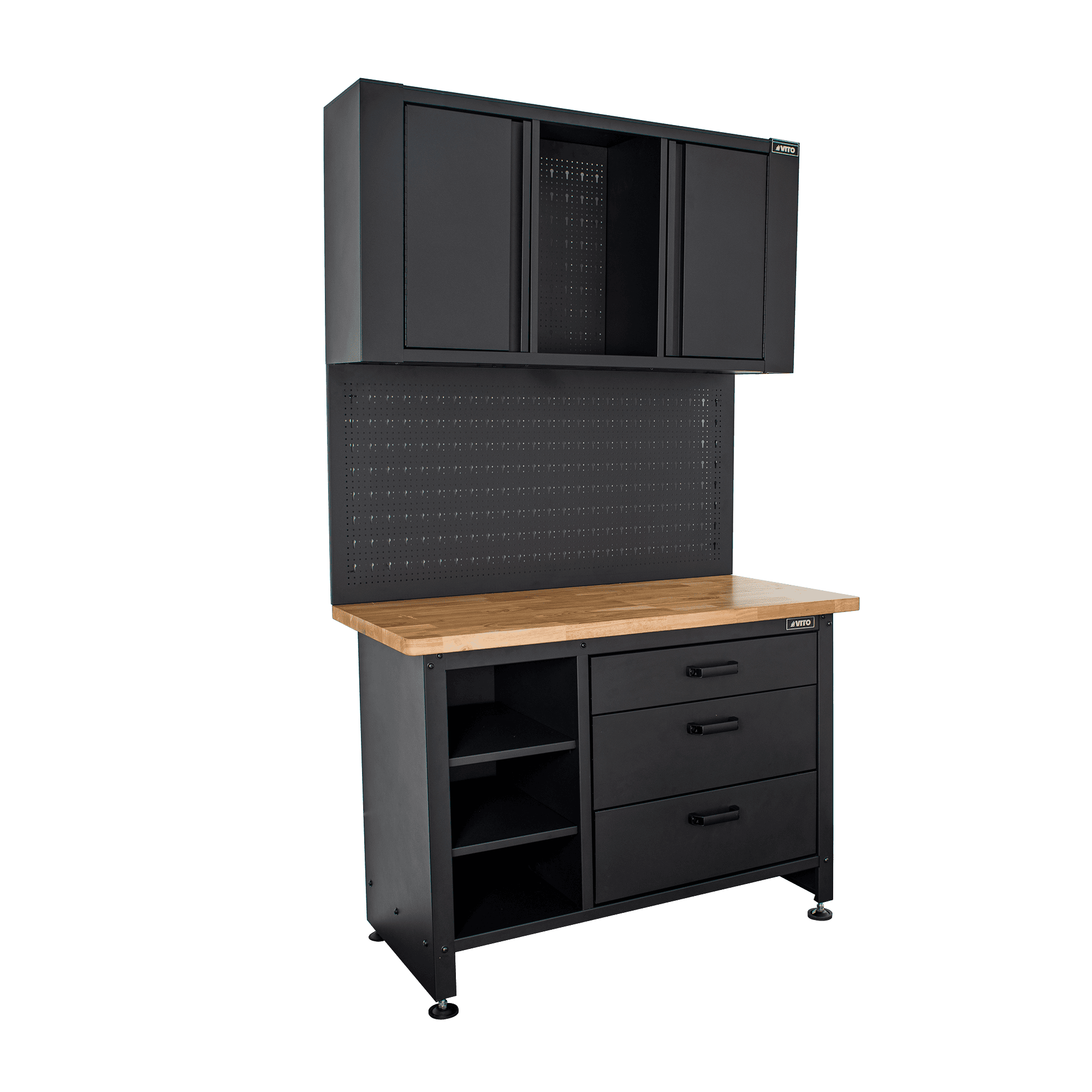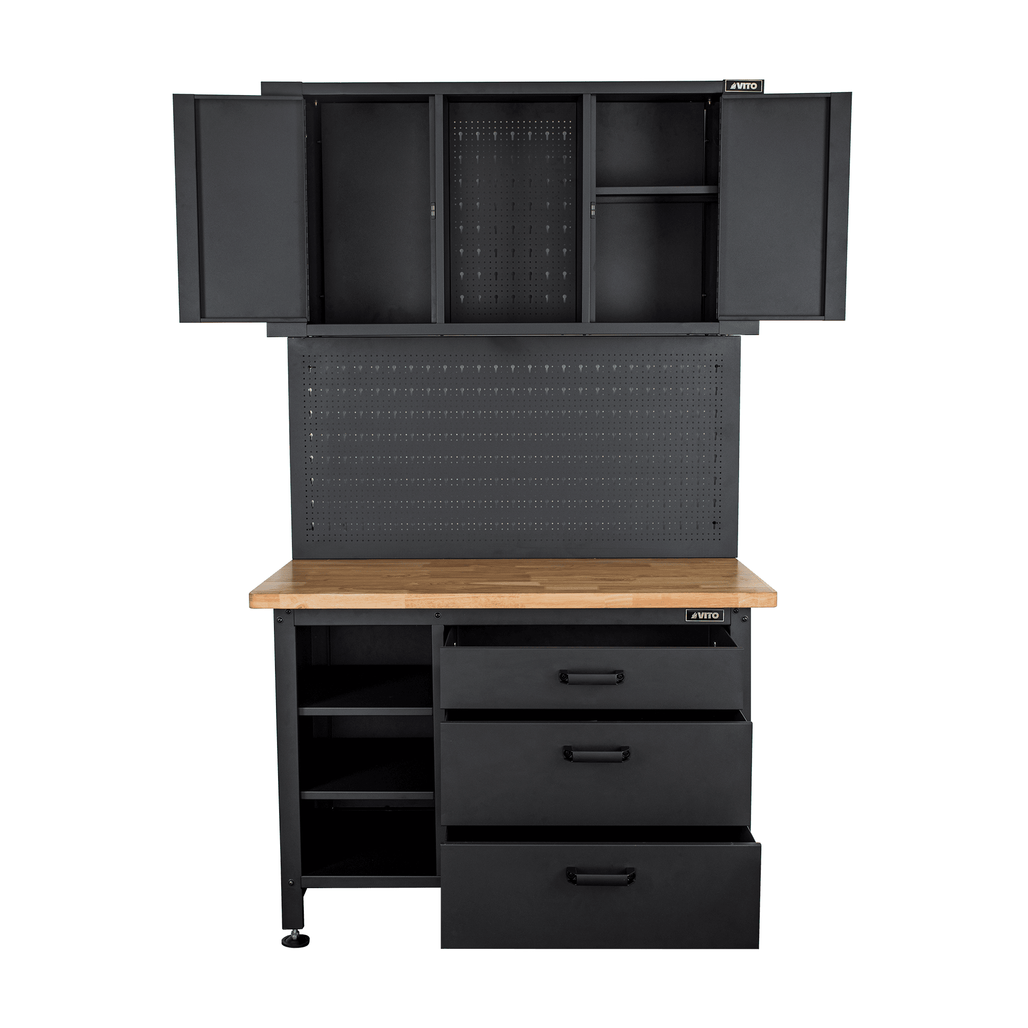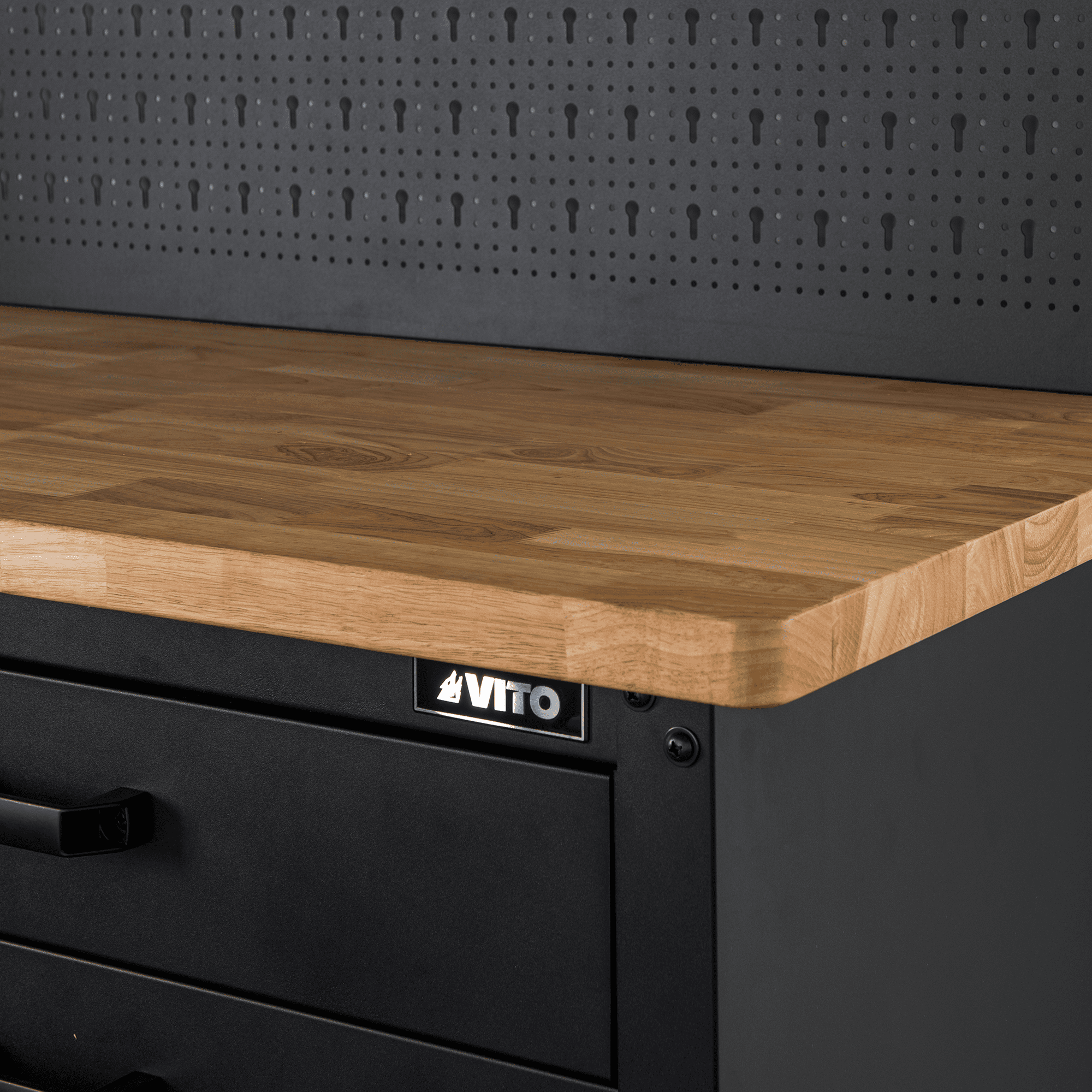 Esta bancada de trabalho da VITO (VIBTPA) construída em aço de alta qualidade e com capacidade máxima de carga até 500kg, é uma solução de trabalho prática, resistente e organizada. A bancada possui um painel superior, ideal para organizar ferramentas, e um armário equipado com duas portas. O tampo da bancada é feito de madeira tratada, oferecendo uma superfície estável e resistente para as mais diversas tarefas. A bancada, inclui três gavetas adicionais e uma prateleira inferior, oferecendo várias opções de arrumação. As portas do armário possuem fechos magnéticos, garantindo fácil abertura e segurança ao armazenar os equipamentos. Além disso, os pés ajustáveis permitem nivelar a bancada em diferentes superfícies, oferecendo maior estabilidade.