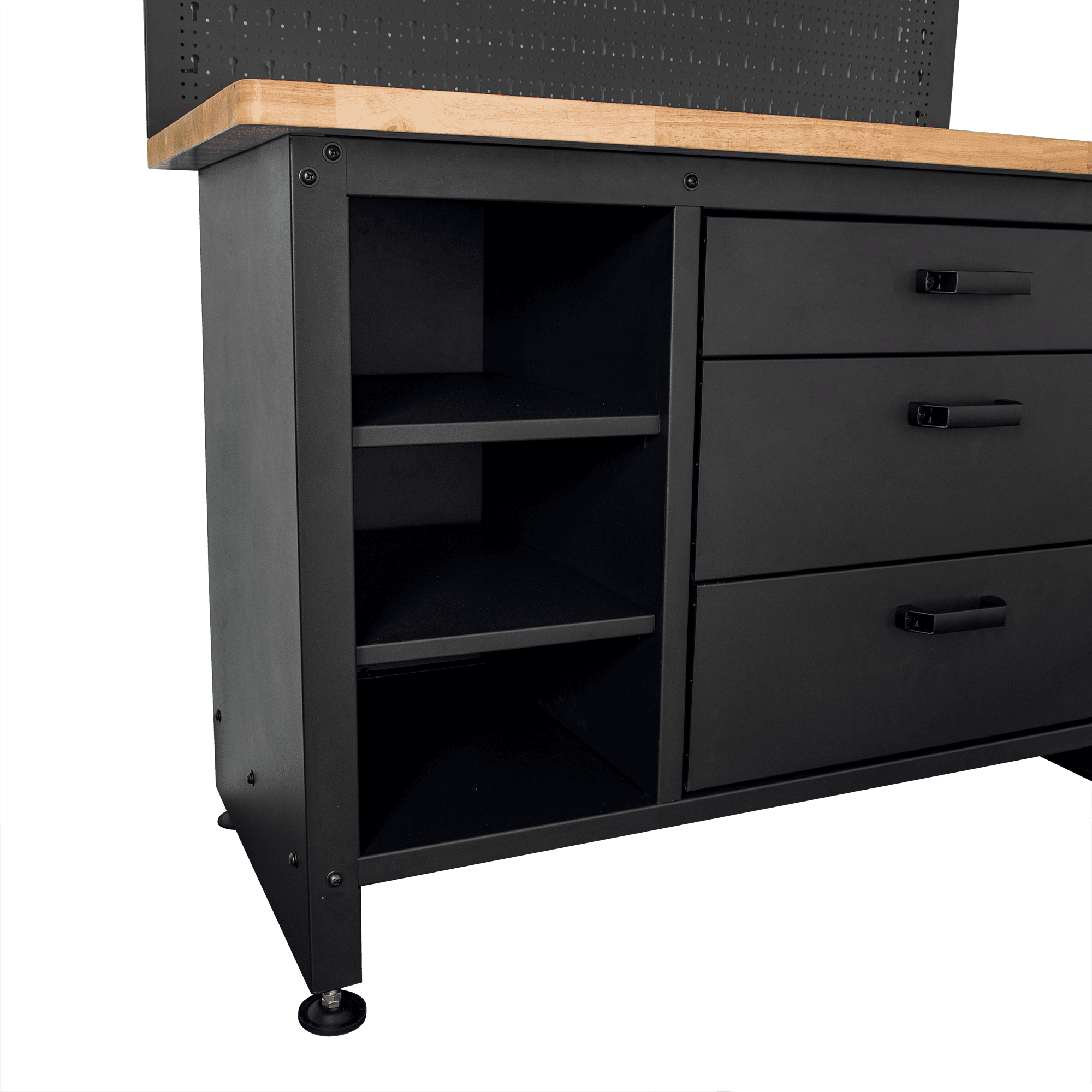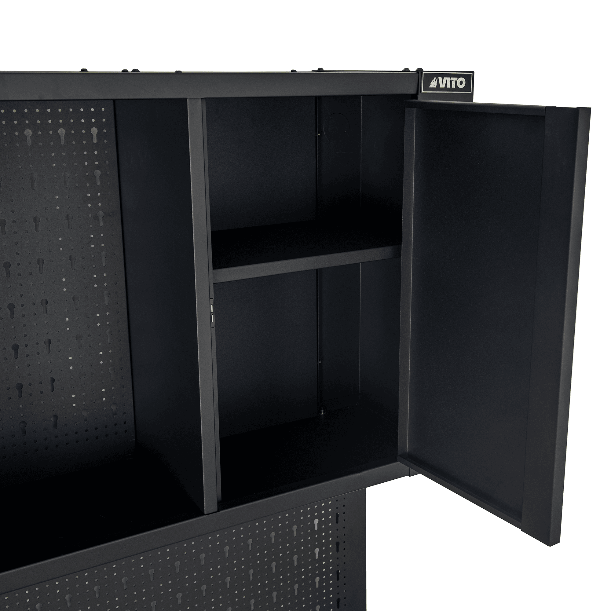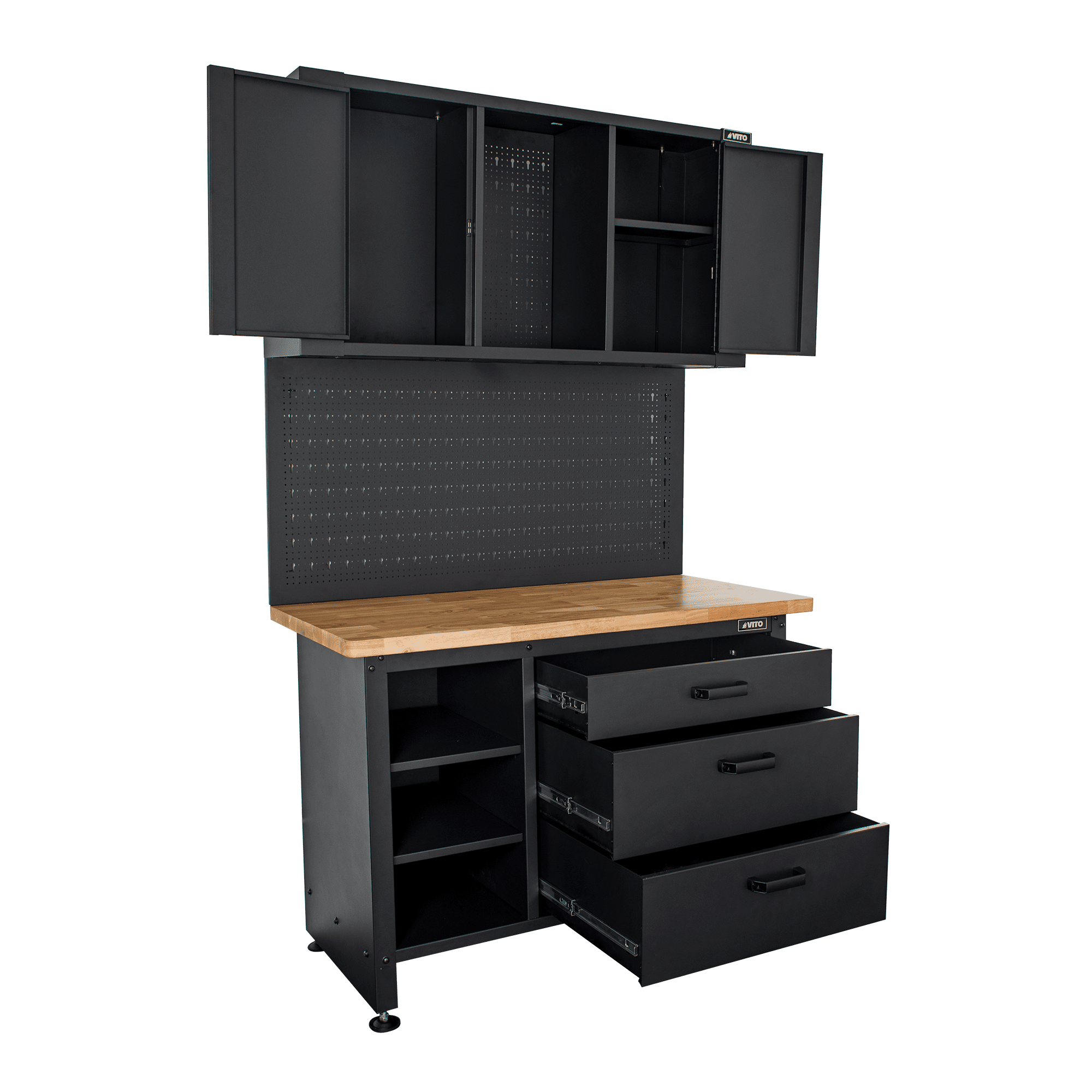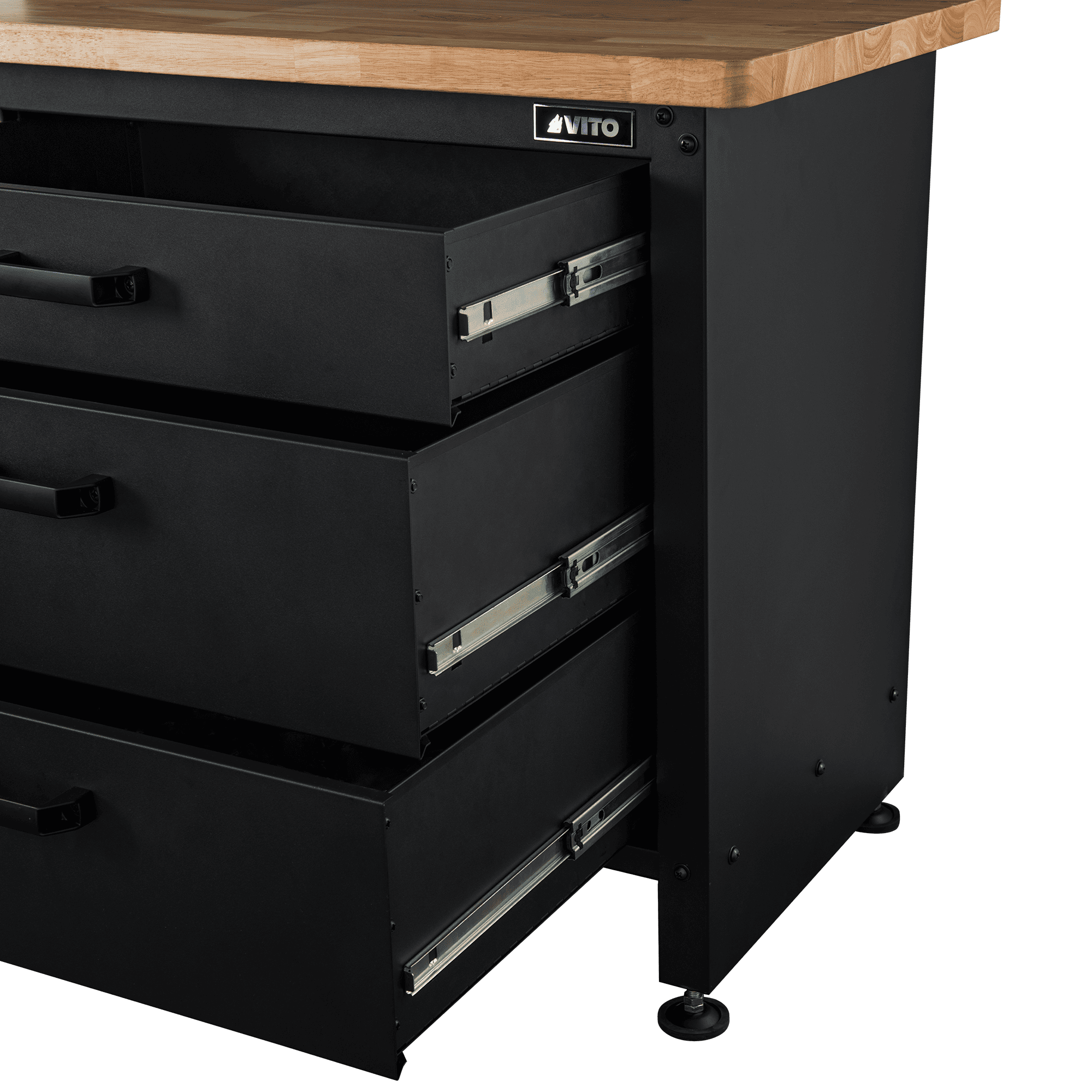 Esta bancada de trabalho da VITO (VIBTPA) construída em aço de alta qualidade e com capacidade máxima de carga até 500kg, é uma solução de trabalho prática, resistente e organizada. A bancada possui um painel superior, ideal para organizar ferramentas, e um armário equipado com duas portas. O tampo da bancada é feito de madeira tratada, oferecendo uma superfície estável e resistente para as mais diversas tarefas. A bancada, inclui três gavetas adicionais e uma prateleira inferior, oferecendo várias opções de arrumação. As portas do armário possuem fechos magnéticos, garantindo fácil abertura e segurança ao armazenar os equipamentos. Além disso, os pés ajustáveis permitem nivelar a bancada em diferentes superfícies, oferecendo maior estabilidade.