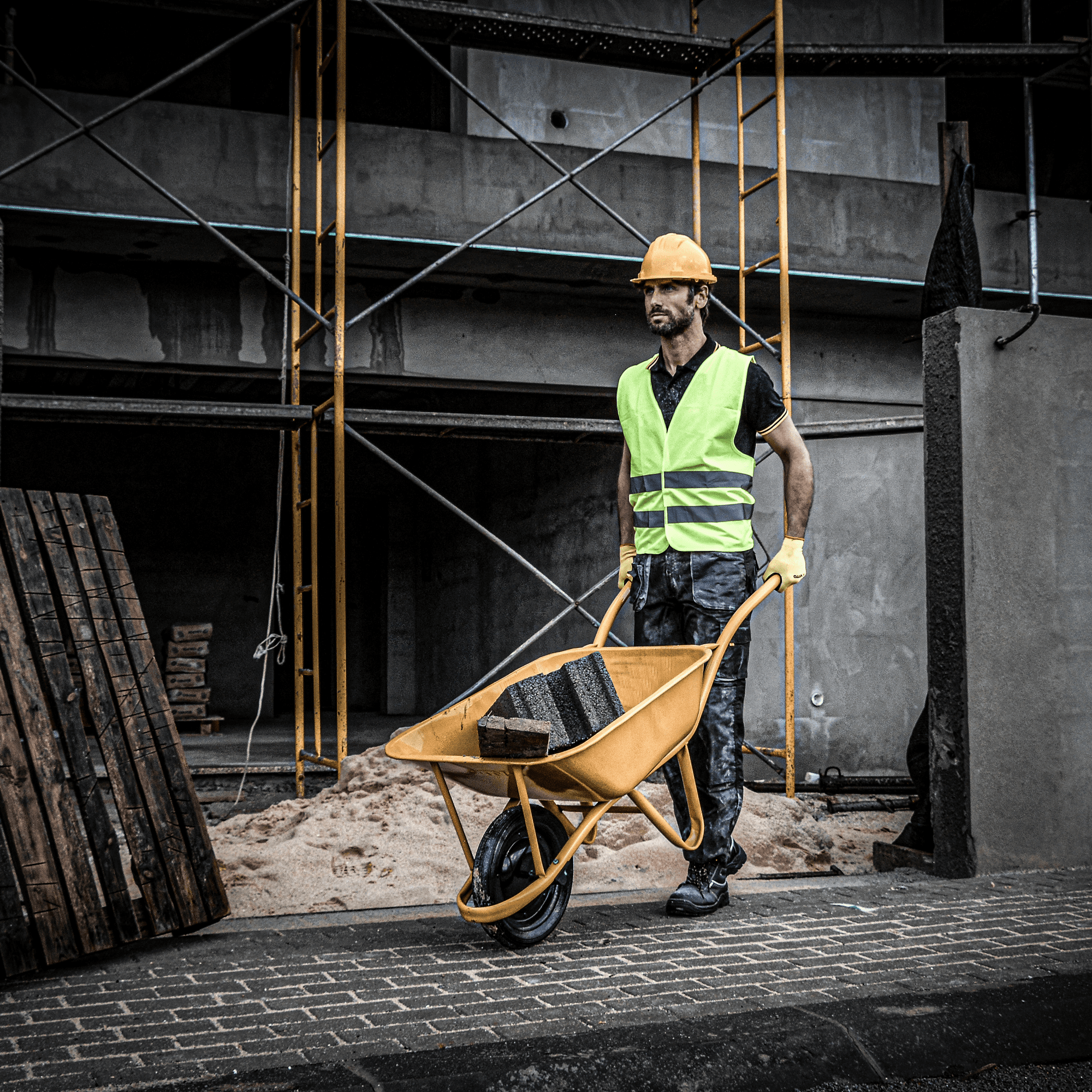 Carro de Mão Roda Grande com capacidade de 85L, conta com um resguardo frontal da roda e uma cuba com frente quadrada.