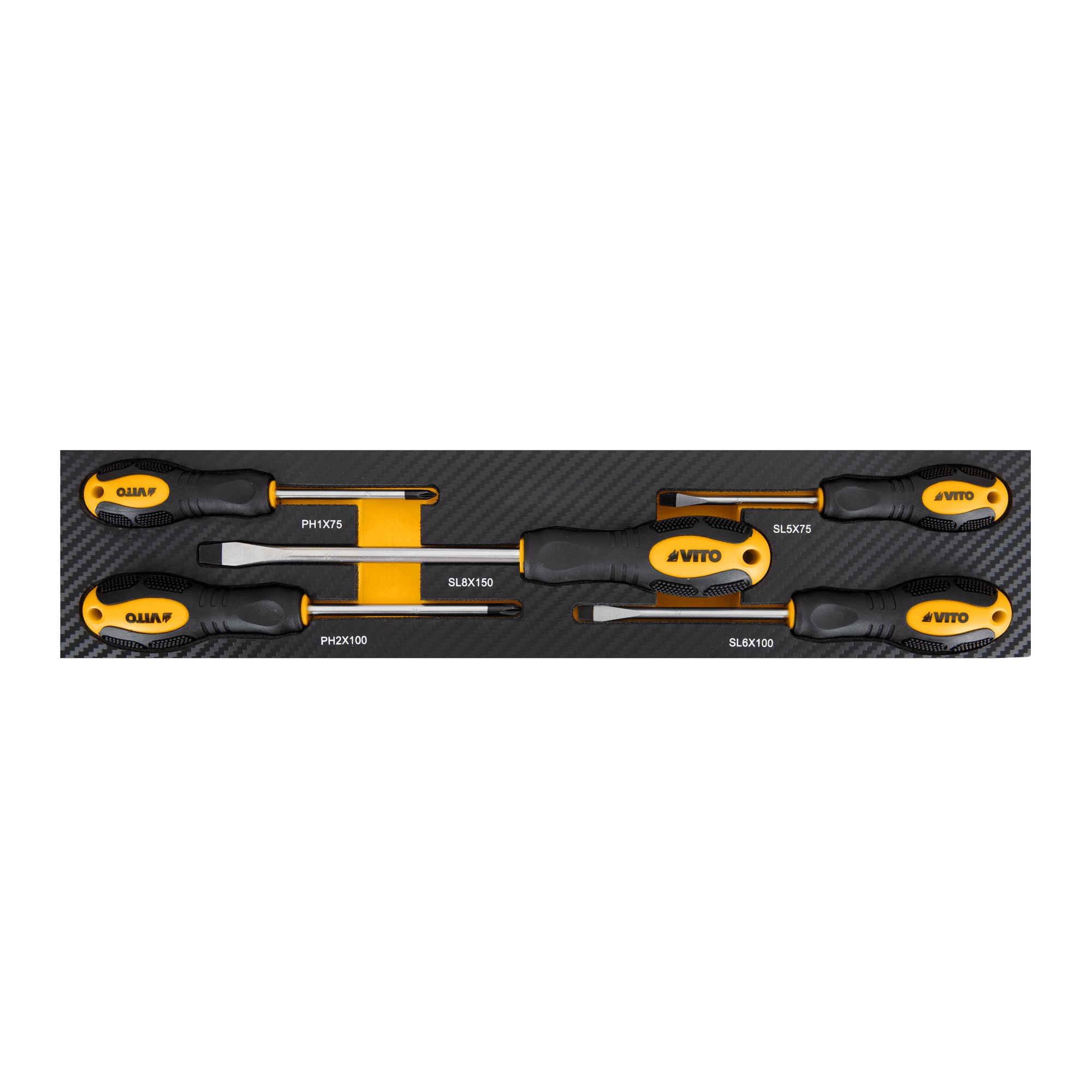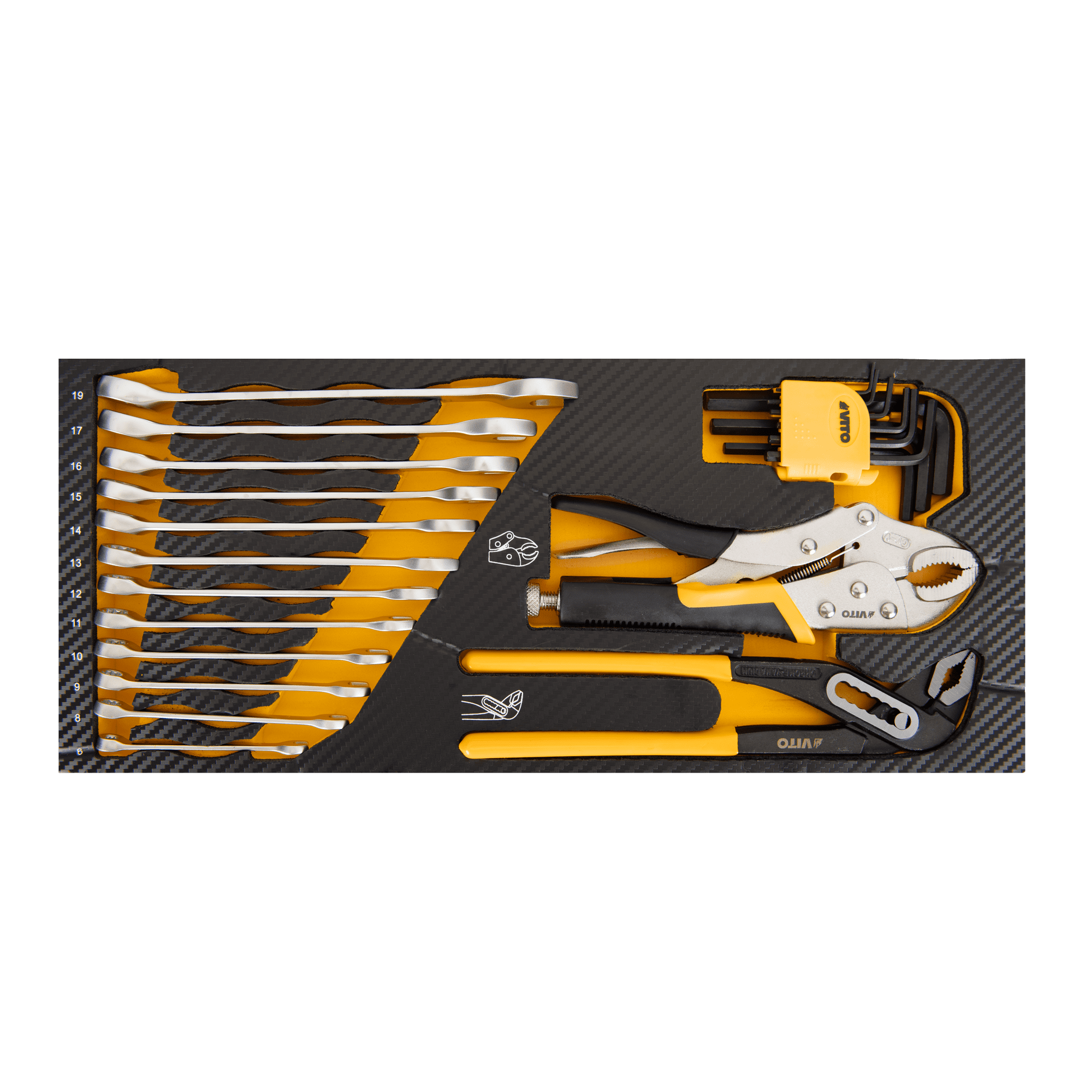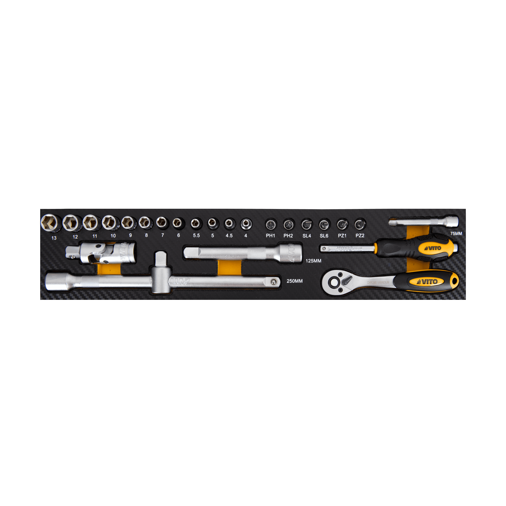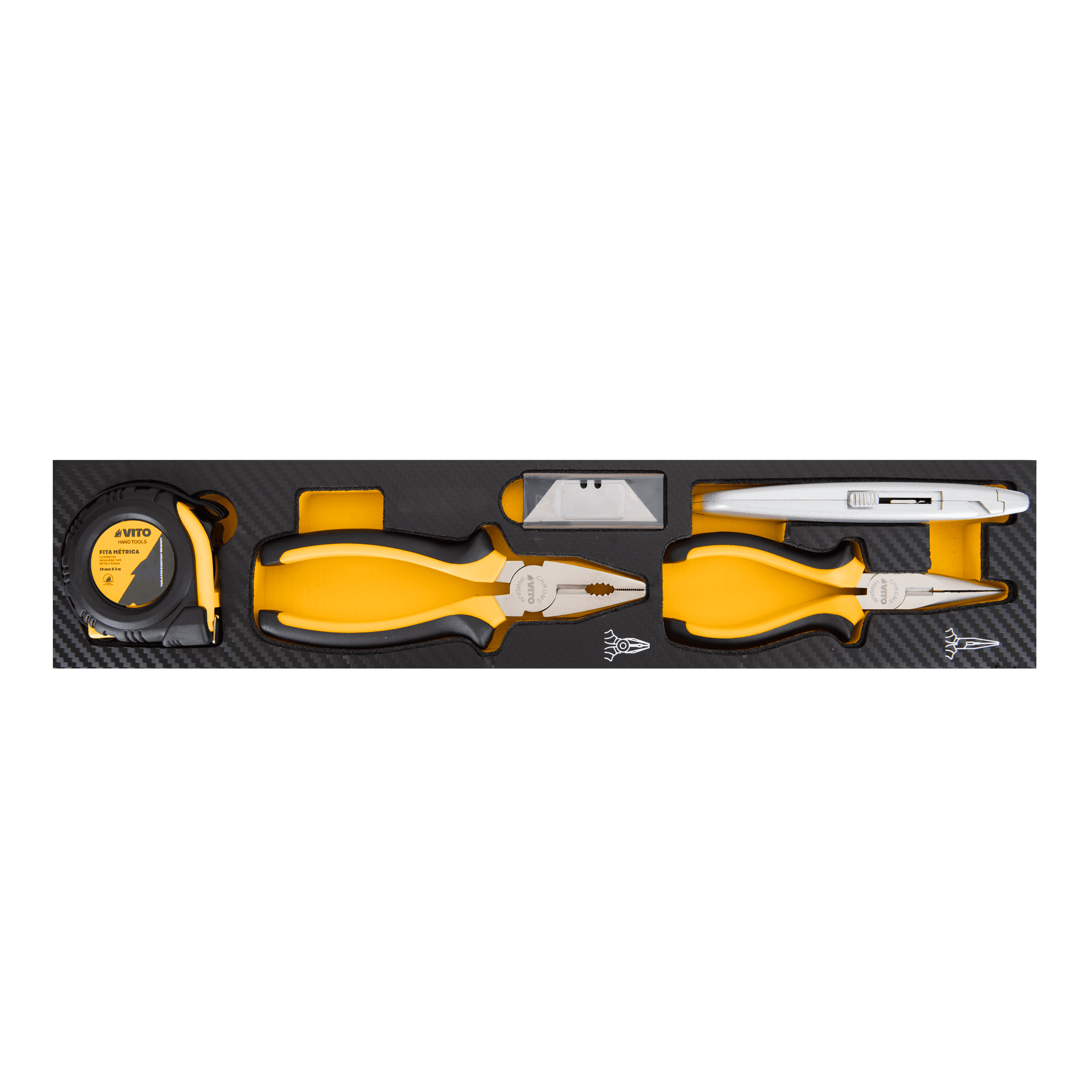 A Caixa de Ferramentas VITO (VICMF90) representa a qualidade e versatilidade, reunindo 90 peças da VITO essenciais para diversas tarefas de manutenção e reparação, seja em casa ou no trabalho. Com ferramentas de alta qualidade, como um jogo completo de chaves de caixa, chaves de fendas, chaves Phillips, chaves boca-luneta, chaves hexagonais, martelos, serrote, fita métrica e vários tipos de alicates. Esta caixa metálica é composta por quatro divisórias em carbono, que garantem uma elevada resistência ao desgaste a impactos, aumentando a durabilidade.