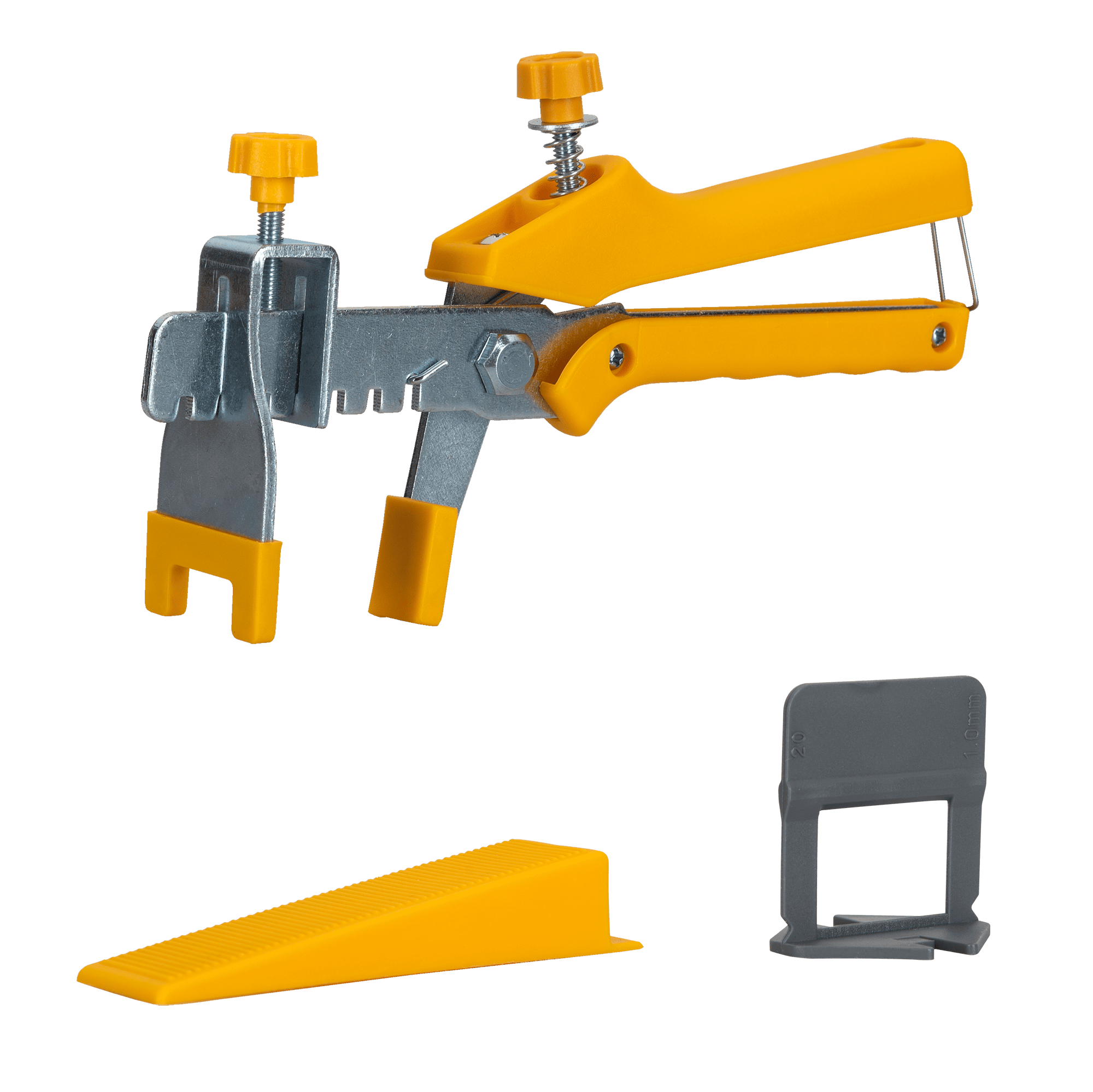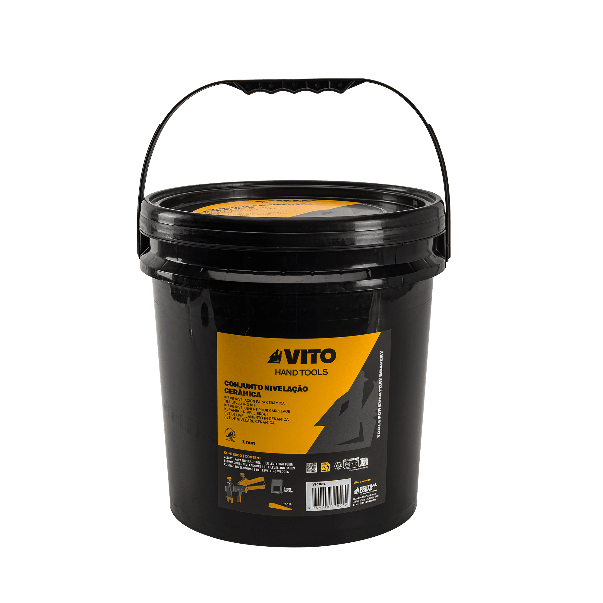 Este conjunto está equipado com um alicate para niveladores que garante a aplicação uniforme de cunhas, assegurando o nivelamento das superfícies. Por sua vez, os espaçadores permitem demarcar a distância entre cada peça, enquanto as cunhas niveladoras eliminam qualquer desnível que possa estar presente. Para além disto, o balde de plástico facilita o transporte e armazenamento de todo o conjunto.