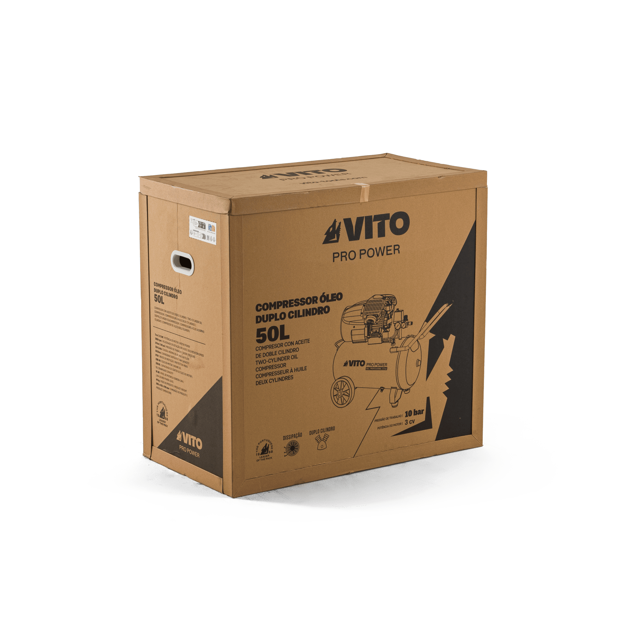 Este compressor profissional de 50 litros com motor a óleo de 3,0 cv (2,2 kW) e duplo cilindro foi desenvolvido para fornecer um caudal de ar estável e potente, ideal para alimentar ferramentas pneumáticas em oficinas, trabalhos de manutenção, carpintaria, construção e aplicações industriais leves. A trabalhar a 10 bar, garante pressão suficiente para pistolas de impacto, pregadores, pistolas de pintura, sopro, enchimento e outras operações que exigem desempenho constante. O motor a óleo, lubrificado com 15W-40, assegura maior durabilidade, menor aquecimento e funcionamento mais suave, mesmo em ciclos prolongados. Com caudal máximo de 334 L/min e velocidade de 2850 rpm, este compressor oferece resposta rápida e fluxo de ar estável. O depósito de 50 litros proporciona autonomia adequada, reduzindo paragens frequentes e otimizando a produtividade em contexto profissional. A estrutura integra válvula de segurança, proteção térmica, interruptor On/Off, saída de topo para ligação à rede fixa e cárter de óleo de 250 ml, garantindo funcionamento seguro em todas as condições. Com nível sonoro de 95 dB(A), é robusto, fiável e projetado para uso intensivo.