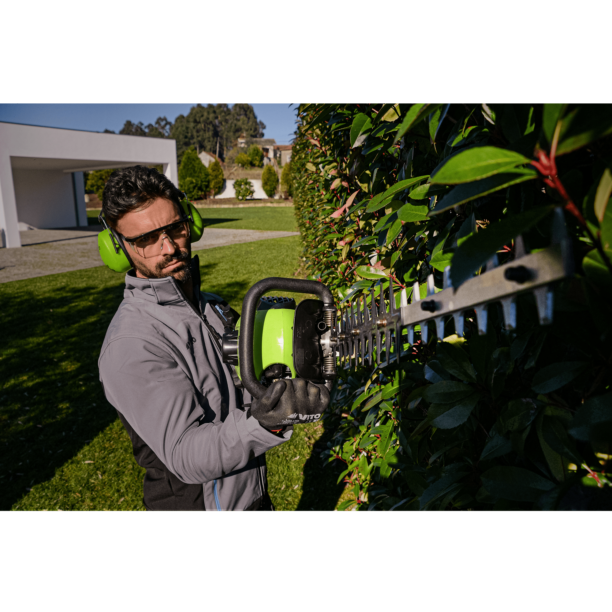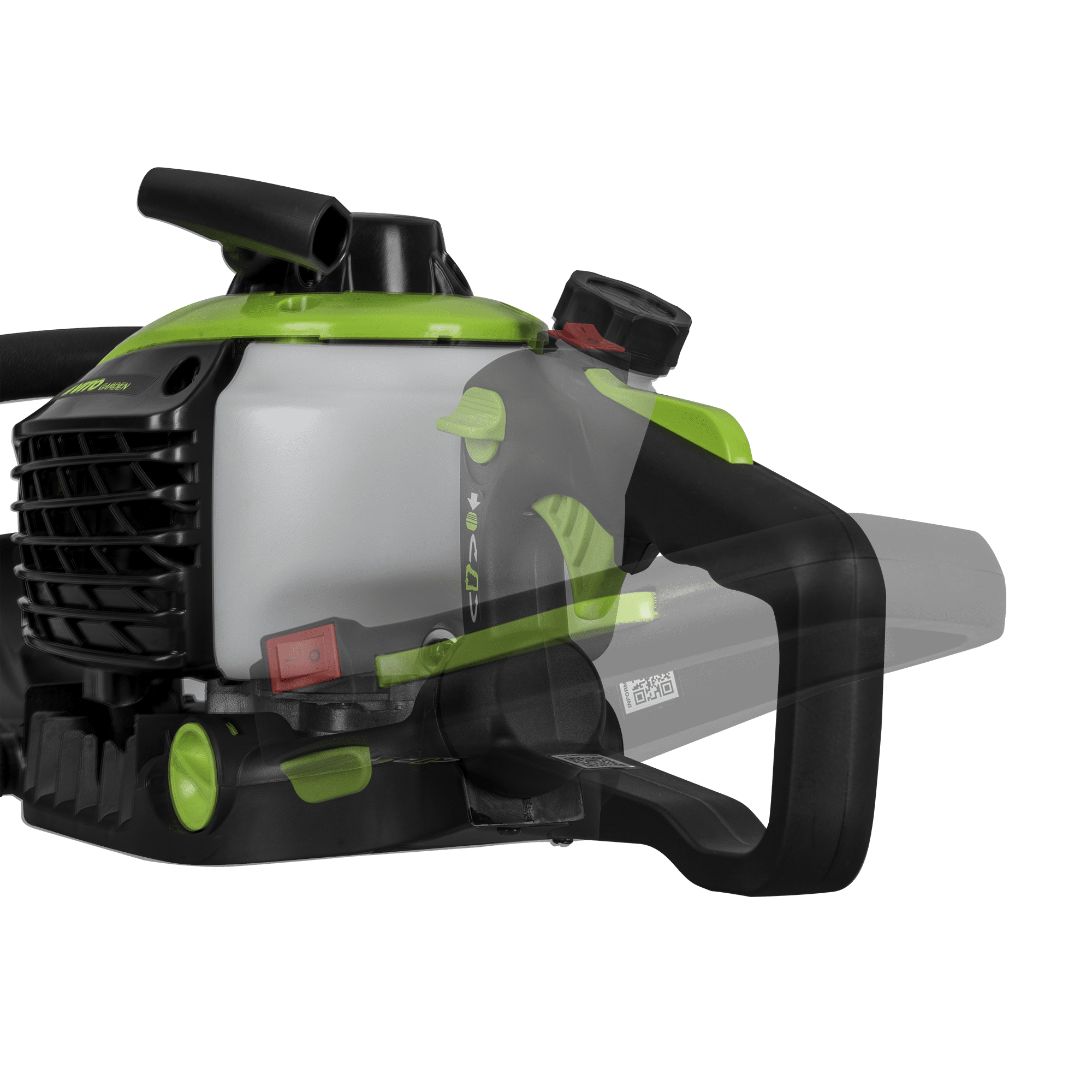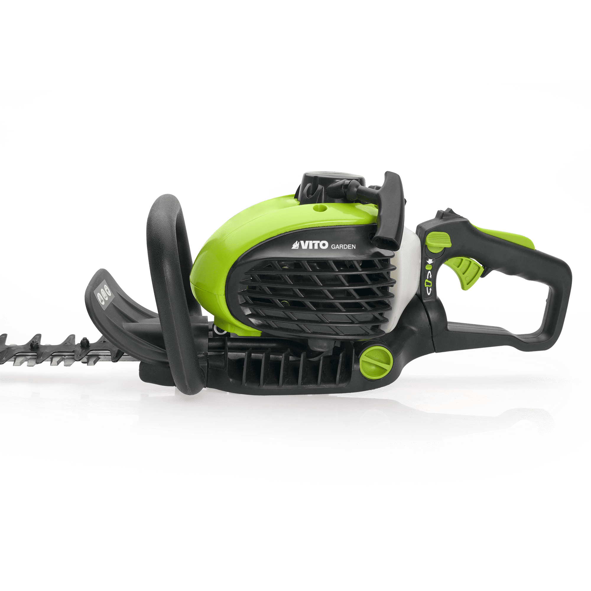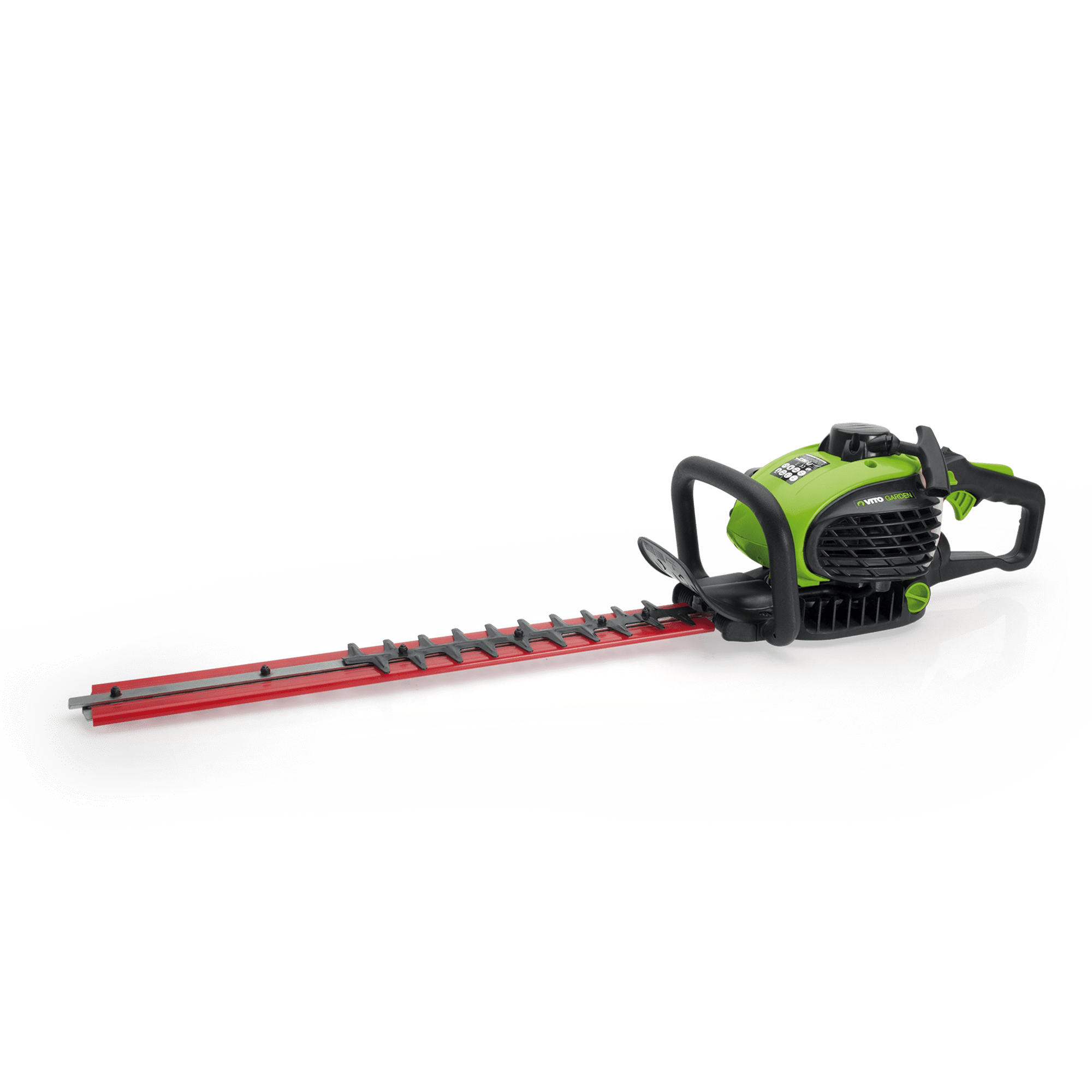 Corta Sebes a Gasolina com uma potência de 25cc, tem um motor 2 tempos, com uma velocidade de 9500rpm, com um comprimento da lâmina de 55 cm, tem um espaço entre dentes de 20mm e uma altura de 35mm, com um cabo ajustável 90?, tem uma capacidade do depósito de 0,33L.