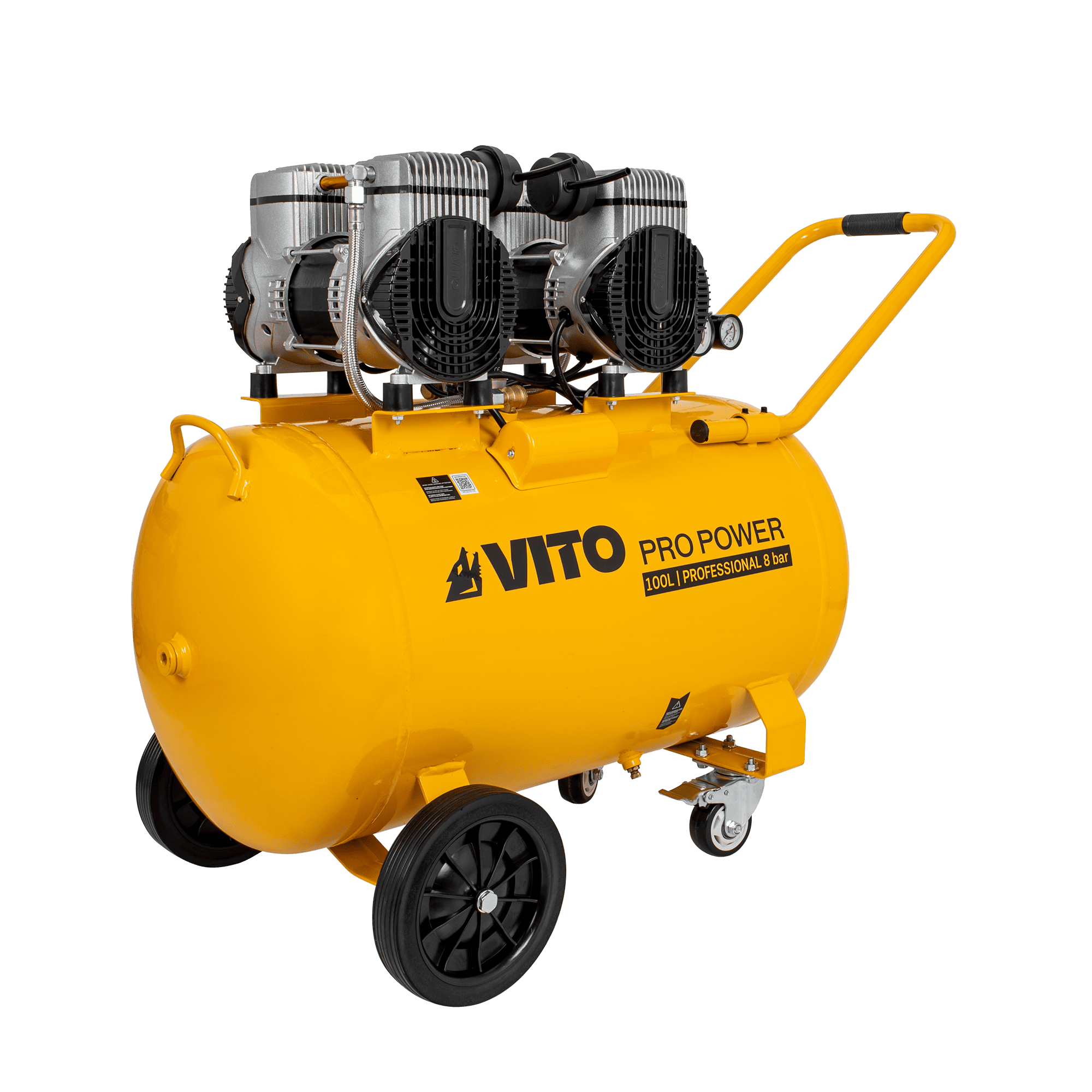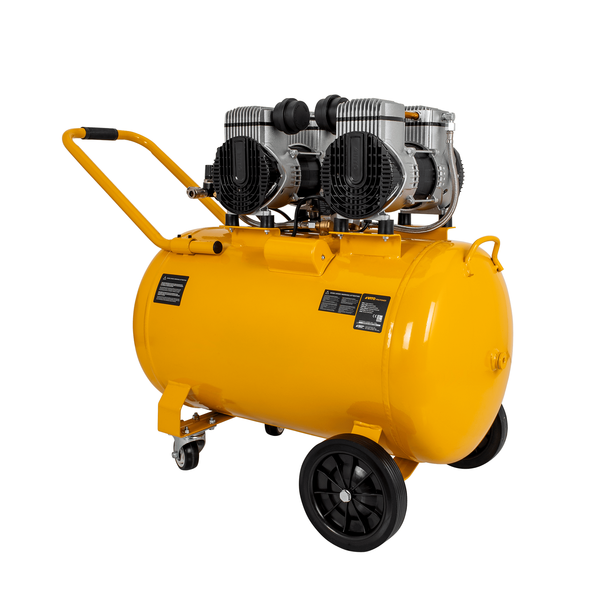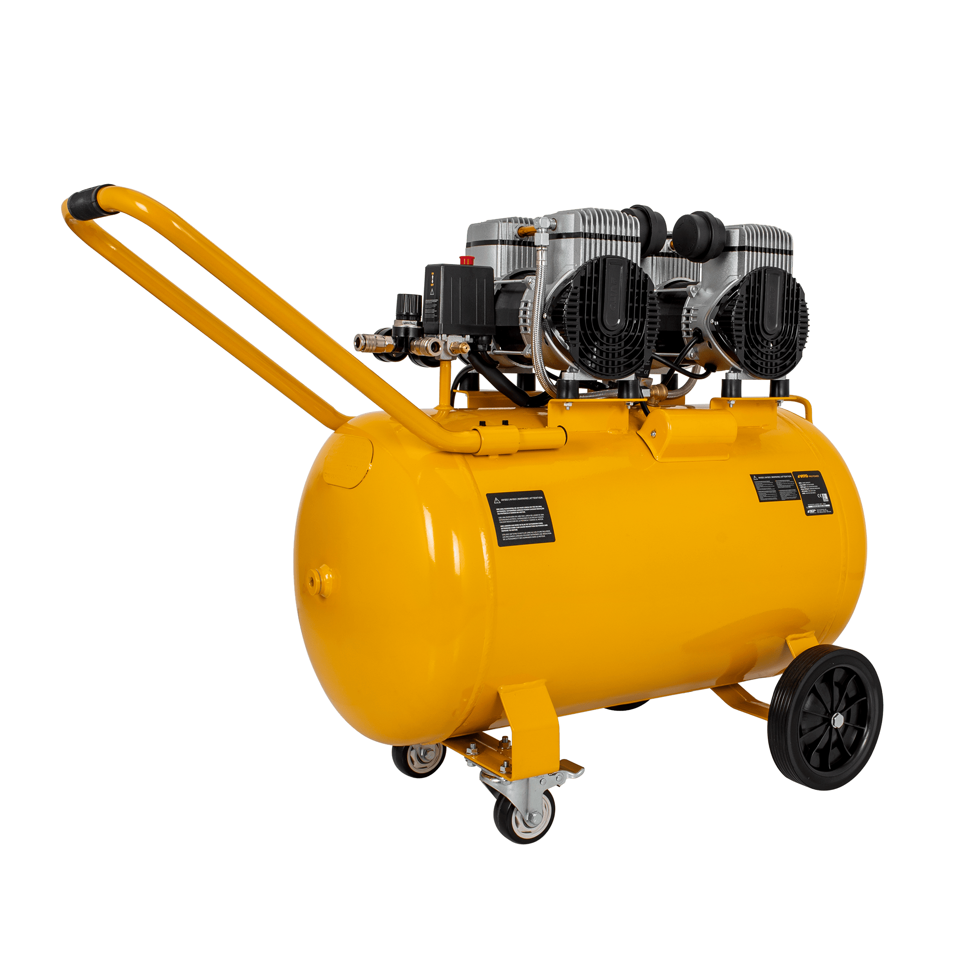 O compressor silencioso sem óleo de 100 litros foi desenvolvido para aplicações pneumáticas mais exigentes, onde é necessária maior capacidade de ar, potência elevada e funcionamento com baixo nível sonoro. O sistema isento de óleo assegura ar comprimido limpo e reduz significativamente as necessidades de manutenção, sendo adequado para utilização em ambientes interiores. Com um depósito de 100 litros e elevado caudal de ar, permite alimentar ferramentas pneumáticas de forma contínua, sendo ideal para pintura, manutenção, limpeza, enchimento e utilização intensiva em oficinas. Está equipado com válvula de segurança e proteção térmica, garantindo um funcionamento fiável e seguro. A estrutura robusta inclui rodas fixas e rodas giratórias, bem como pega de transporte, facilitando a movimentação em oficinas e áreas de trabalho profissionais.