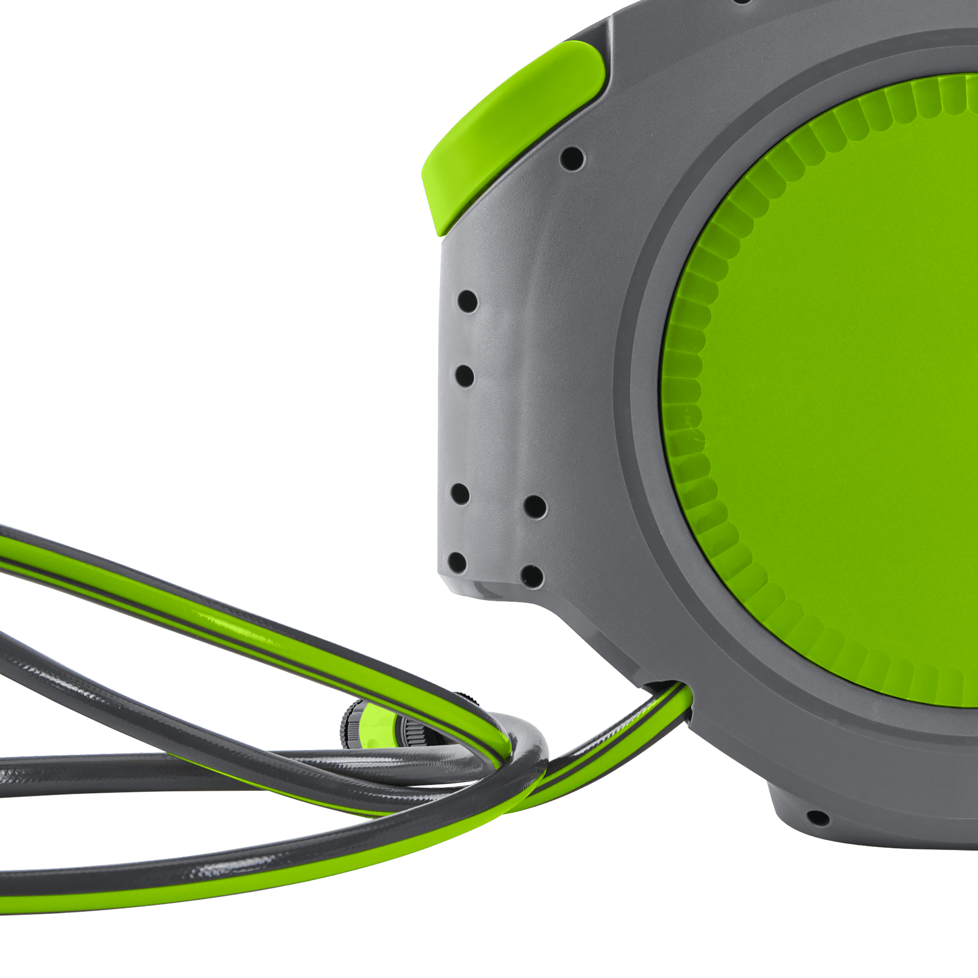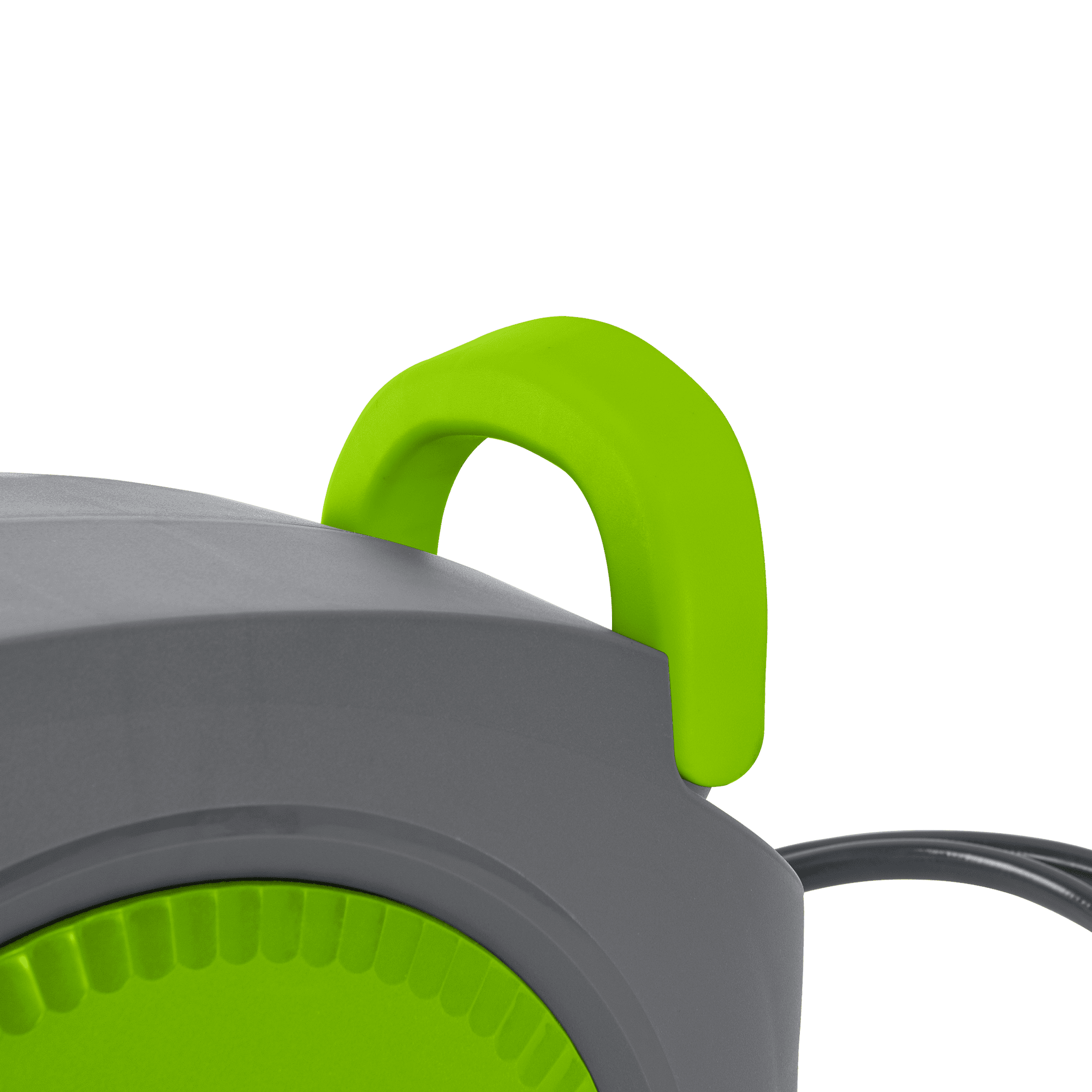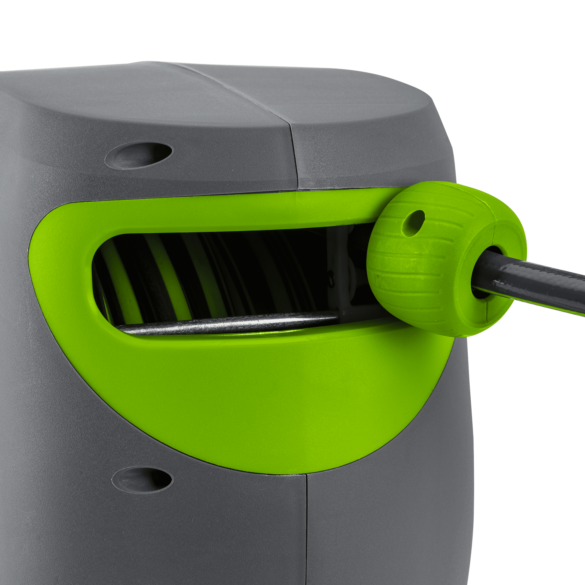 O enrolador contém uma pega de mão que auxilia o transporte do equipamento e uma função de paragem automática que evita a retração acidental da mangueira e permite fixar o ponto de enrolamento ou desenrolamento da mesma. Adicionalmente, apresenta um encaixe para torneira com 2 metros, que possibilita a ligação com uma torneira.