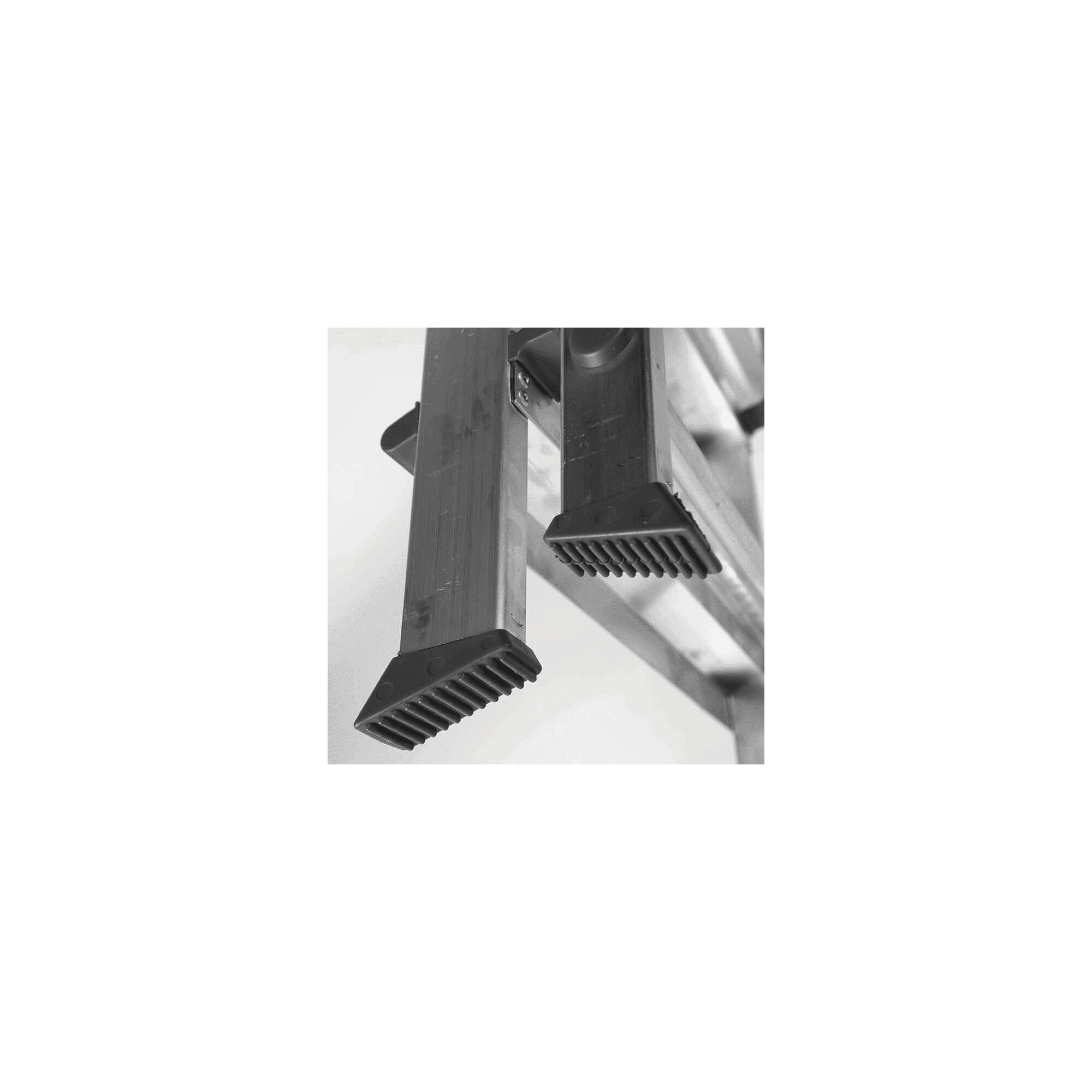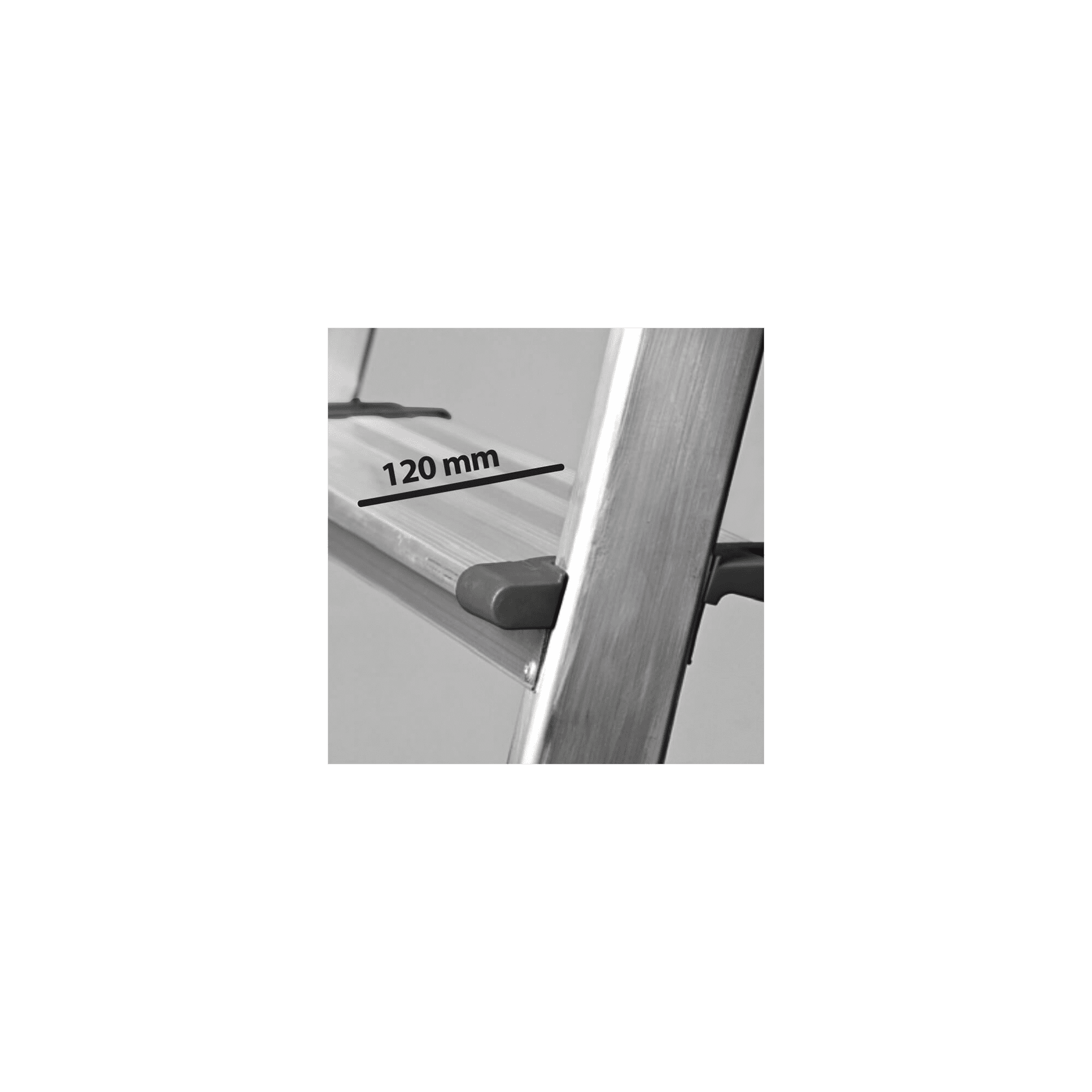 Escadote reforçado em Alumínio, tem uma plataforma ampla e antiderrapante (PVC), contém degraus com 120 mm de largura e cintas de segurança, equipado ainda pés antiderrapantes.