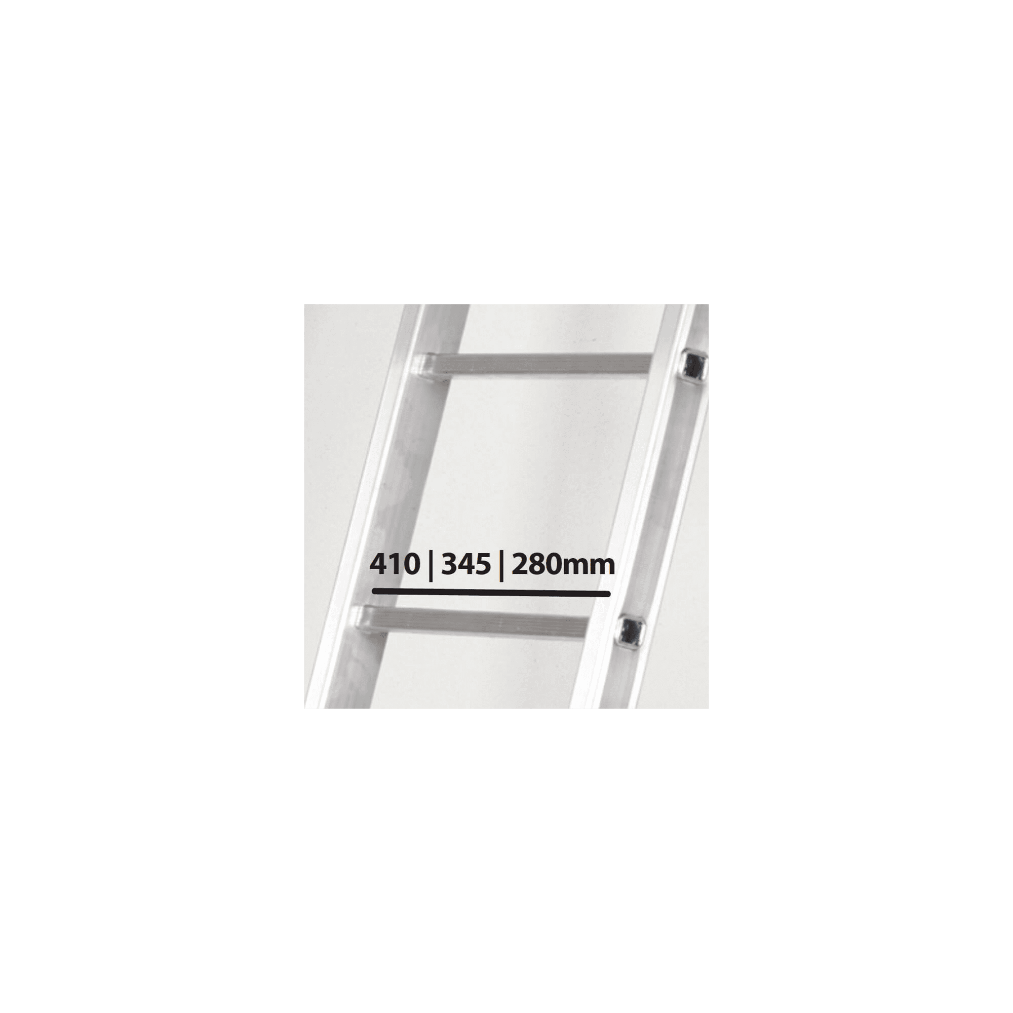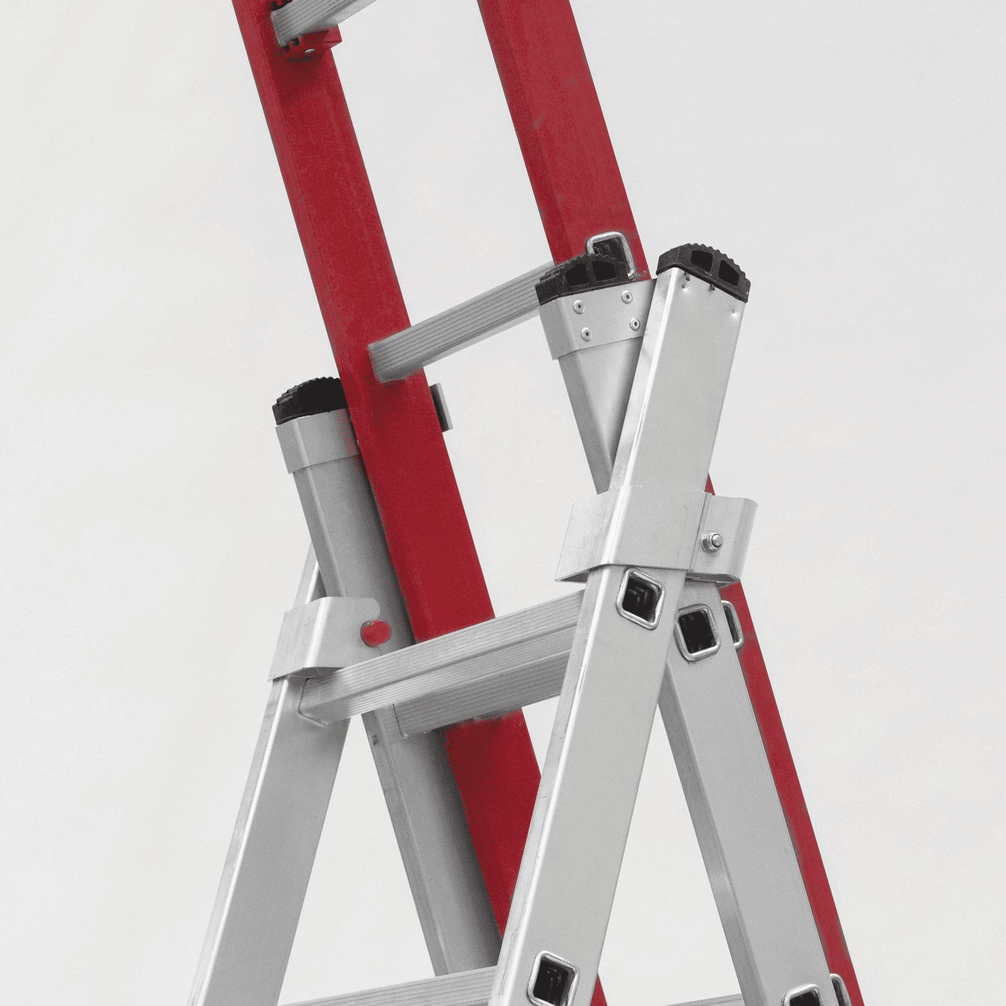 Escada Electra Tripla fabricada em alumínio e fibra de vidro, tem degraus quadrados anti-deslizantes, equipado com base estabilizadora e pés antiderrapantes.