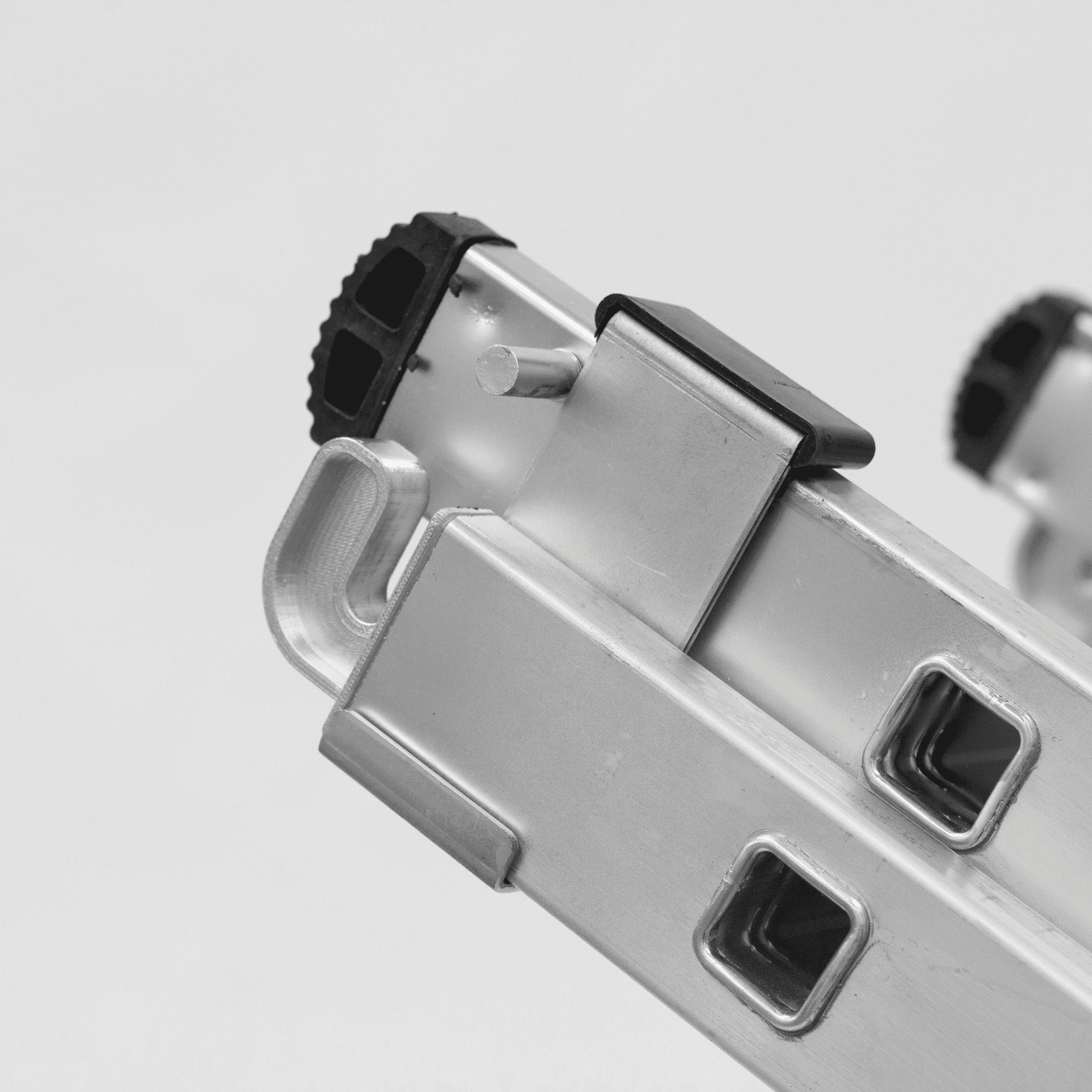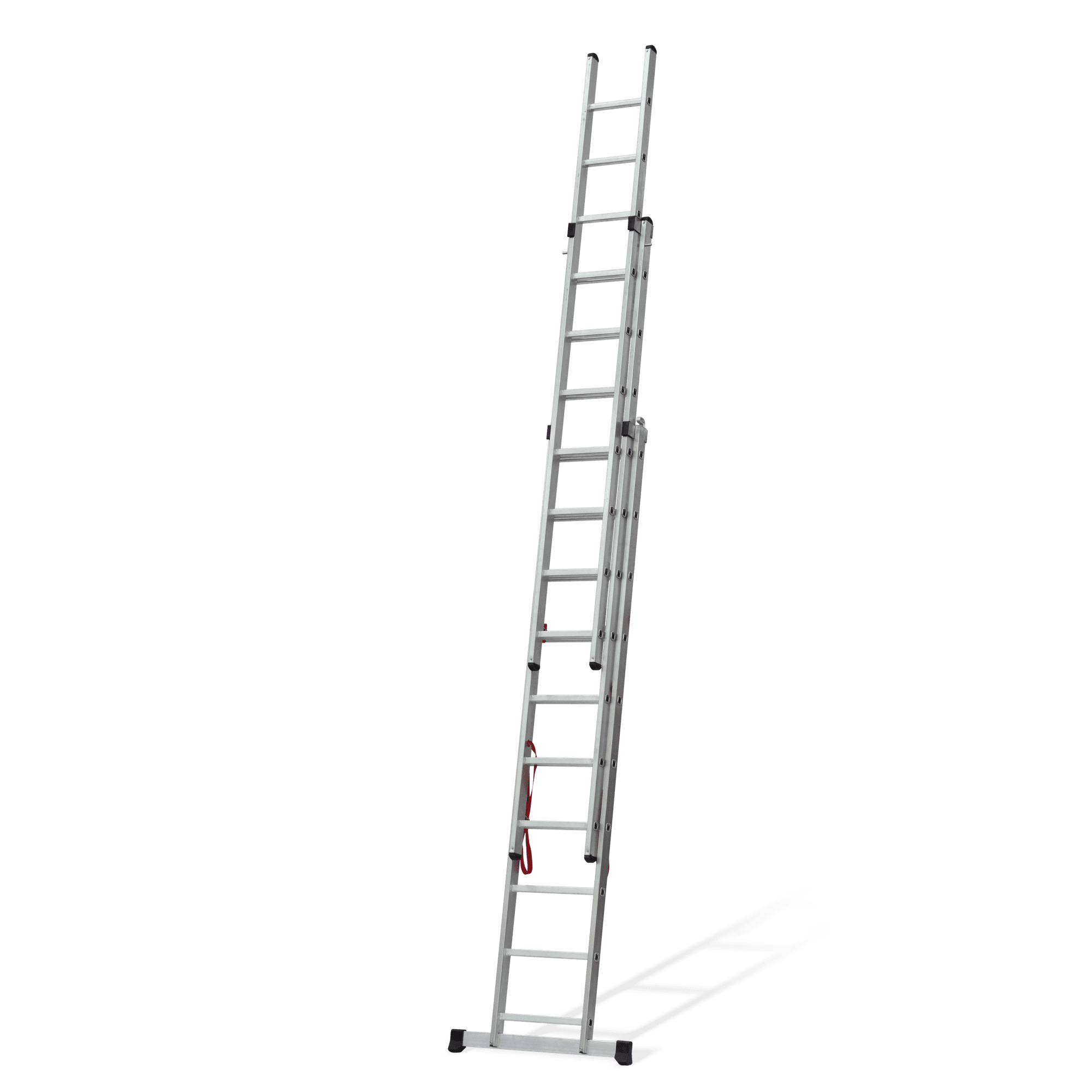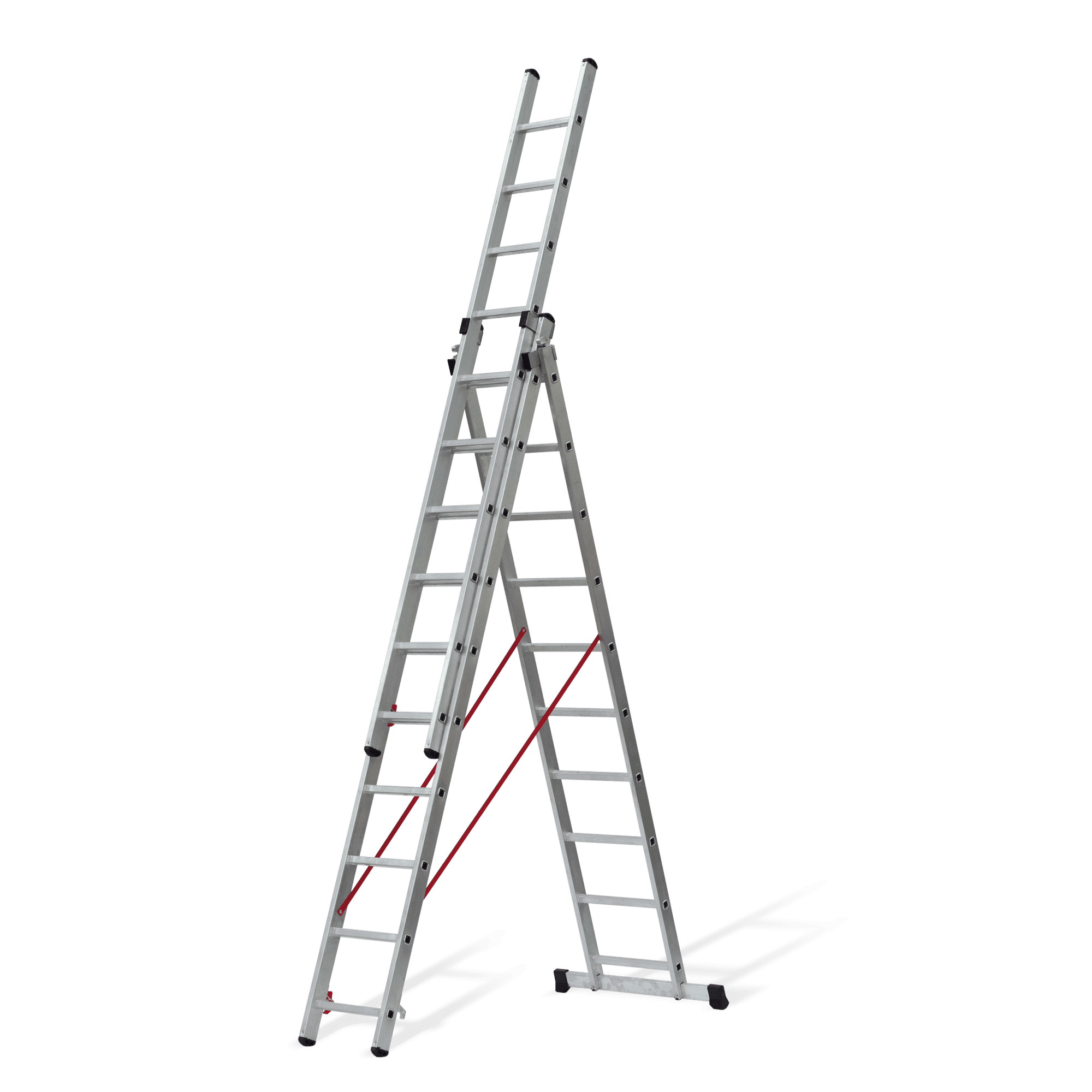 Escada Tripla fabricada em alumínio, com degraus quadrados anti-deslizantes, contém uma base estabilizadora, pés antiderrapantes e ainda um sistema elevatório de corda.