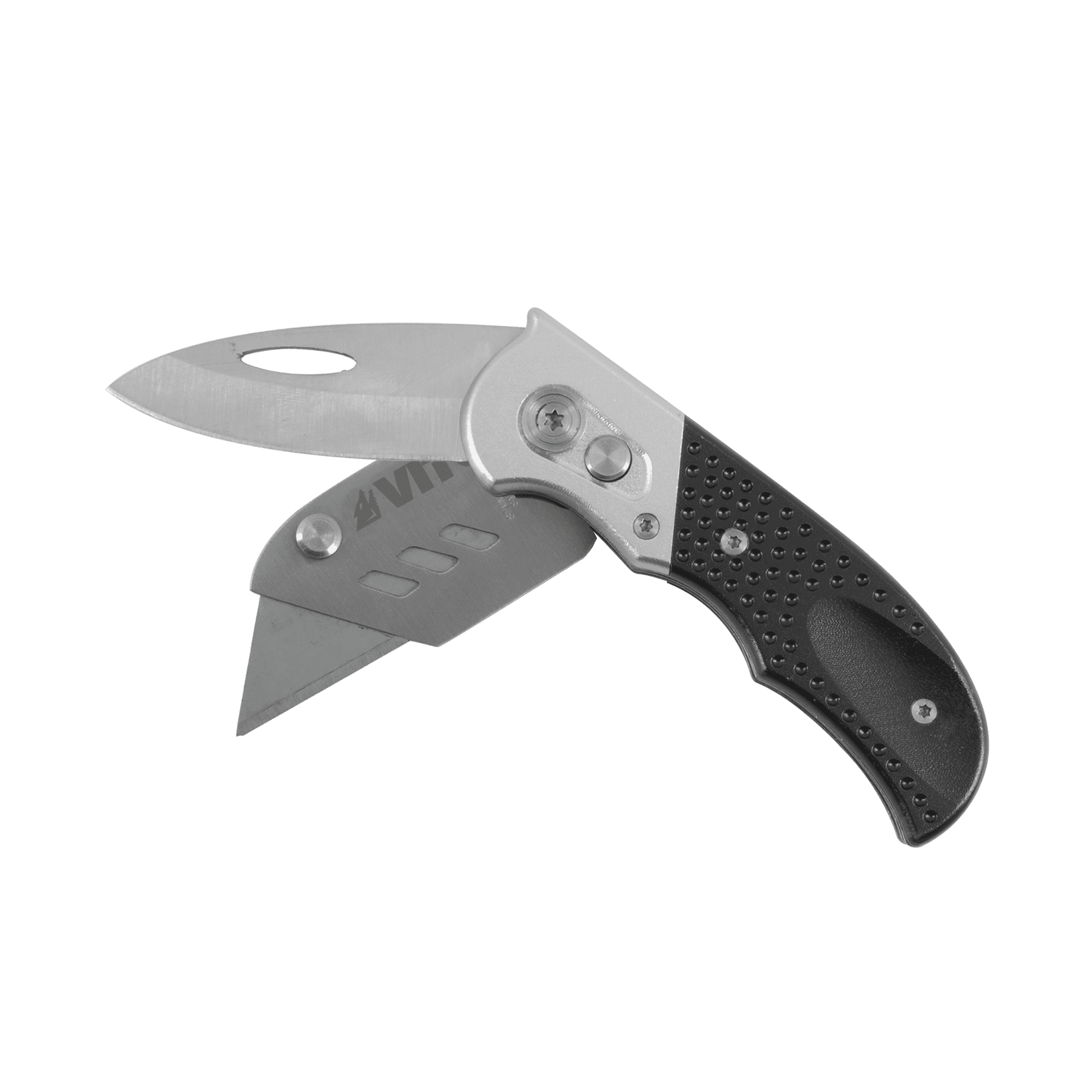 Faca de Alcatifa com Canivete Dobrável, com o corpo em aluminio, possui uma lâmina fixa com mecanismo de bloqueio da mesma, permite fazer a mudança rápida da lâmina, inclui ainda canivete.