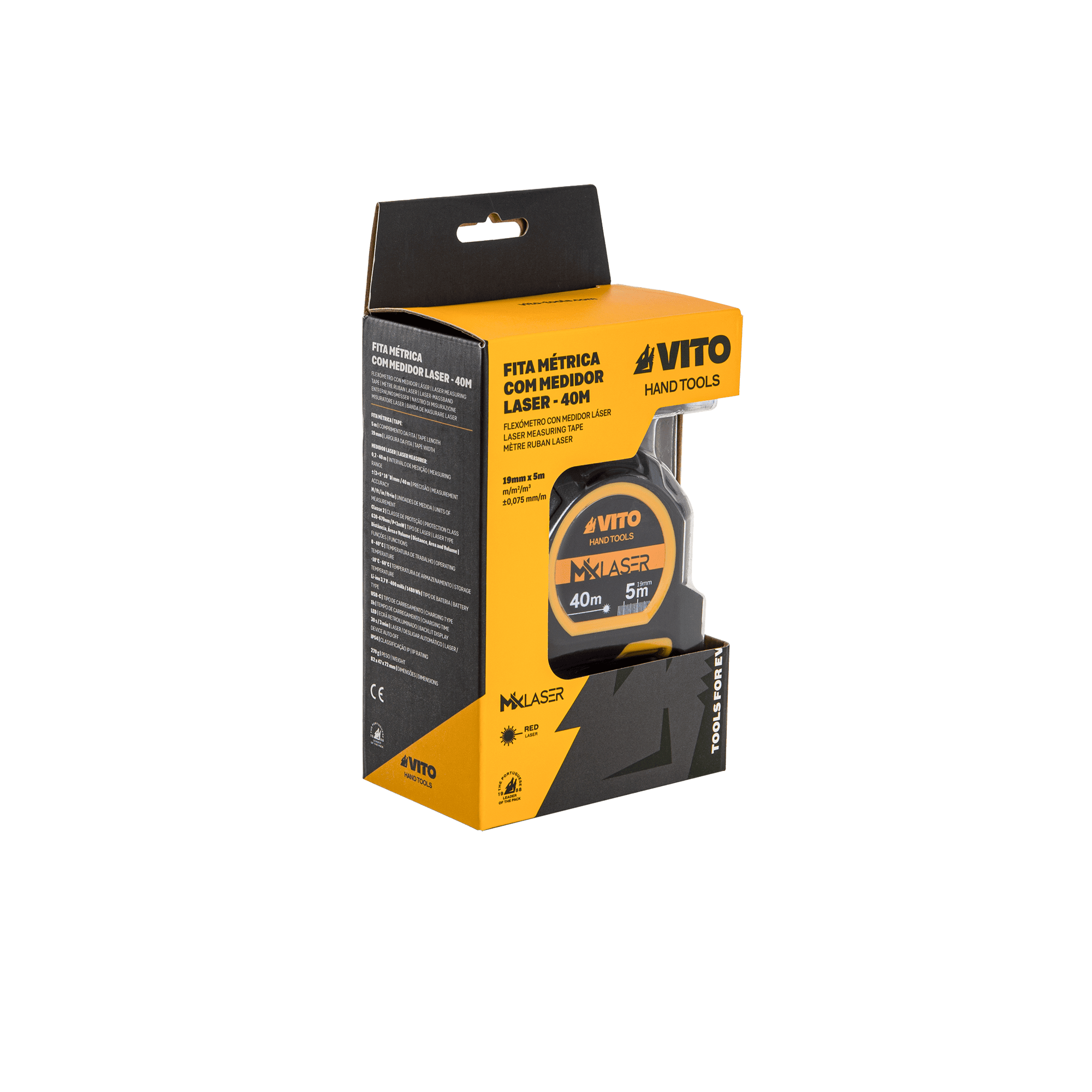A Fita Métrica com Medidor Laser VITO (VIFMML40) mede até 40 metros, sendo indicada para ambientes internos e externos. Com cálculo automático de áreas e volumes, torna as medições mais rápidas e precisas. Adicionalmente, o visor iluminado facilita a leitura em qualquer condição de luz, e o botão de medição permite efetuar medições rápidas. Possui bloqueio de posição, gancho magnético e é revestido para maior durabilidade. Para além disto, destaca-se pela sua leveza e está equipado com um clip para transporte. Resistente com classificação IP54, esta fita métrica é a escolha ideal para ambientes de trabalho exigentes.