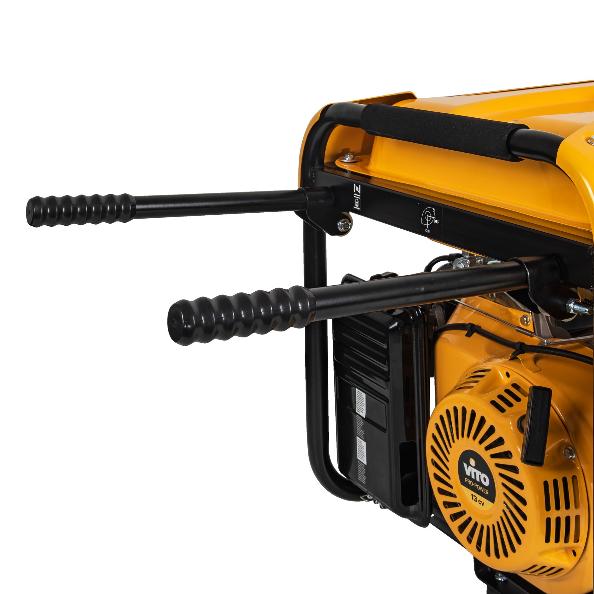 Gerador Trifásico com potência máxima de 8kVA com Rodas e Pega, com uma potência do motor de 15hp, cilindrada de 420cc, tem uma velocidade de rotação em vazio de 3000rpm, combustível Gasolina 95, capacidade do depósito de combustível 25L, com autonomia para 8h, facilitando a execução de todas as suas tarefas.