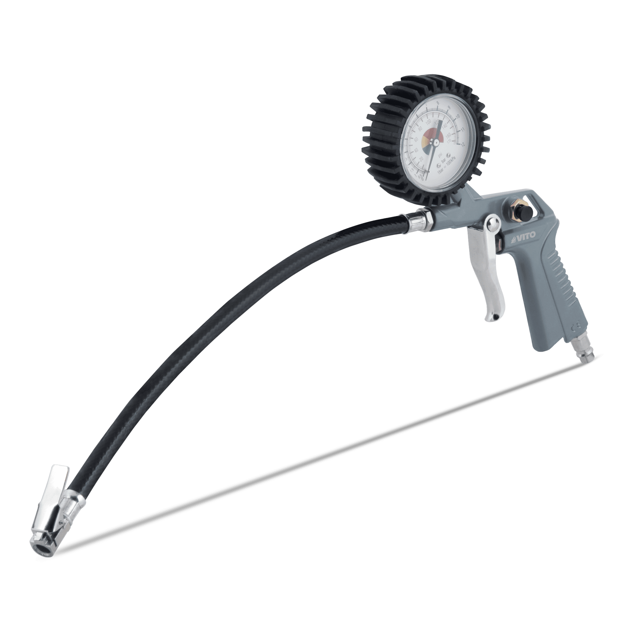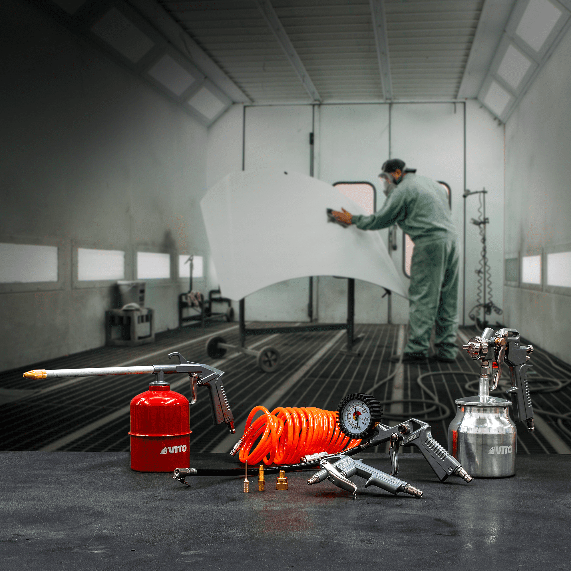 Pistola de lavagem > Capacidade do copo: 1000ml > Pressão de ar recomendada: 8 bar > Adequada para pulverizar óleo leve e produtos de limpeza. Pistola de pintura > Capacidade do copo: 750ml > Pressão de ar recomendada: 3 bar > Adequada para aplicação de vernizes e tintas. Pistola de sopro > Pressão de ar recomendada: 8 bar > Adequada para limpeza de áreas de trabalho, por exemplo: poeiras. Mangueira espiral > Pressão de ar recomendada: 8 bar > Flexível > Comprimento: 5m Pistola de enchimento com manómetro > Pressão de ar recomendada: 8 bar > Adequada para medir/encher a pressão de ar nos pneus. Acessórios de enchimento > Pressão de ar recomendada: 8 bar > Acessório complementar da pistola de enchimento para objetos de insuflar