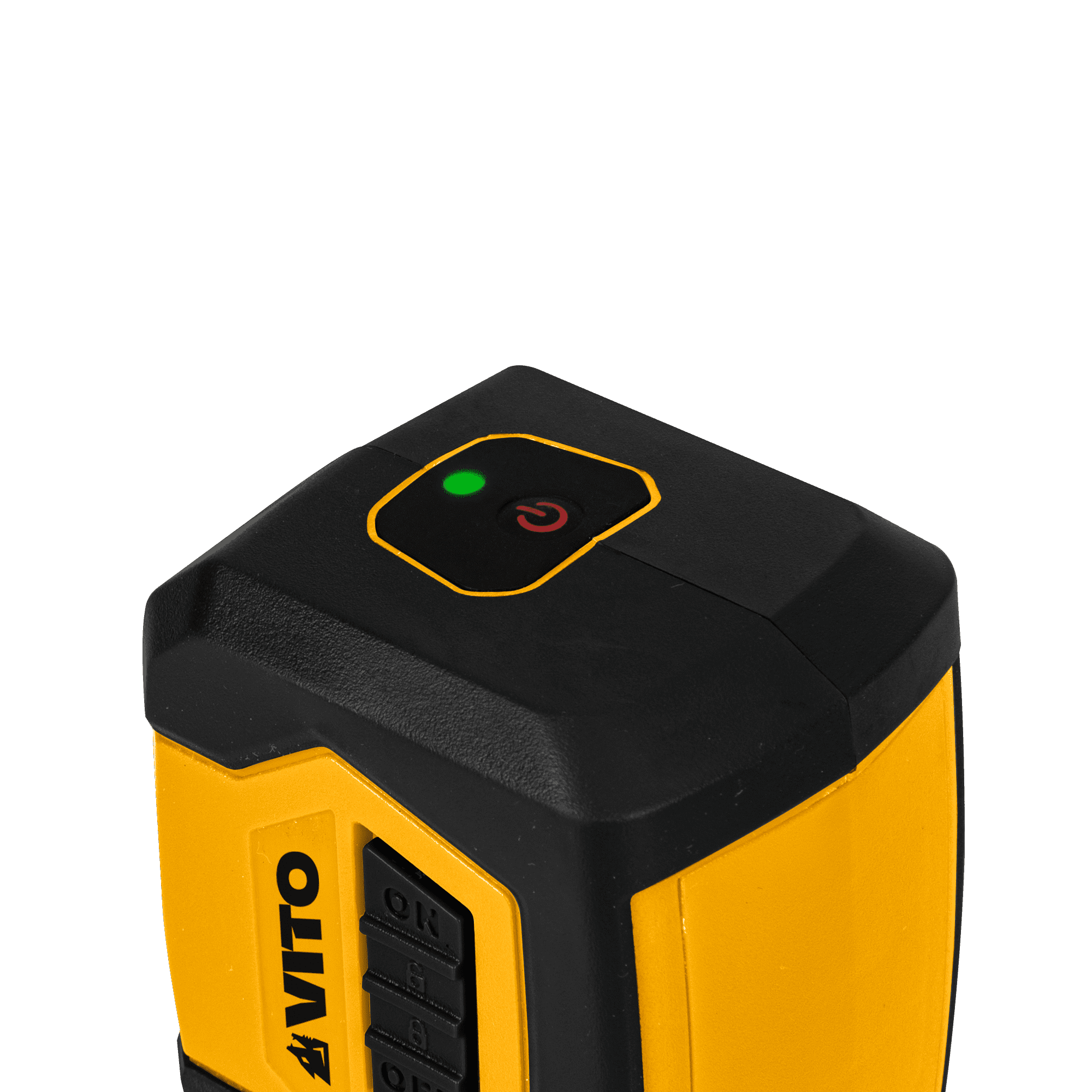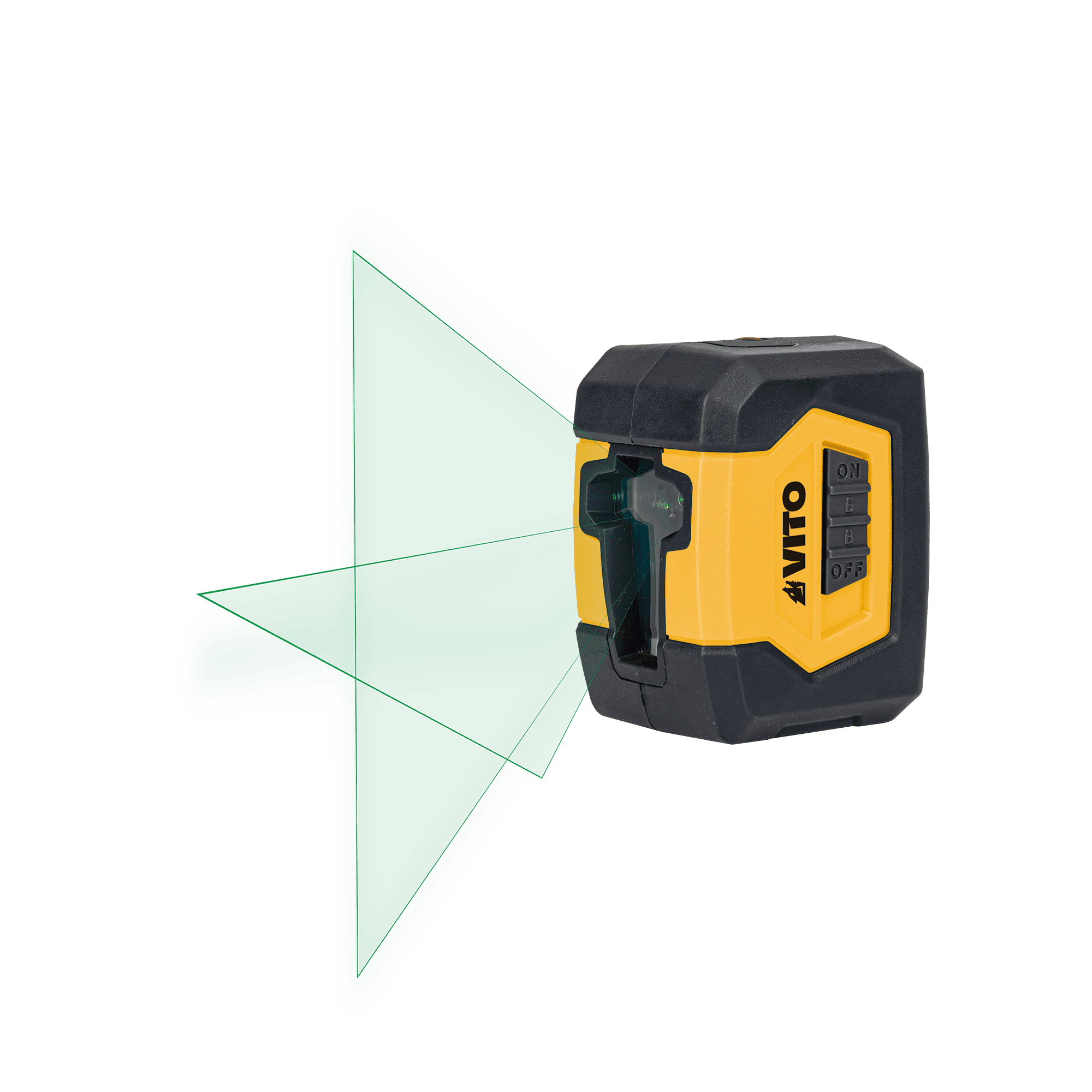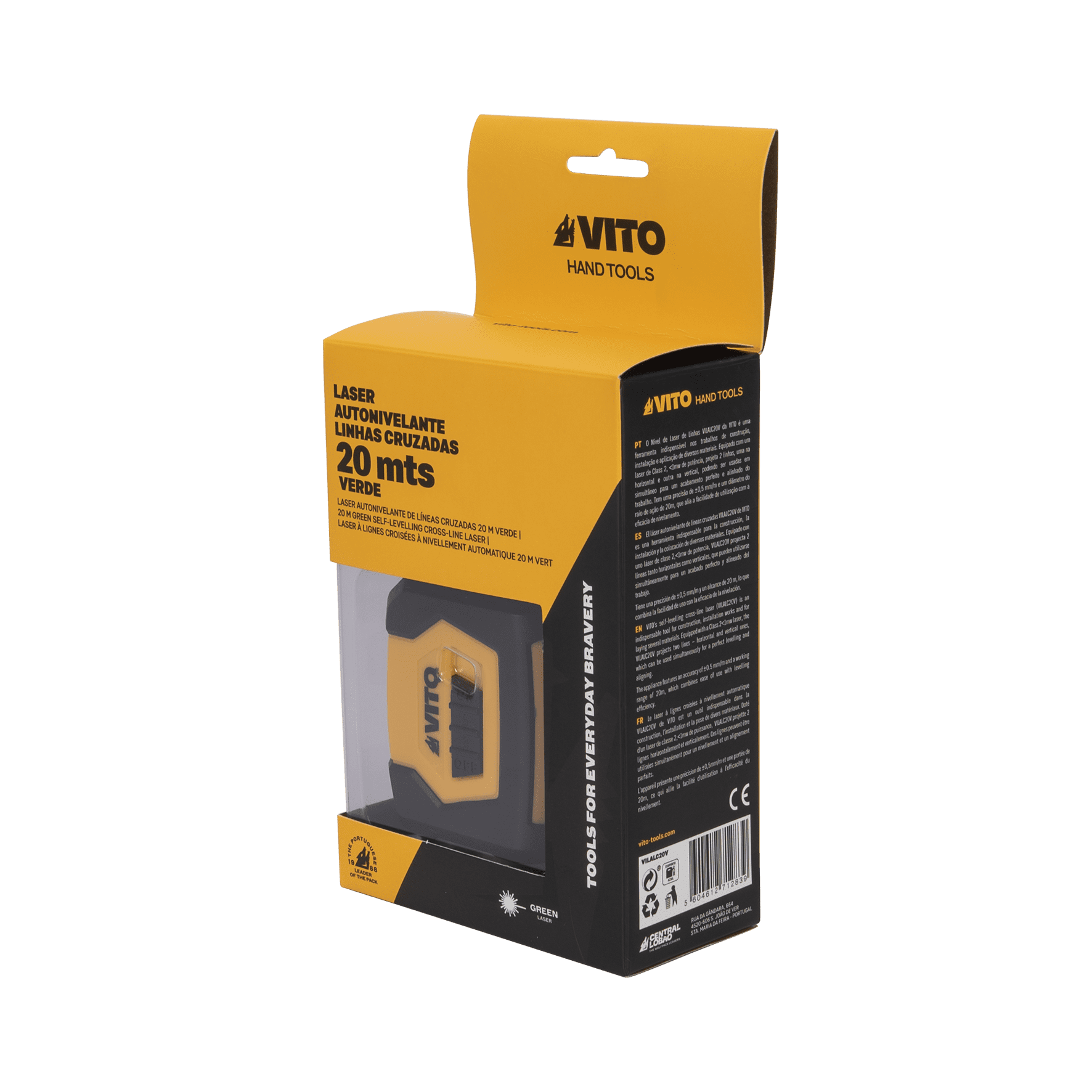 O Laser Autonivelante de Linhas Cruzadas VITO projeta 2 linhas com luz verde, uma horizontal e outra vertical, podendo ser usadas em simultâneo ou alternadas de forma independente. Com um laser de Class2, <1 mw de potência, apresenta um diâmetro de raio de ação de 20 mts e uma precisão de +/- 0,5mm/m. Ferramenta indicada para nivelar superfícies interiores e exteriores desde paredes, pisos, tetos, entre outras. Equipado com 2 pilhas alcalinas de 1,5 (AA) e uma autonomia de 3 horas, tem ainda uma rosca de fixação do tripé ¼.