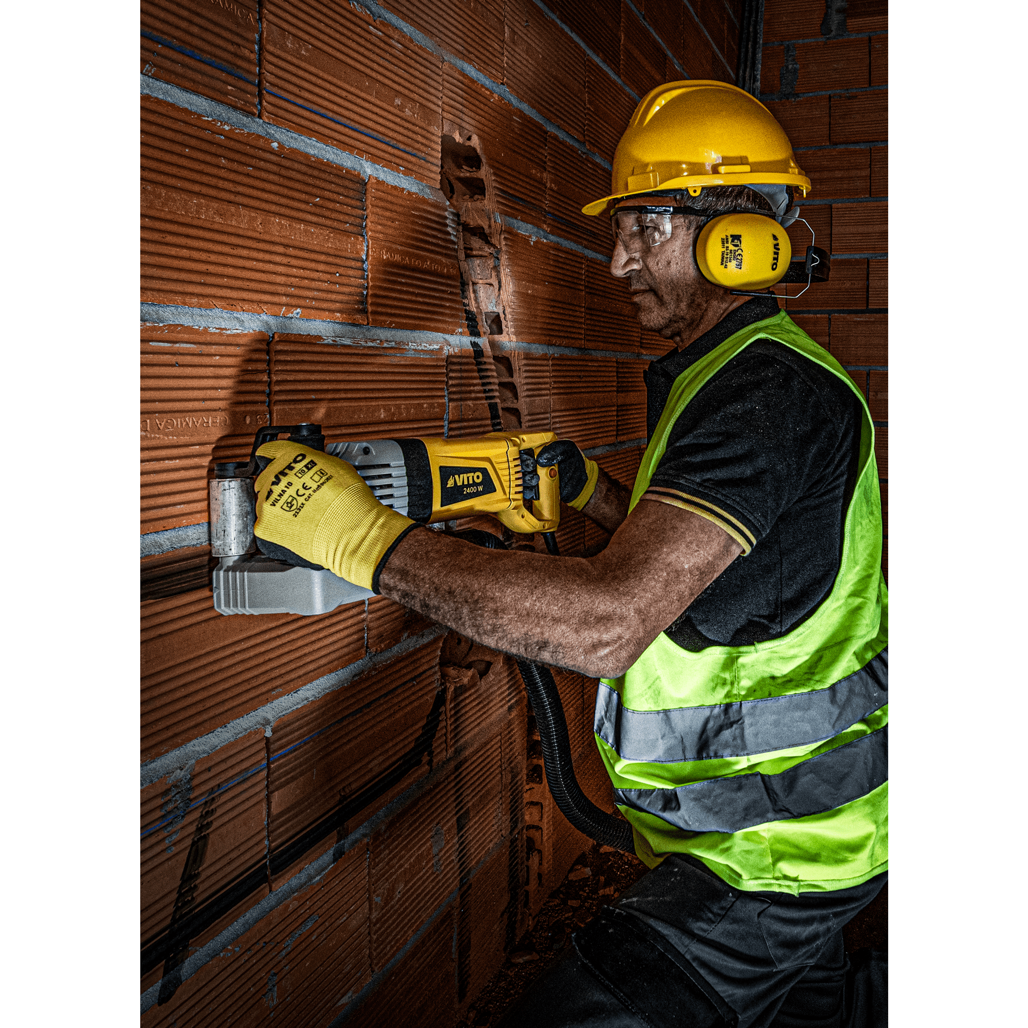 A máquina abre roços VITO de 2400W é a solução robusta e eficiente para trabalhos exigentes de corte em alvenaria, blocos de pedra, tijolos ou betão. Equipada com motor potente de 2400W e discos de 150 mm, permite cortes até 43 mm de profundidade e 28 mm de largura, ajustáveis com disco triplo ou discos paralelos. Conta com corpo metálico de engrenagens para maior durabilidade, apoios estabilizadores que garantem precisão e botão de segurança para maior controlo durante a utilização. Inclui caixa de transporte, saída de aspiração, mangueira para ligação a aspirador e saco coletor de detritos, assegurando um trabalho mais limpo e prático.