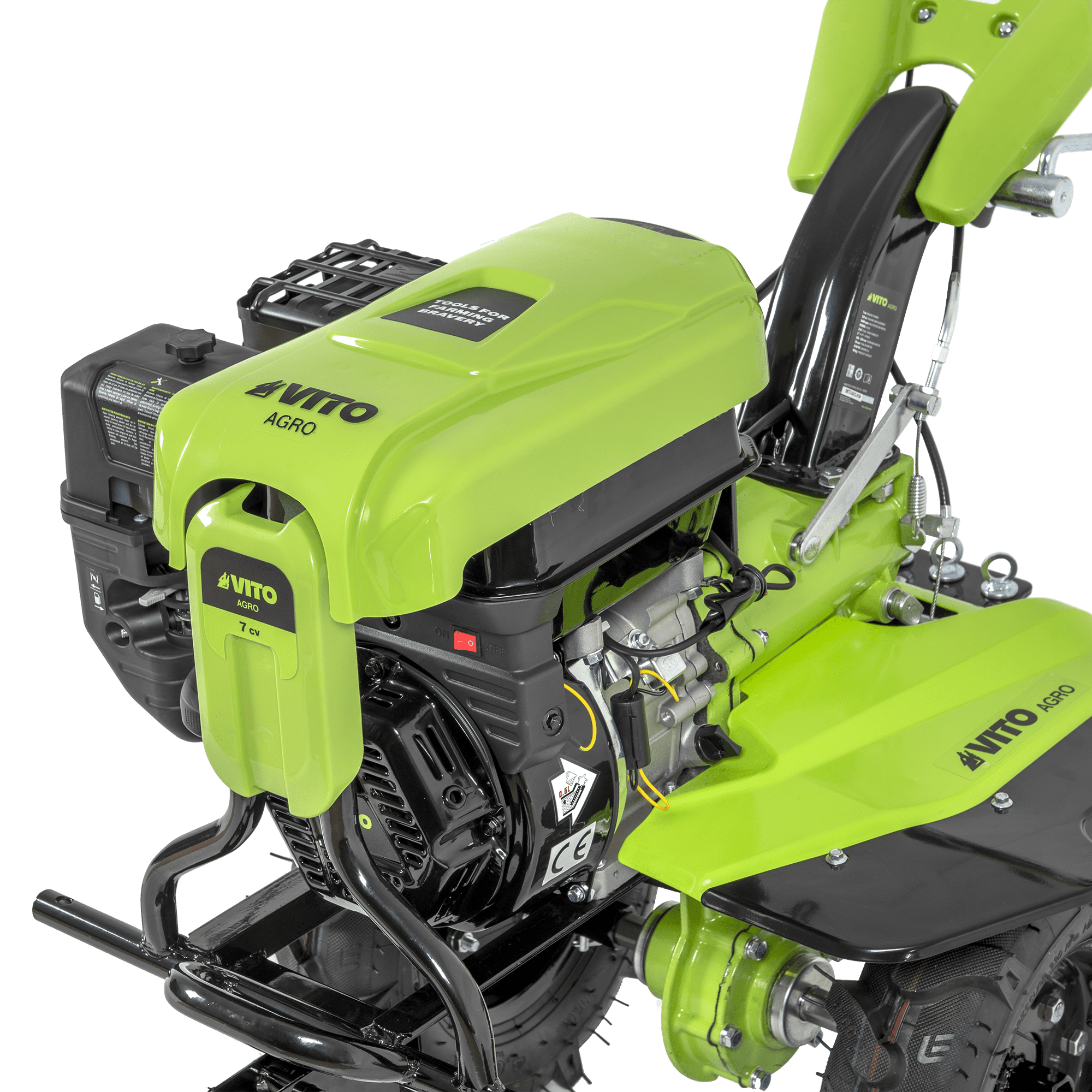 A motoenxada a gasolina de transmissão direta VITO VIMETD7A foi projetada para responder às necessidades dos agricultores e jardineiros que procuram uma máquina eficiente, resistente e de fácil manobrabilidade. Com um motor a 4 tempos de 212cc e potência de 7cv (5,2kW), oferece uma largura de trabalho ajustável entre 1050 e 1200mm, sendo ideal para preparação de pequenos a médios terrenos agrícolas. Equipada com 3 velocidades (2 para a frente e 1 para trás), esta motoenxada conta ainda com um filtro com óleo, sensor de nível de óleo e sistema de ajuste rápido da roda frontal. A profundidade de fresagem pode ser regulada com precisão, adaptando-se a diferentes tipos de solo. O seu robusto sistema de transmissão direta proporciona tração eficiente e mínima manutenção.