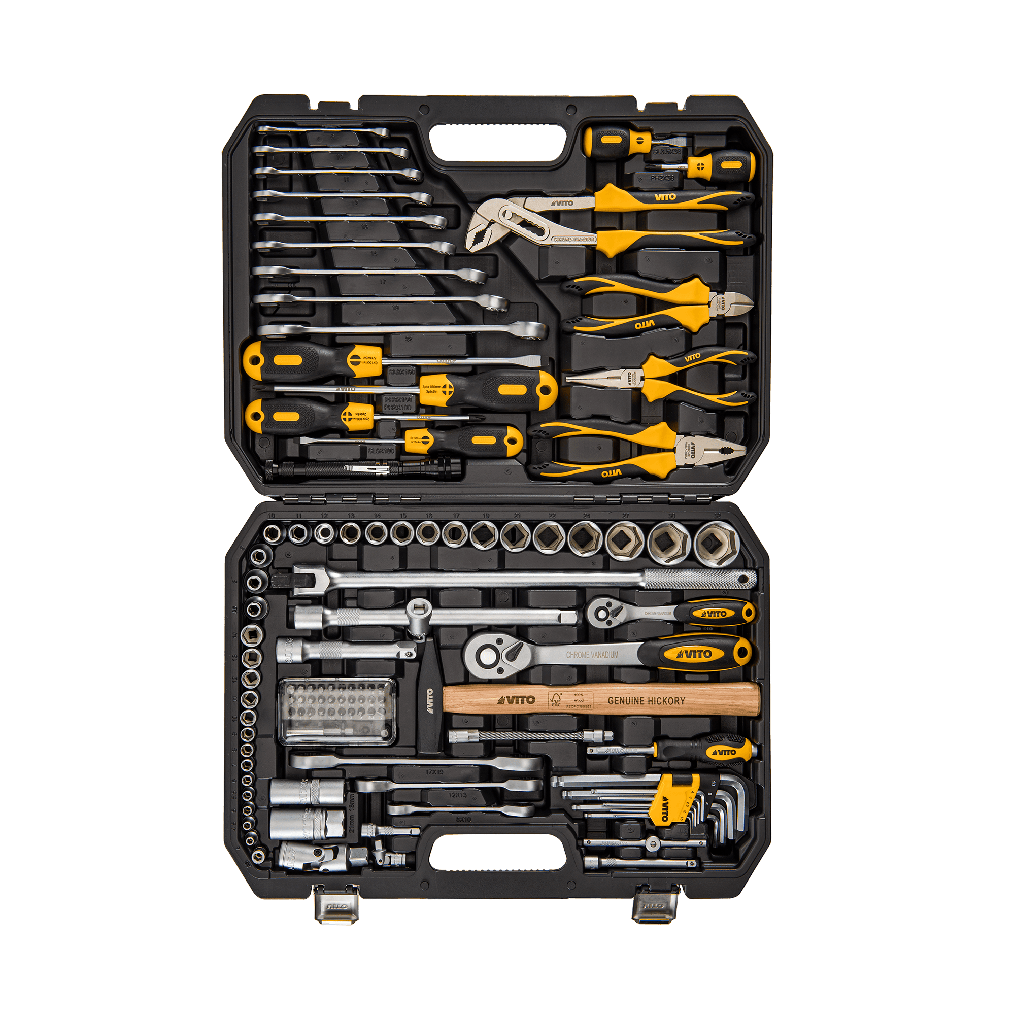 Este conjunto apresenta uma seleção equilibrada de ferramentas manuais, incluindo uma lanterna extensível magnética, um martelo, e uma variedade de chaves, alicates e bits. Todas estas peças foram integradas, de modo a responderem a diferentes necessidades de construção, manutenção, montagem e reparação. Equipada com fechos metálicos, a mala BMC permite guardar e transportar as ferramentas em segurança e com maior comodidade, seja em contextos domésticos ou profissionais.