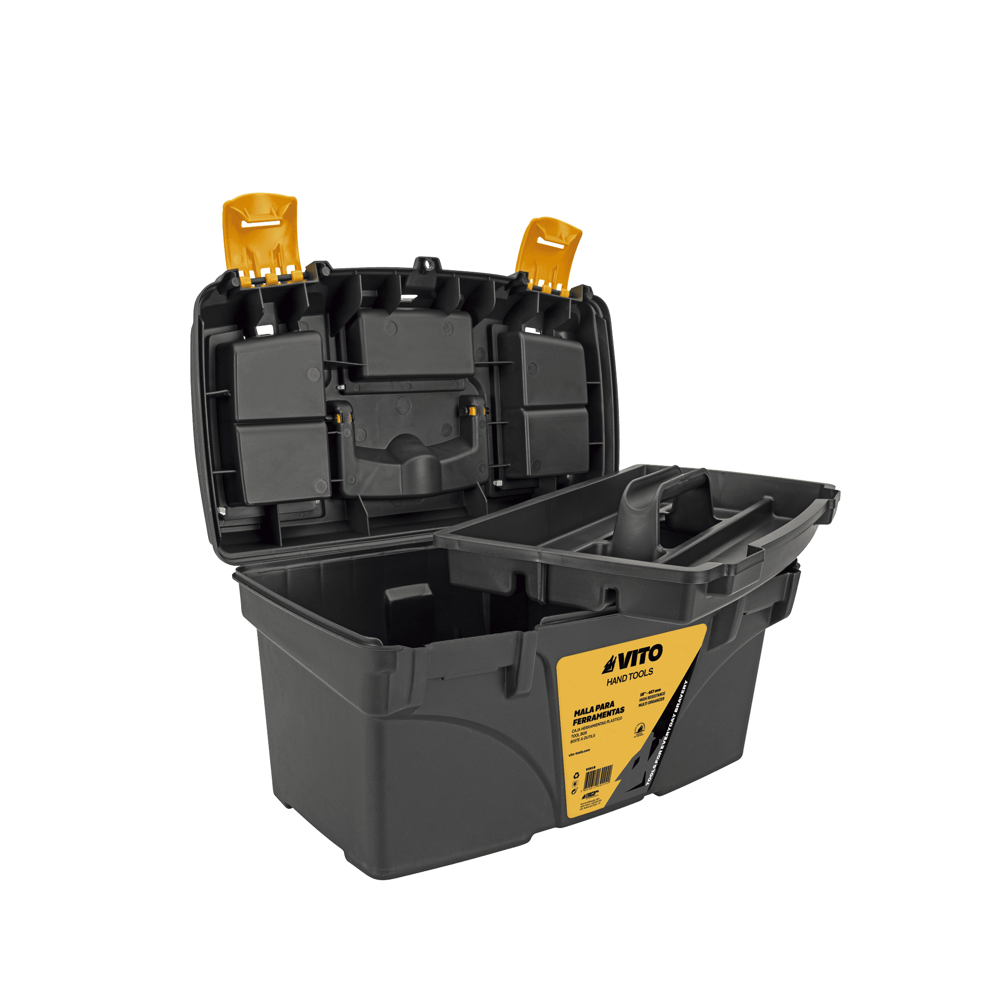Mala para ferramentas fabricada em material plástico resistente, desenvolvida para o armazenamento, transporte e organização de ferramentas manuais e respetivos acessórios. A construção robusta permite utilização em ambientes profissionais, garantindo proteção adequada do conteúdo.