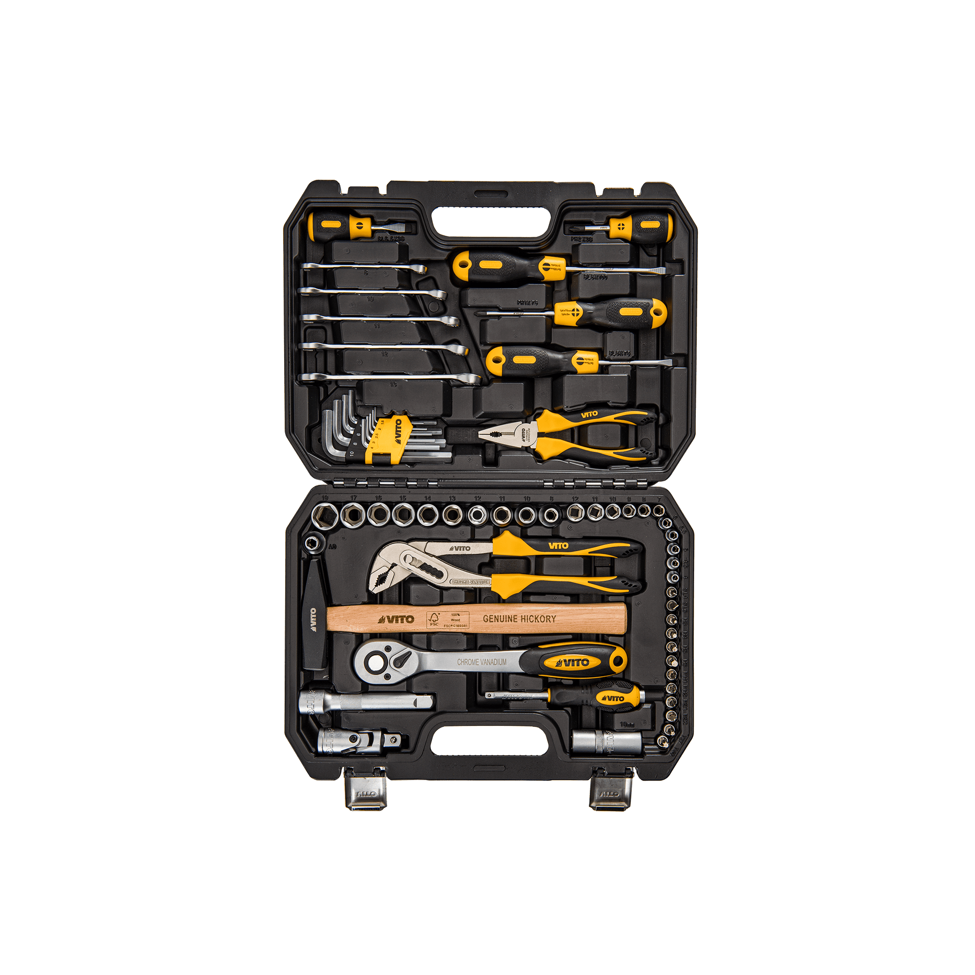 Este conjunto apresenta uma seleção equilibrada de ferramentas manuais, incluindo um martelo, chaves de caixa, chaves de fenda, alicates e bits, todas elas pensadas para responder a diferentes necessidades de construção, manutenção, montagem e reparação. Equipada com fechos metálicos, a mala BMC permite guardar e transportar as ferramentas em segurança e com maior comodidade, seja em contextos domésticos ou profissionais.