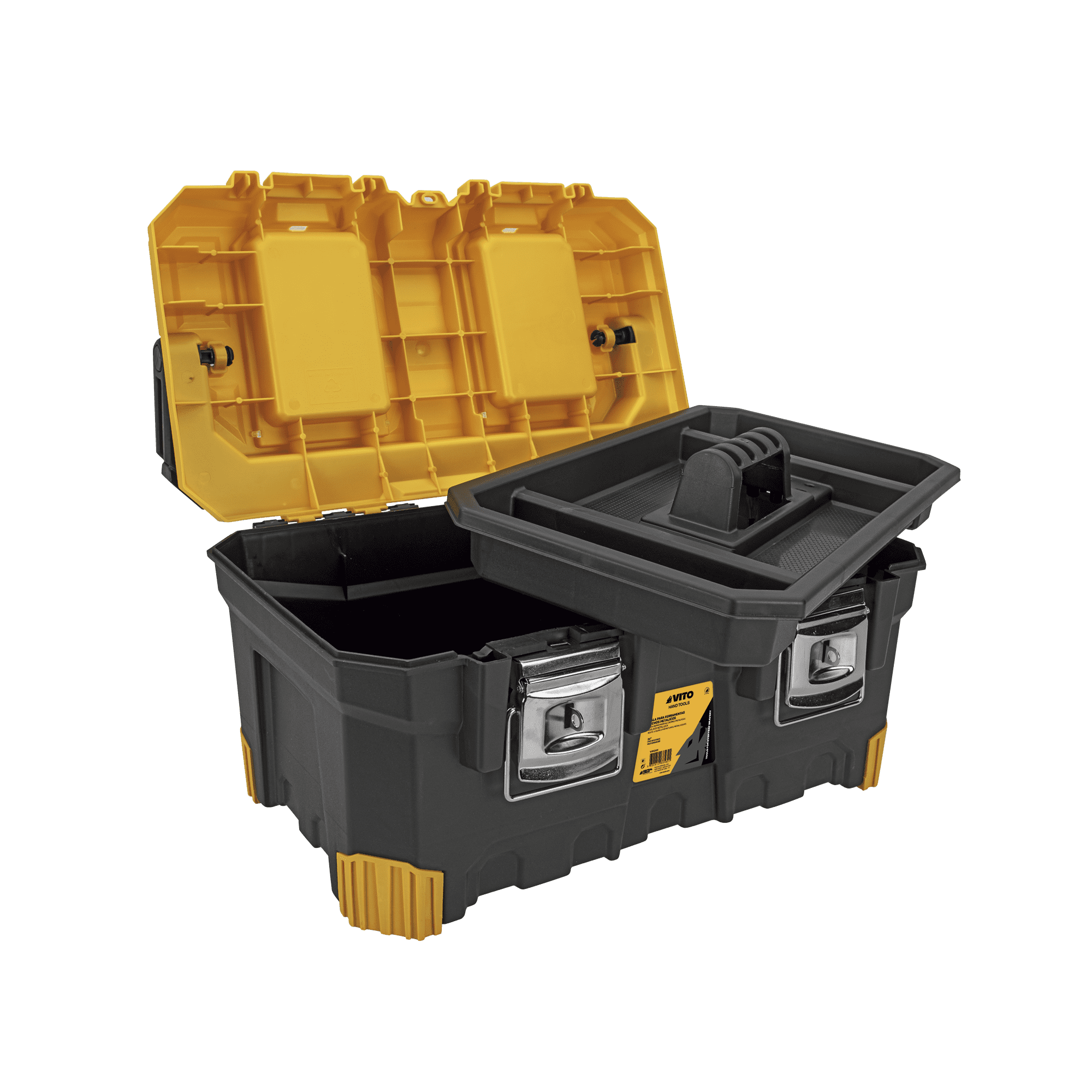 Mala para Ferramentas com pega retráctil, contém fechos metálicos resistentes, possuí um tabuleiro para ferramenta amovível, contém tampa com 3 compartimentos, tem ainda um fecho por cadeado (não incluido).