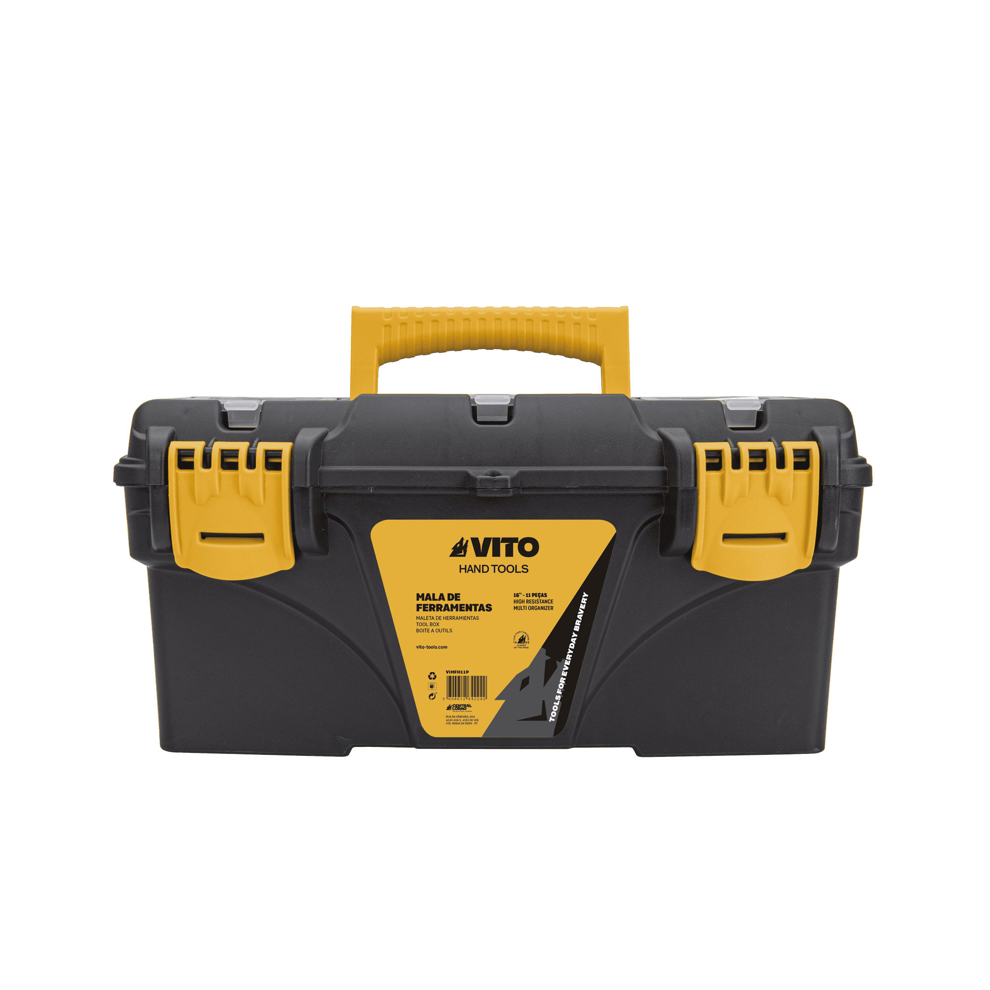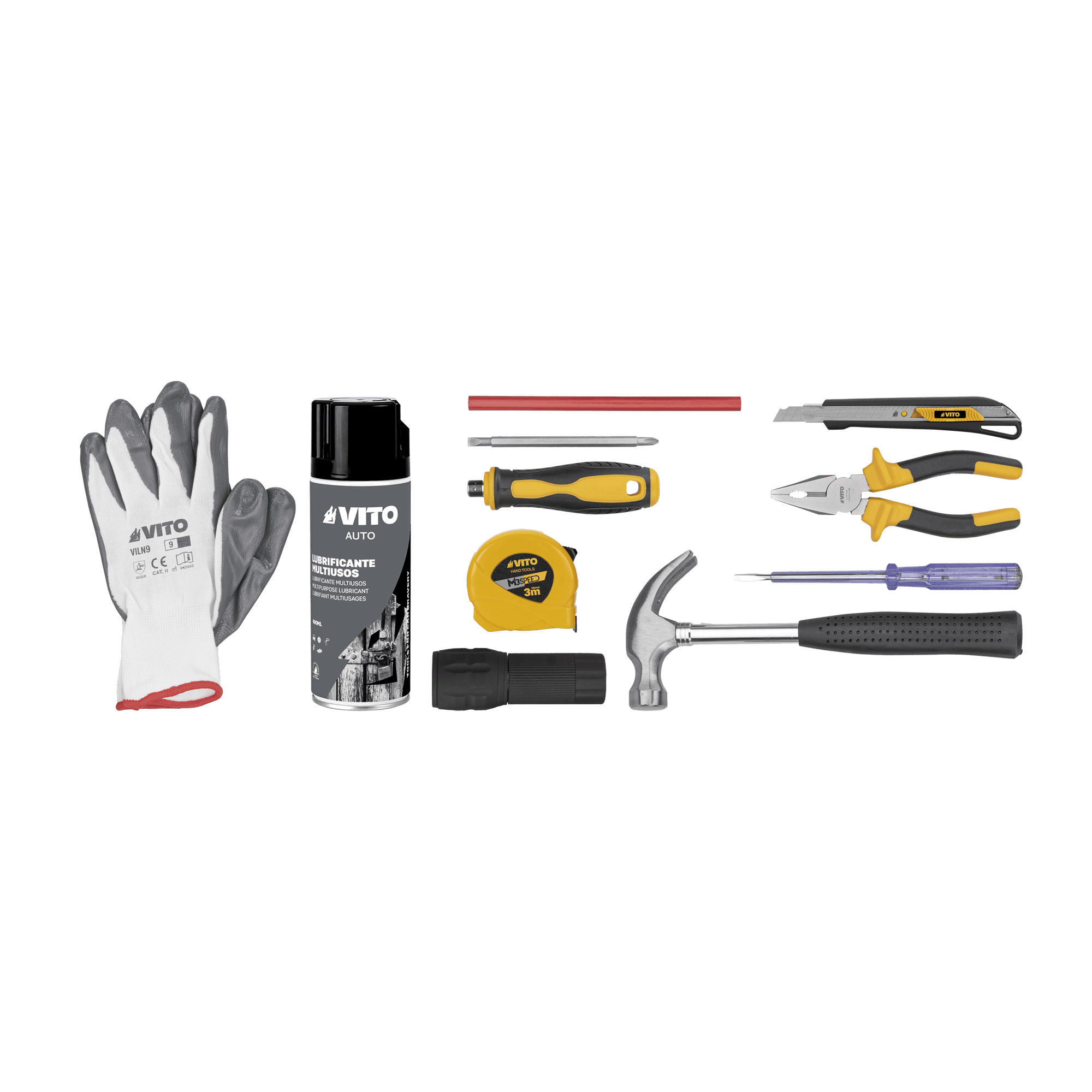 Mala de Ferramentas Home com 11 peças, 1 mala para ferramentas 16", 1 lanterna, 1 fita métrica, 1 chave combinada, 1 lubrificante multiusos, 1 luva nitrílica, 1 martelo, 1 alicate, 1 cortador com lâminas, 1 lápis e 1 busca-pólos.